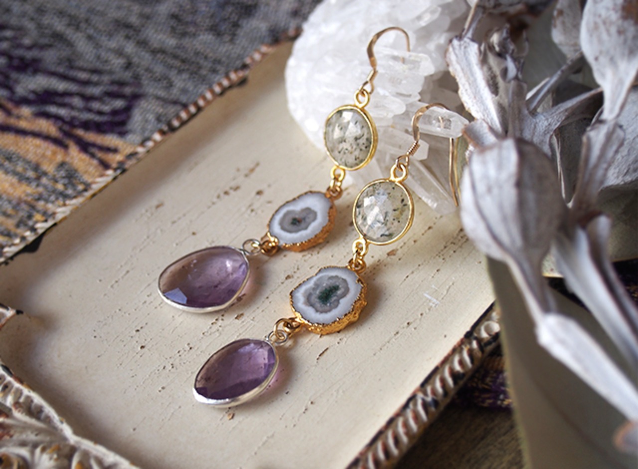 素材:エピドートインクォーツ・スタラクタイト・アメジスト・シルバー(石枠/ゴールドプレート)・K14ゴールドフィルド(ピアス金具)
