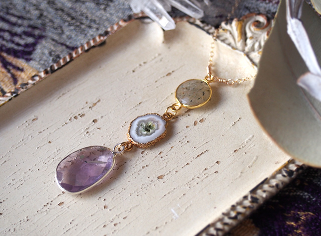透明なライラック色が優しいアメジスト、花のように結晶が広がるスタラクタイト、植物のような内包物が浮かぶエピドートインクォーツ。
