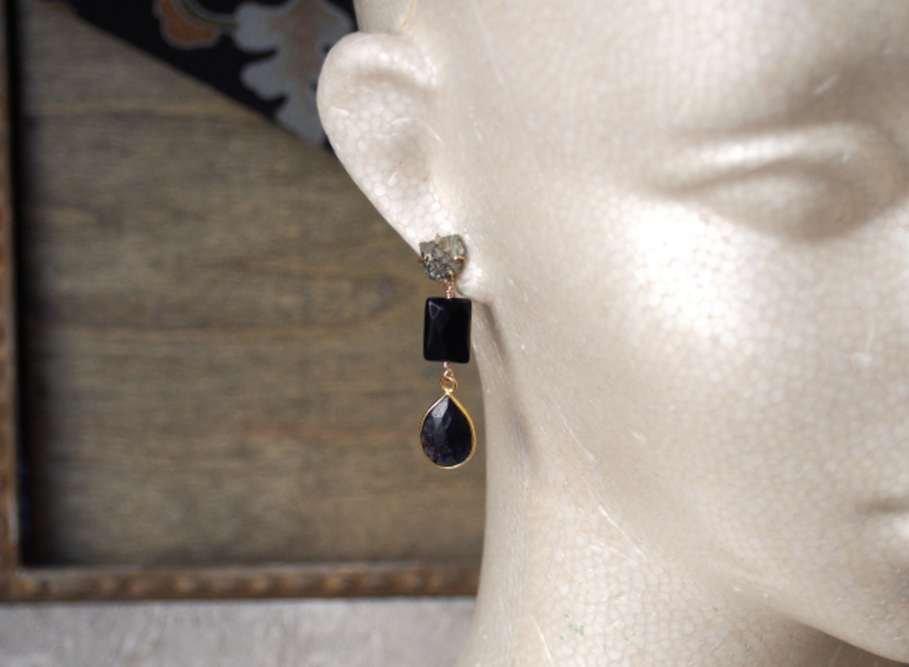 素材:パイライト・オニキス・サファイア・シルバー(石枠/ゴールドプレート)・K14ゴールドフィルド(ピアス金具)