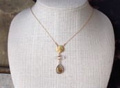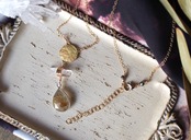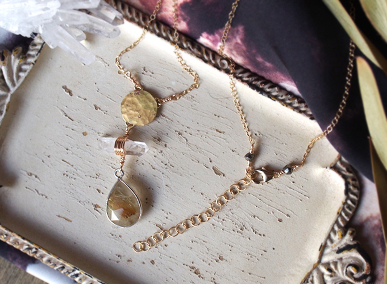 金の針が美しいルチルクォーツと結晶の形そのままのクォーツを、真鍮のワンポイントに合わせたネックレス。