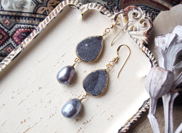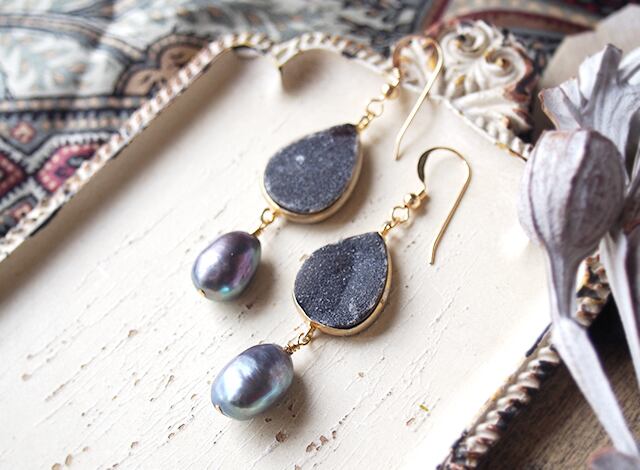 ドゥルージークォーツとブラックパールのピアス