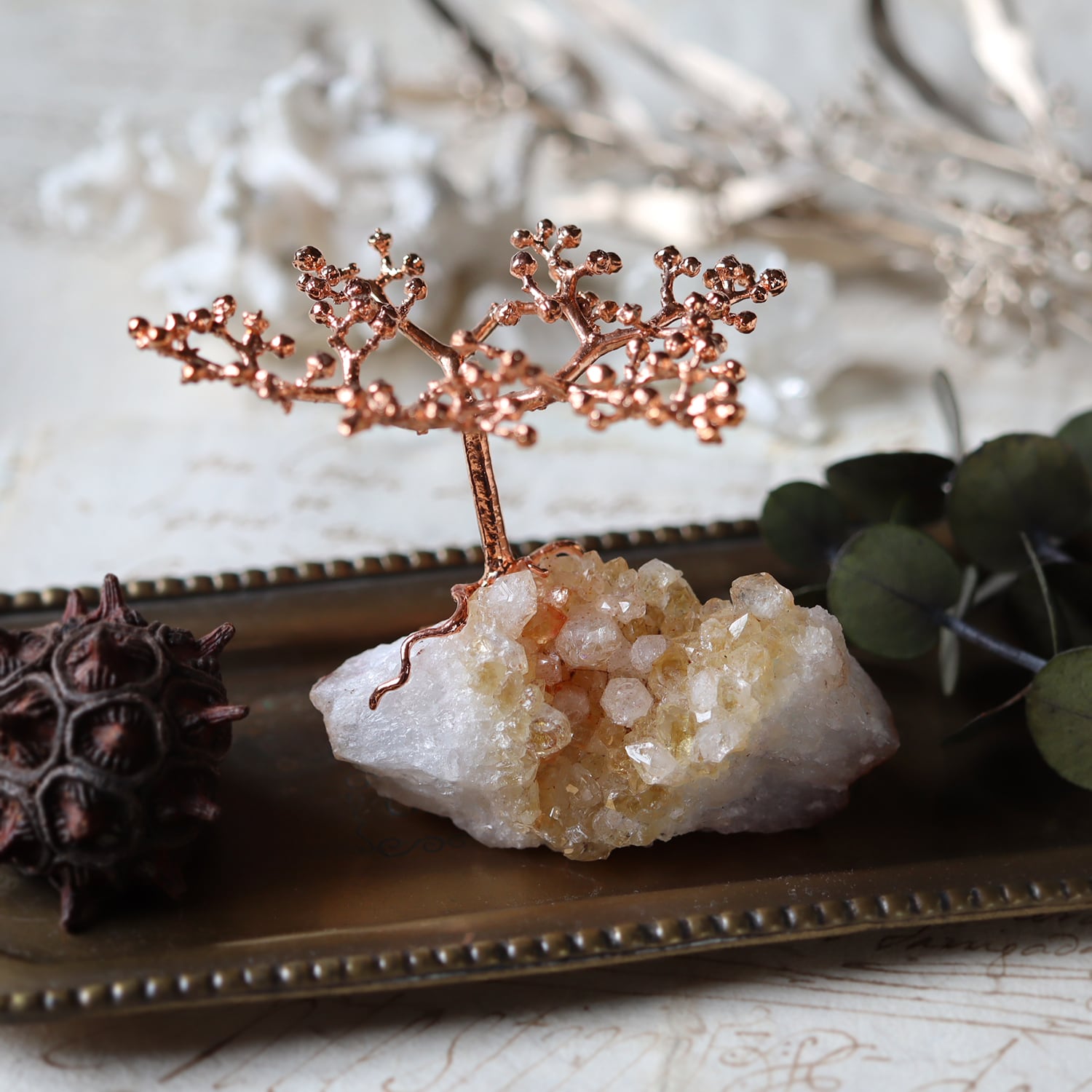 その名の通り、つるを伸ばして他の植物に絡みつき、藪を覆って枯らしてしまう程の繁殖力を持つ雑草。使用したのはつぼみの状態で、平らな集散花序は毛細血管や川が枝分かれしていく様子にも相似して美しい造形。シトリンの結晶の隙間に着生し、根っこで養分を吸い上げながら花を咲かせようとする様子のオブジェです。