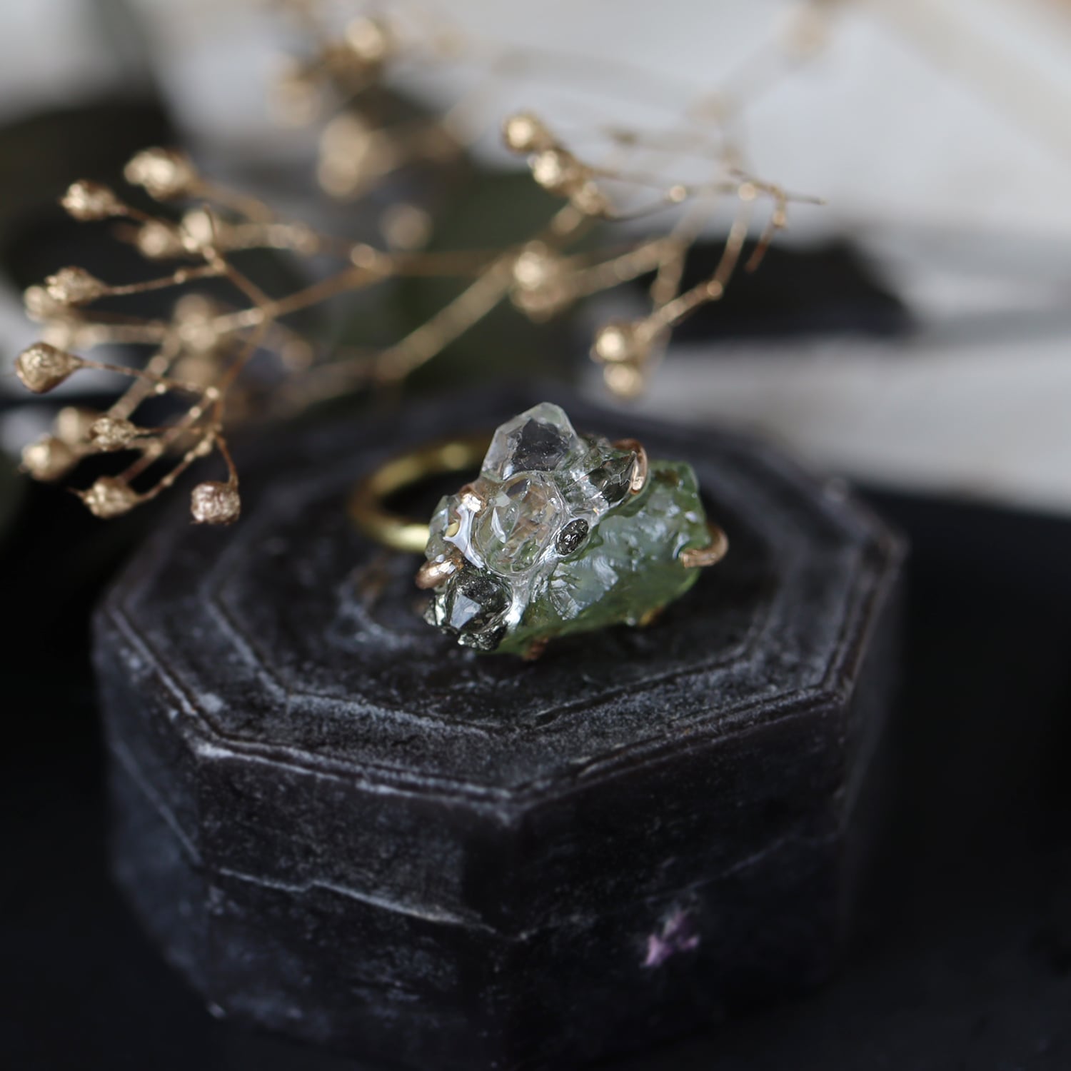 金色の爪で有機的に石を留めることで、光を最大限取り込み耳元できらきらと輝きます。地球が生み出す芸術品のような原石を、ファッションとして楽しめるアイテムです。