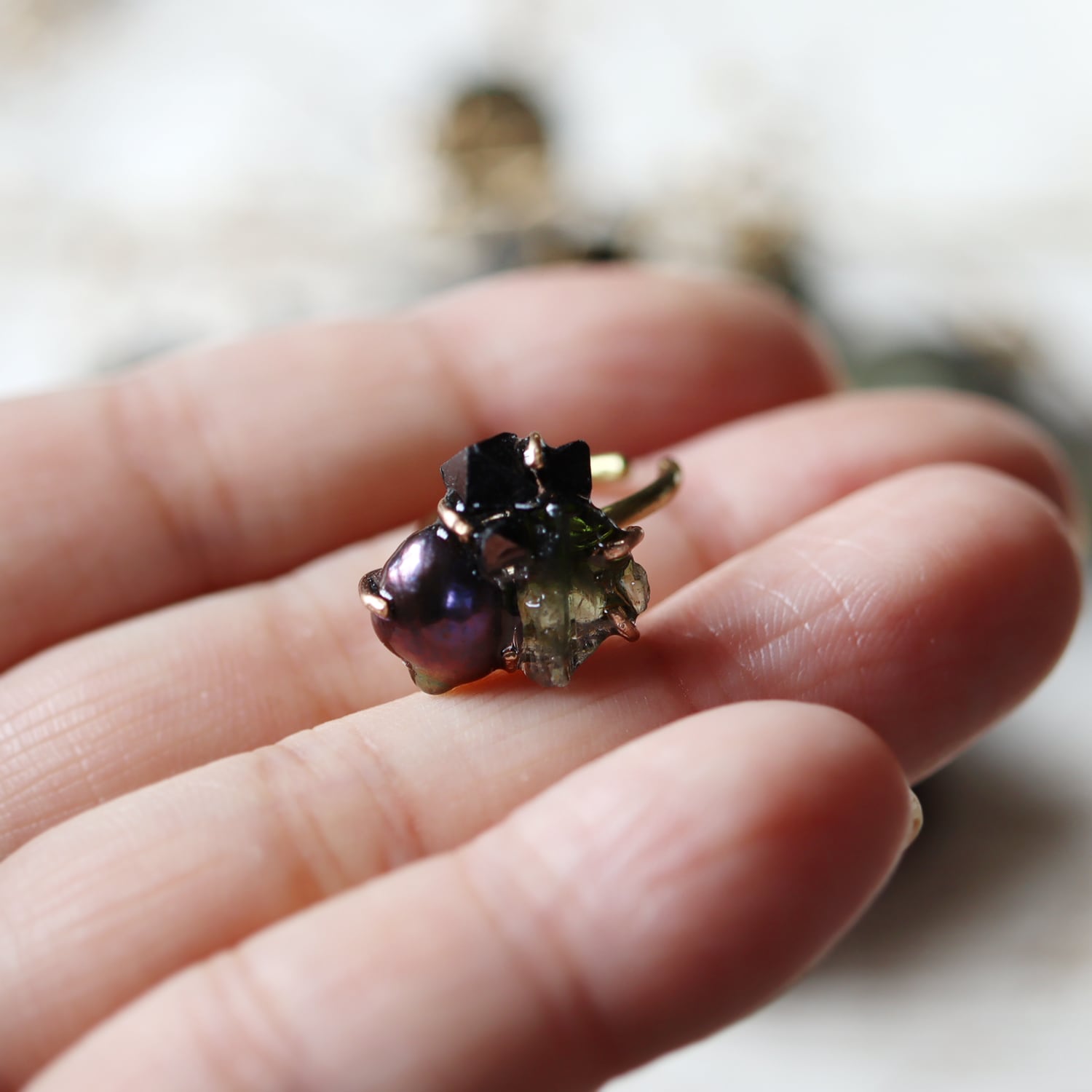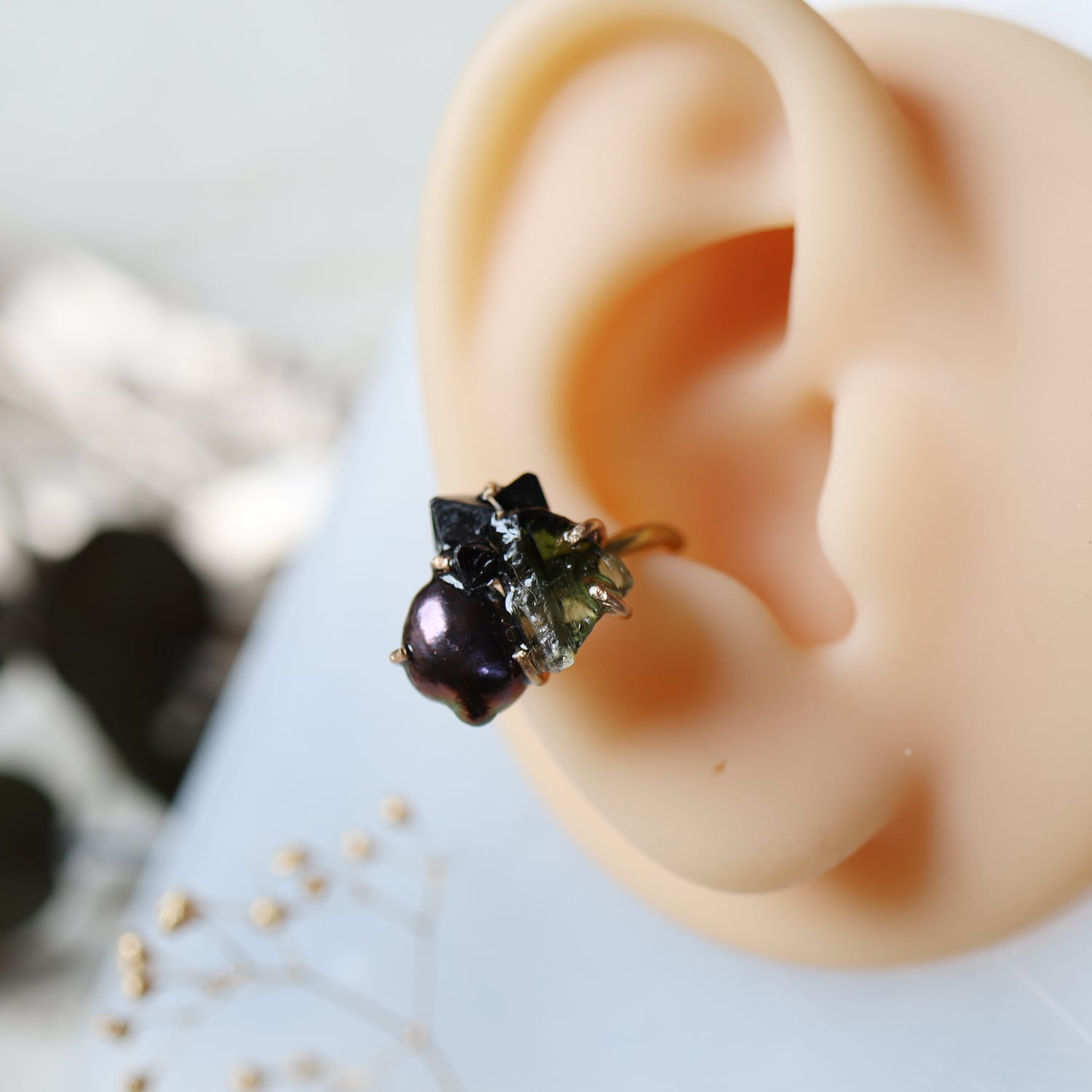素材:トルマリン(ナイジェリア産)・パール・マグネタイト(パキスタン産)・K14ゴールドフィルド(爪)・真鍮(イヤーカフ)