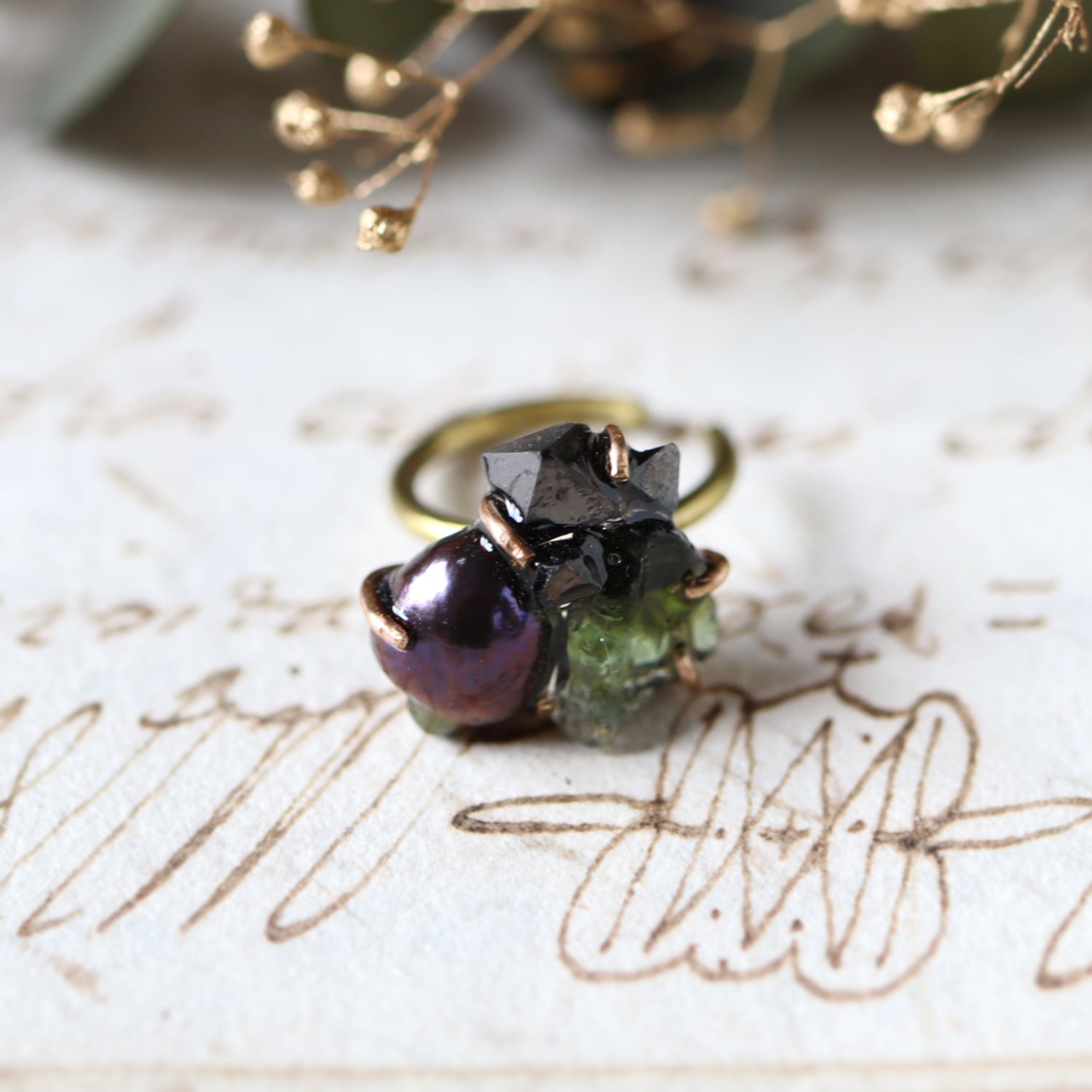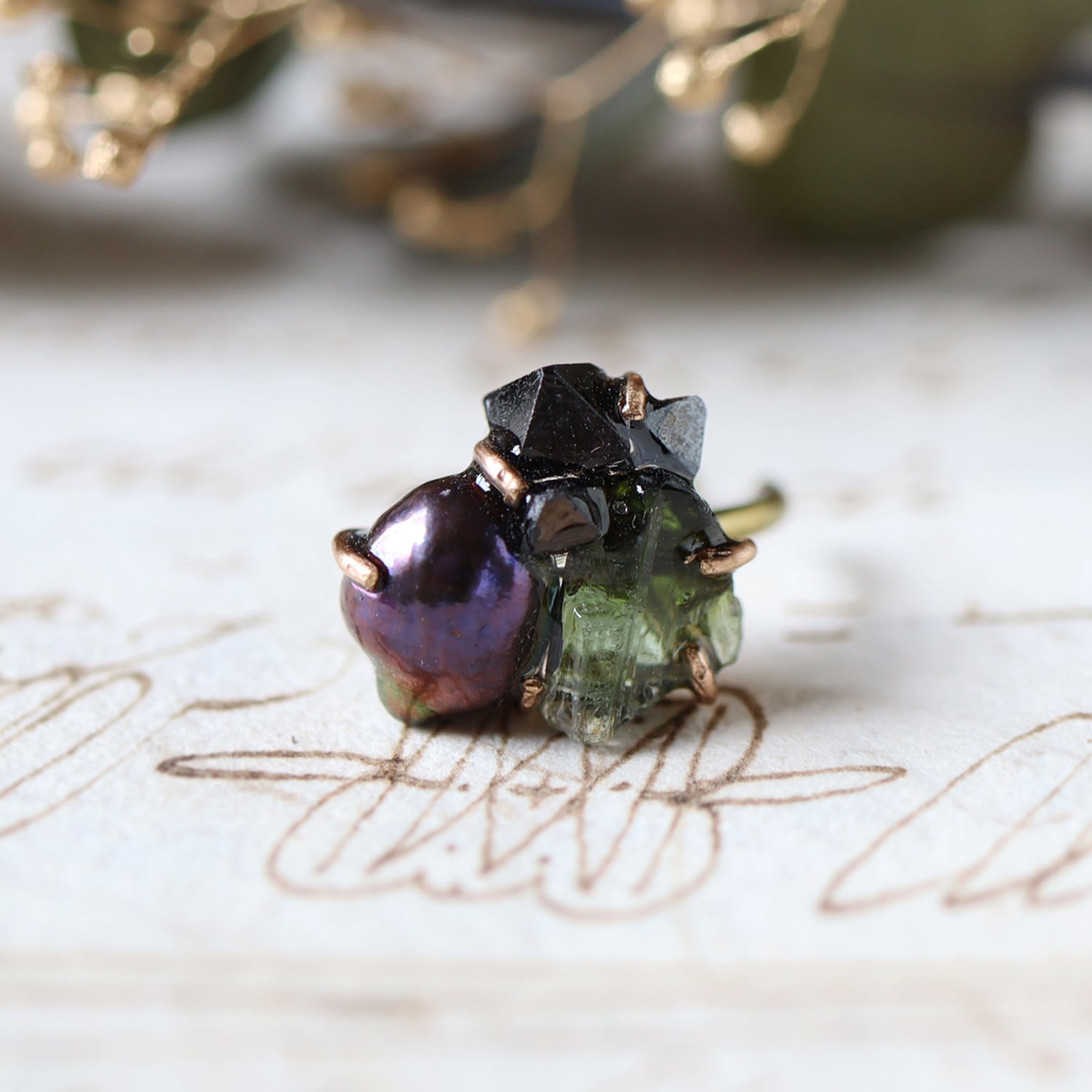 グリーントルマリン、マグネタイト、パールが共生する創造上の鉱物「Unionite」のイヤーカフ。深いグリーンのグラデーションが美しいトルマリン、金属光沢の正八面体が特徴的なマグネタイト、シックな艶が上品なパール。それぞれ表情の違う鉱物が共生し、ひとつの鉱物標本になったようなデザインです。