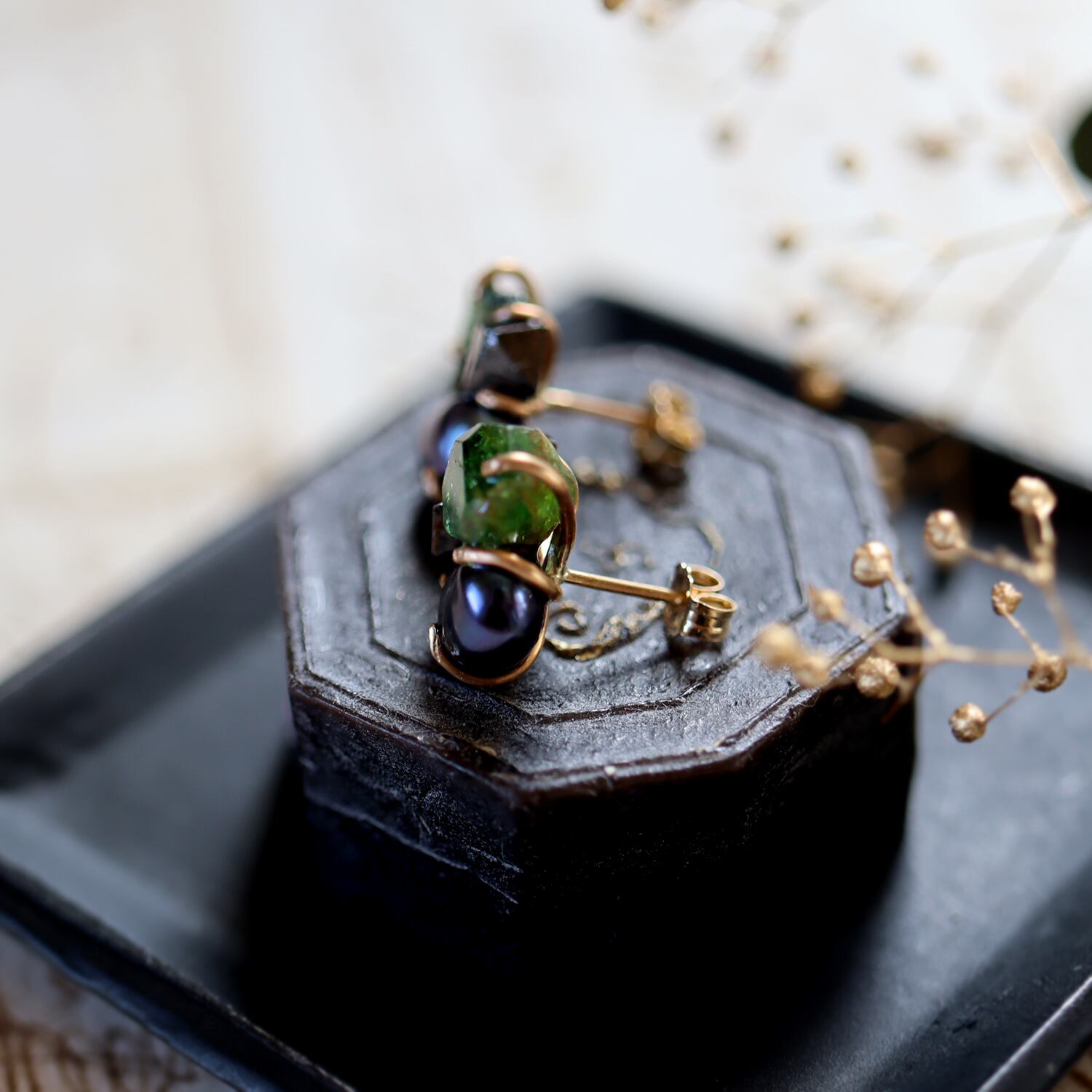 グリーントルマリン、マグネタイト、パールが共生する創造上の鉱物「Unionite」のピアス。深いグリーンの内側で光が揺れるようなトルマリン、金属光沢の正八面体が特徴的なマグネタイト、シックな艶が上品なパール。それぞれ表情の違う鉱物が共生し、ひとつの鉱物標本になったようなデザインです。