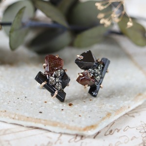 直線的な茶色の表面に虹色の光が浮かぶレインボーガーネット、ピラミッド型のマグネタイト、黒い柱状結晶のトルマリン、幾何学的な金属光沢のパイライト。それぞれ表情の違う鉱物が共生し、ひとつの鉱物標本になったようなデザインです。