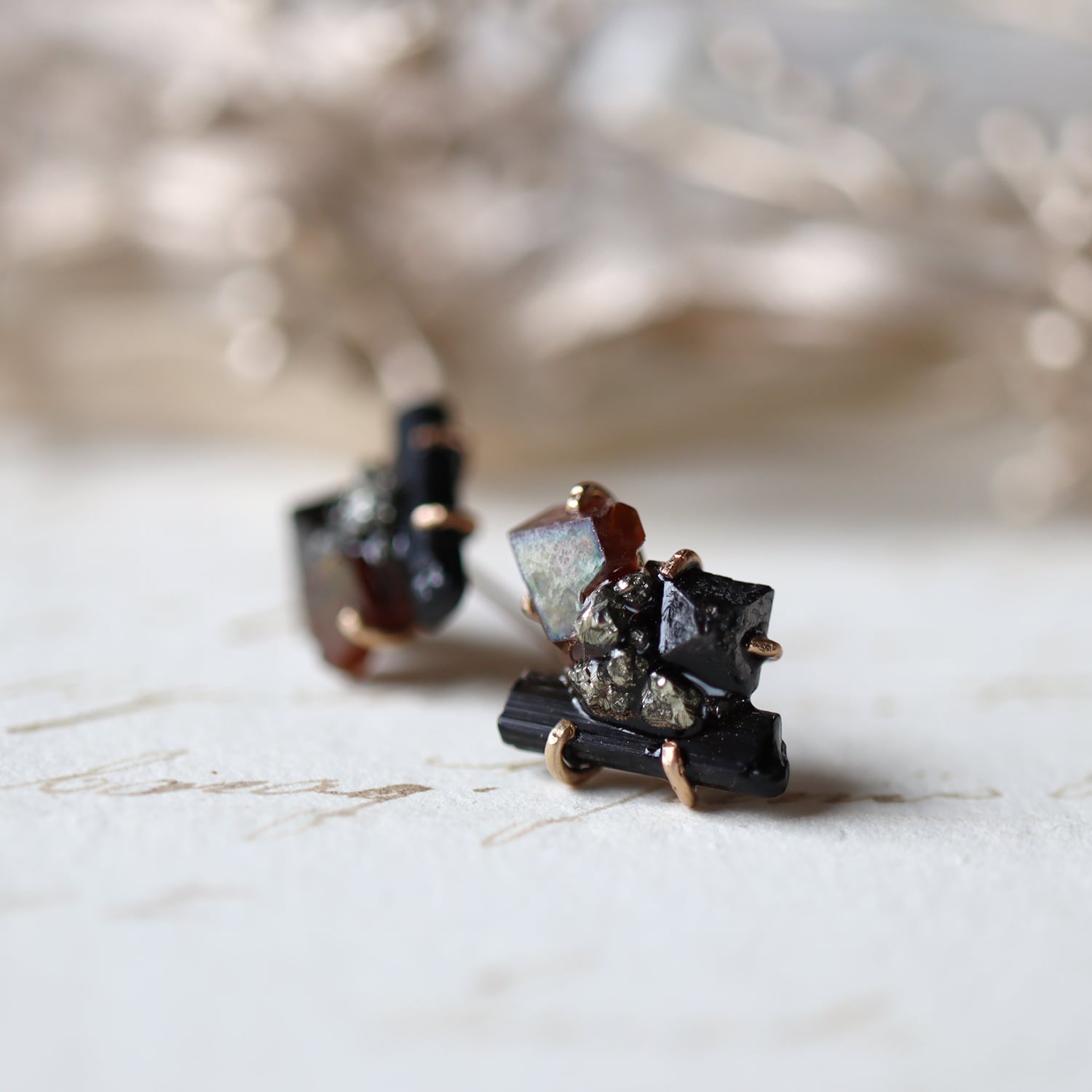 素材:レインボーガーネット(日本産奈良県天川村)・ブラックトルマリン(マダガスカル産)・マグネタイト(パキスタン産)・パイライト・K14ゴールドフィルド