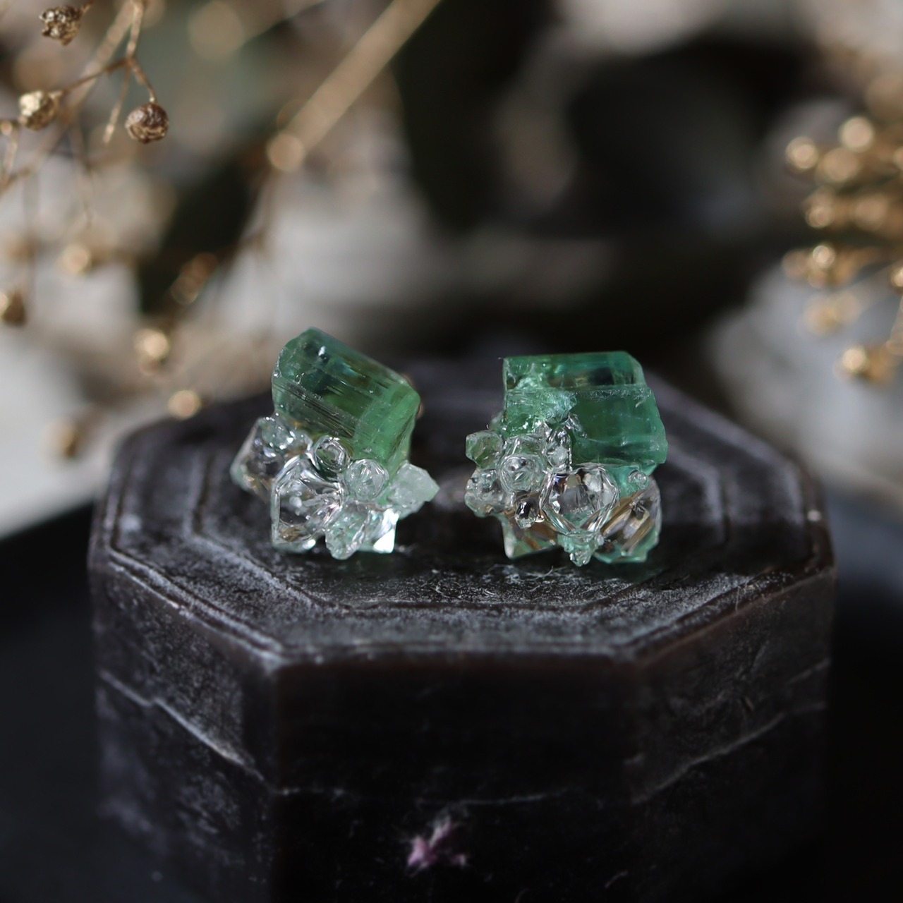 グリーントルマリンとダイヤモンドクォーツ、クォーツが共生し結晶化した、創造上の鉱物「Unionite」のピアス。
