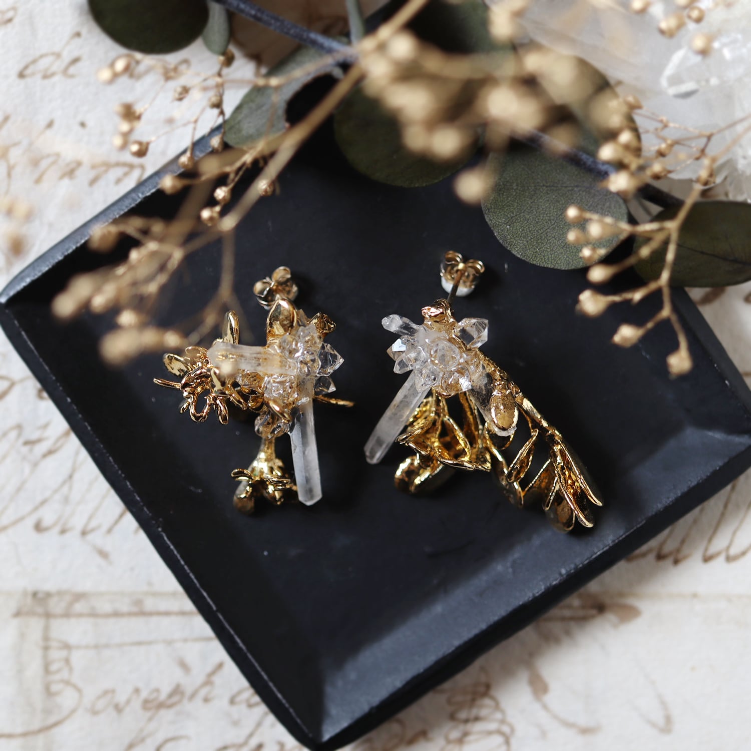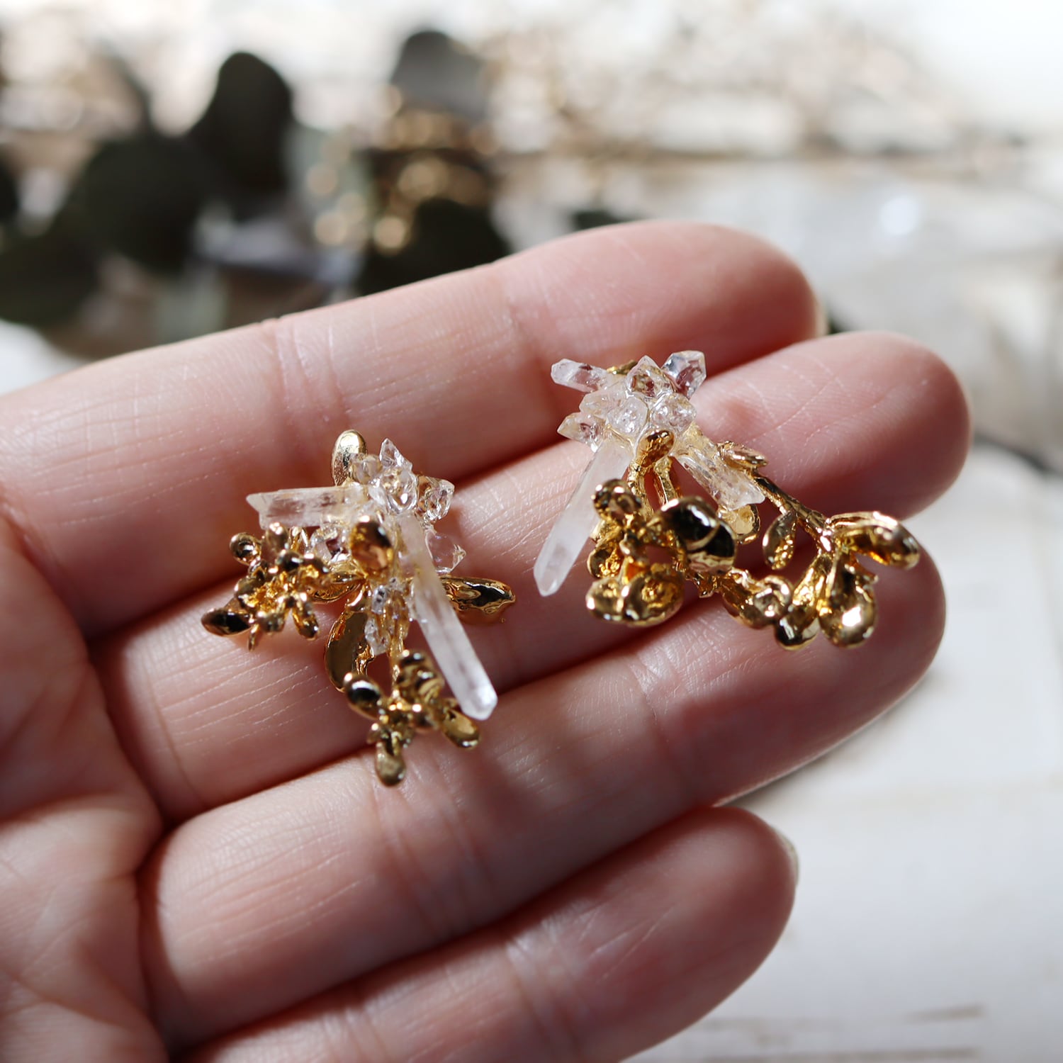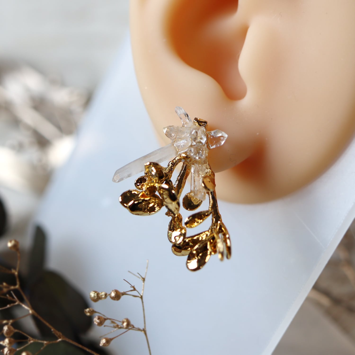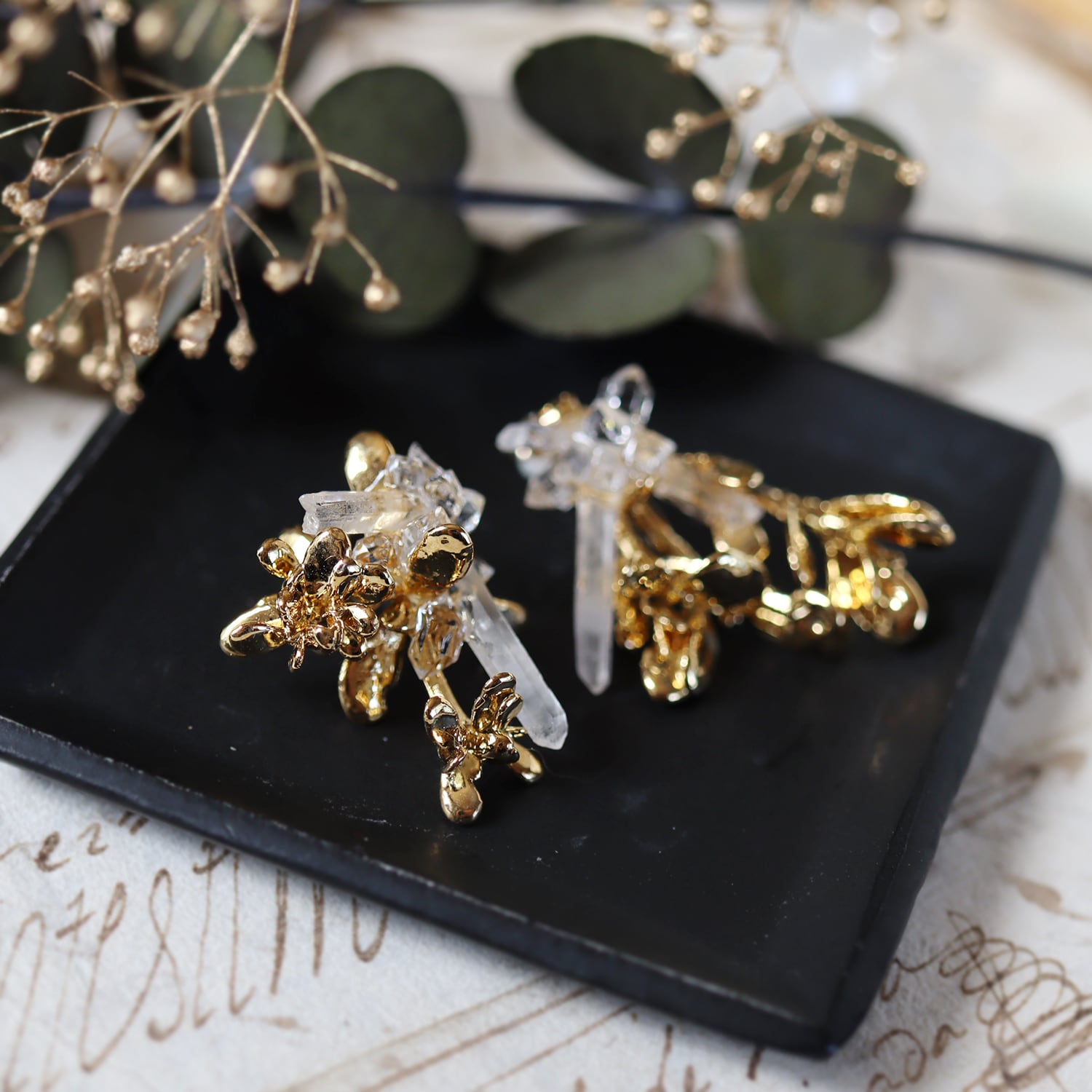金属化した本物の植物から、花開くように結晶したクォーツ。植物と鉱物のナチュラルな美しさがあなたを飾る、大ぶりなピアスです。
