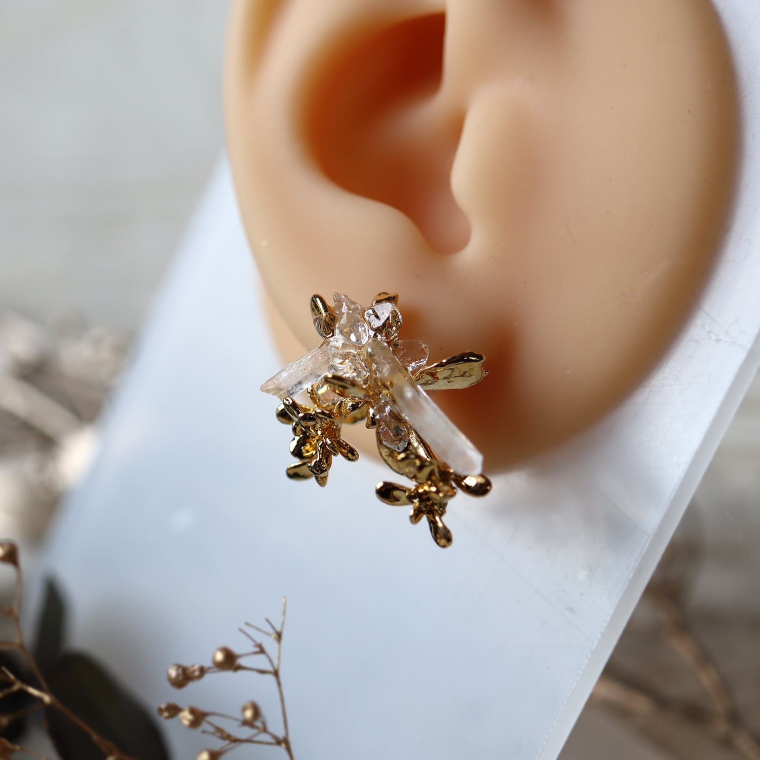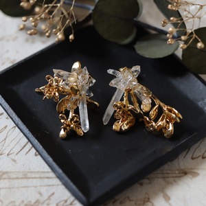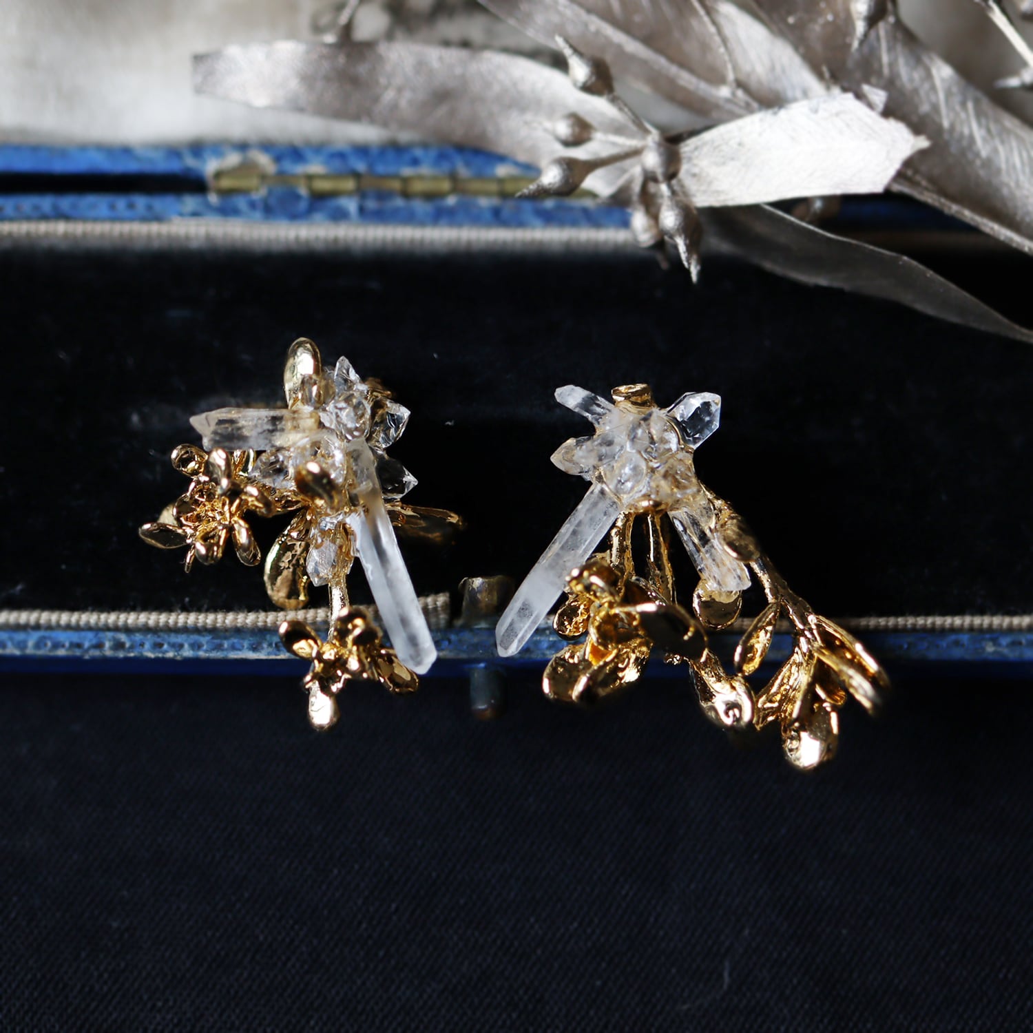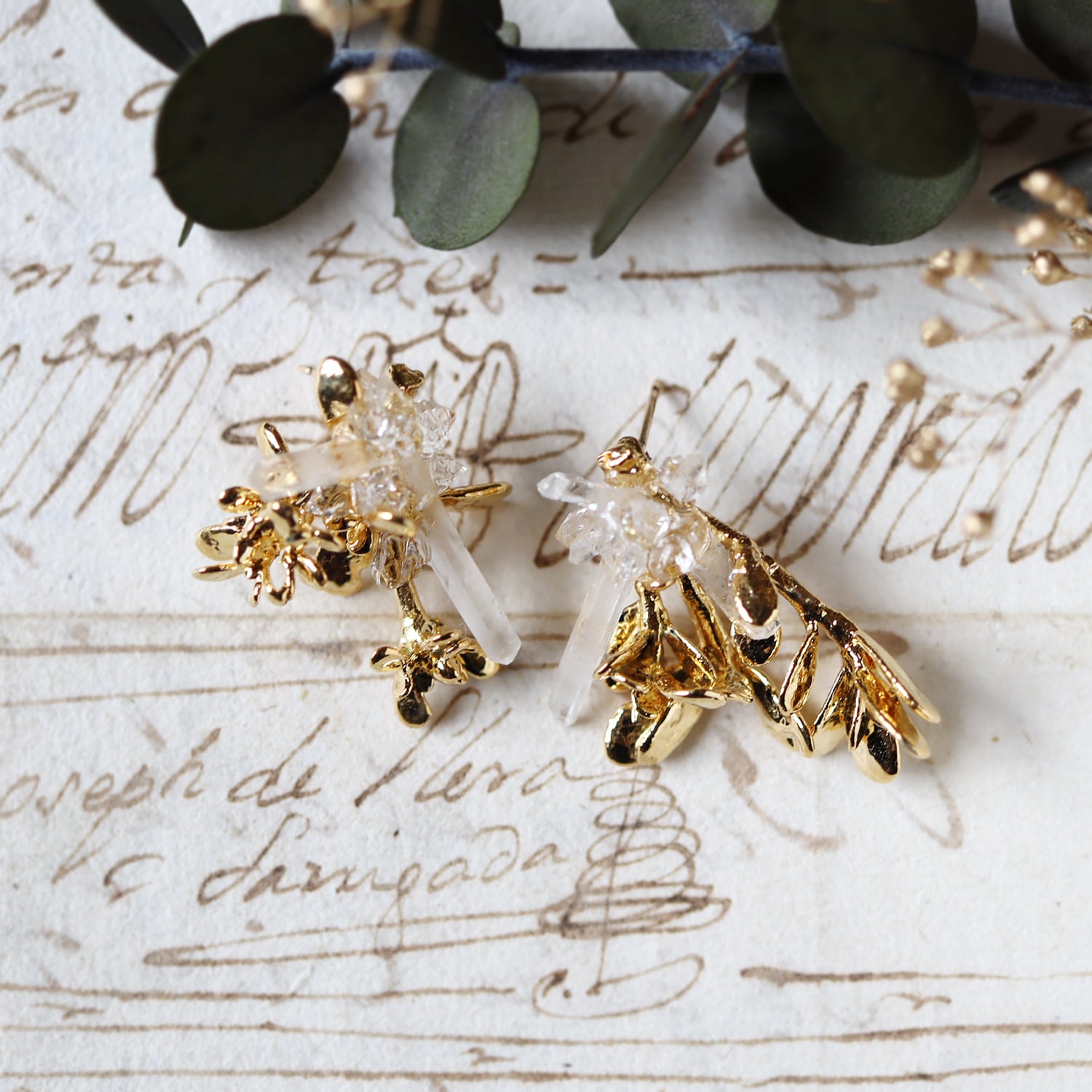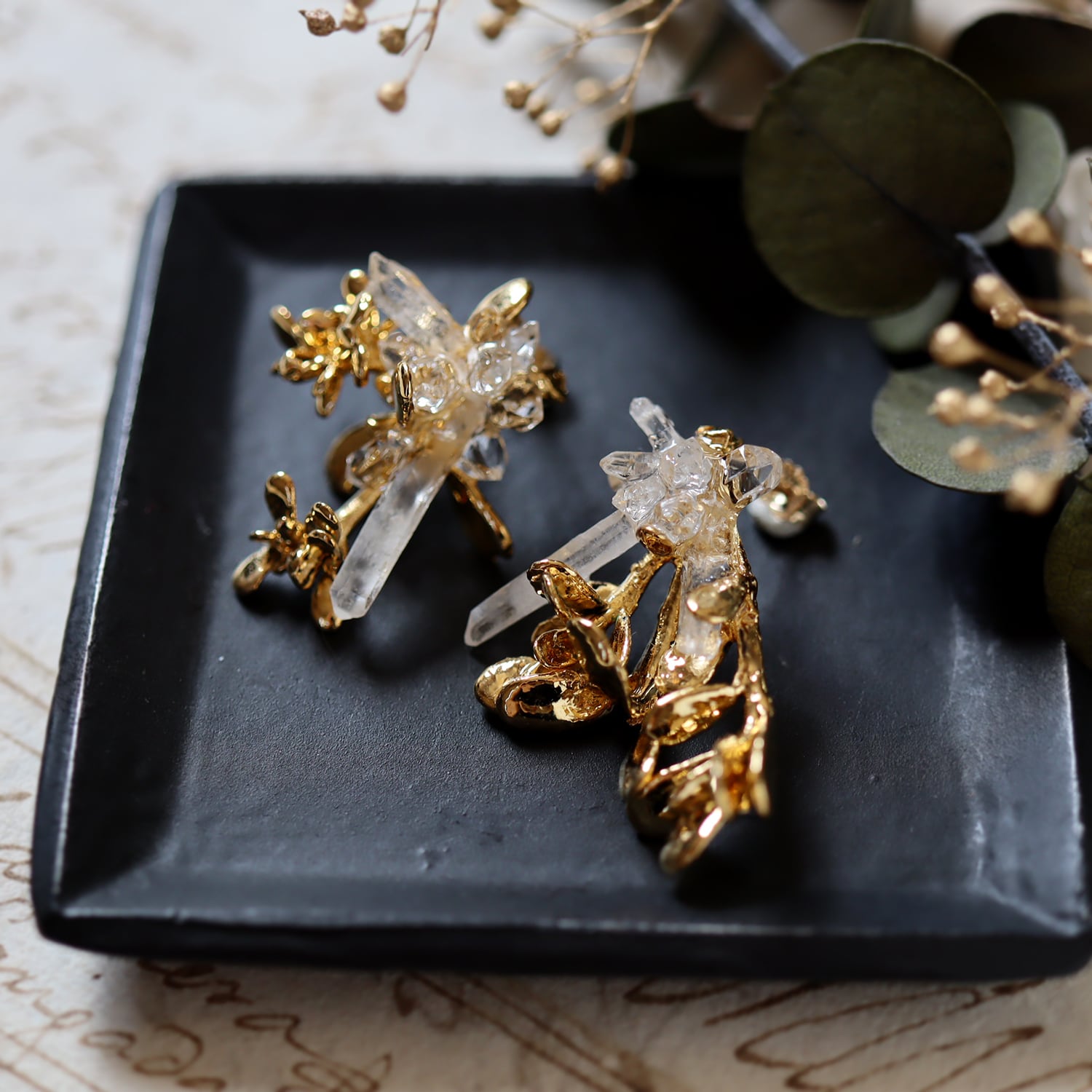 金属化した本物の植物から、花開くように結晶したクォーツ。植物と鉱物のナチュラルな美しさがあなたを飾る、大ぶりなピアスです。