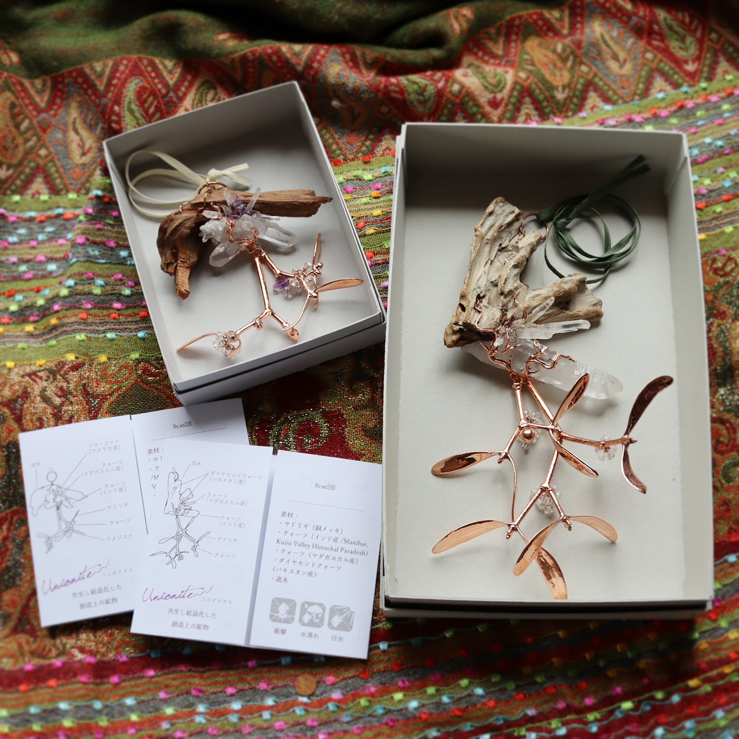 素材:ヤドリギ(銅メッキ)・クォーツ(インド産/Manihar, Kuiiu Valley Himachal Paradesh)・クォーツ(マダガスカル産)・ダイヤモンドクォーツ(パキスタン産)・流木
