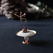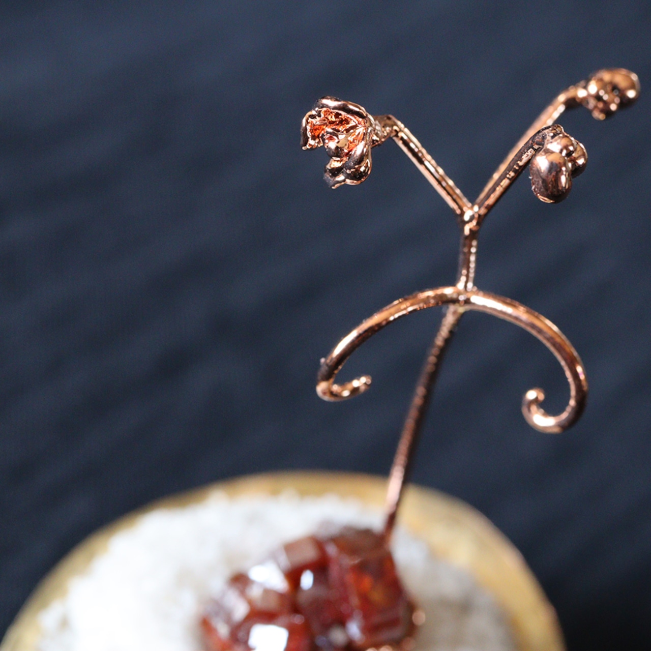 世界中の熱帯・亜熱帯で育つ、つる性植物。夏に小さな白い花を咲かせ、風船状の果実をつけます。使用したのは花とつぼみの部分。くるんとした巻きひげを、他のものや植物に絡ませながら伸びていきます。夏に庭で採取したものを金属化しました。鉱物を根っこで抱え、銅のつるを伸ばし育っていく様子のオブジェです。