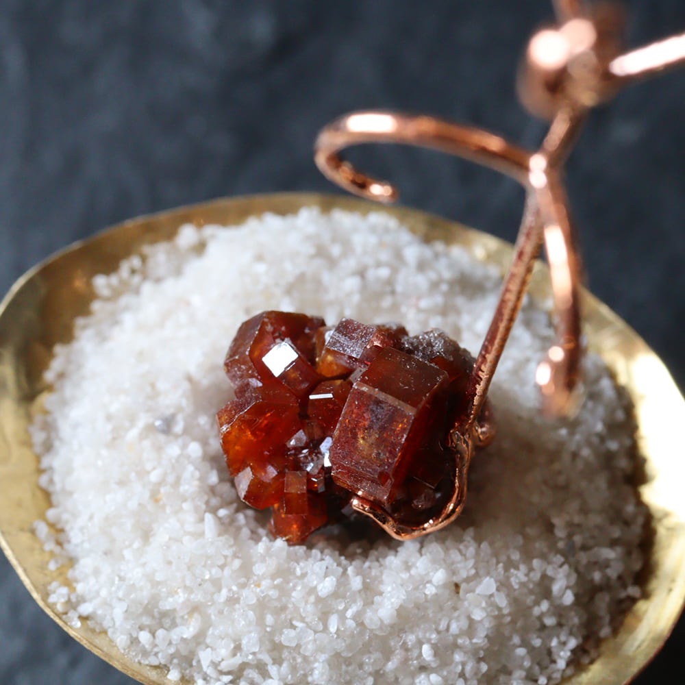 アパタイトグループで、バナジウムを主成分とする鉱物。六角形のプレートが密集する美しい造形。産業的に用いられるバナジウム鉱石のひとつで、密度が高くずっしり重みがありますが、とても脆いことも特徴です。使用したのは、2007年に見つかった非常に良質な結晶群の、そのまた地下深くから近年見つかった、更に色が濃い標本。