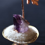 和名は「紫水晶」で、石英の結晶に微量に含有された鉄イオンにより紫色に発色します。ガラス質の透明度の高い石で、淡いライラック色から濃紫色まで幅広い色合いがあります。色の帯やムラができやすいことも特徴で、中心で二色に分かれる様子が見られます。水晶特有の六角柱の鉛筆型に育った美しい形の結晶。