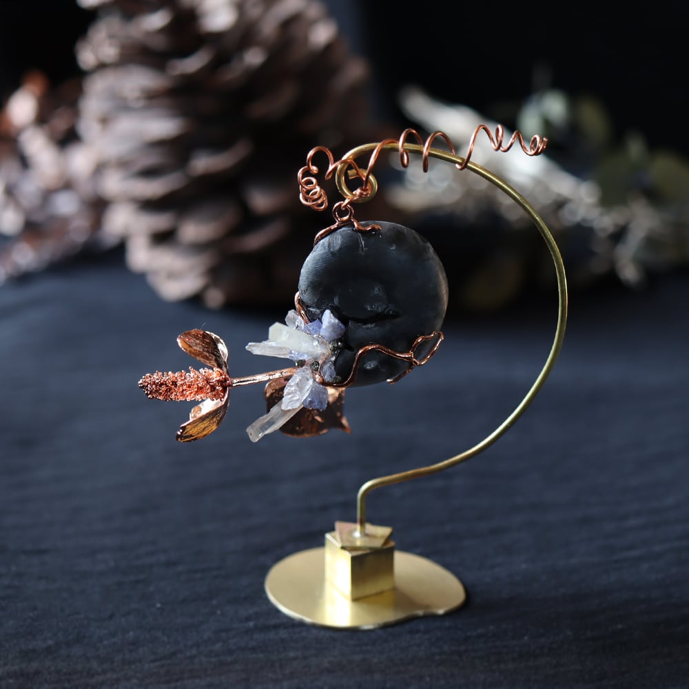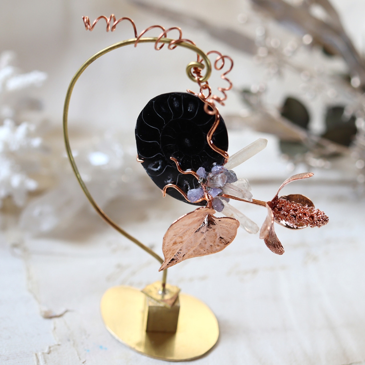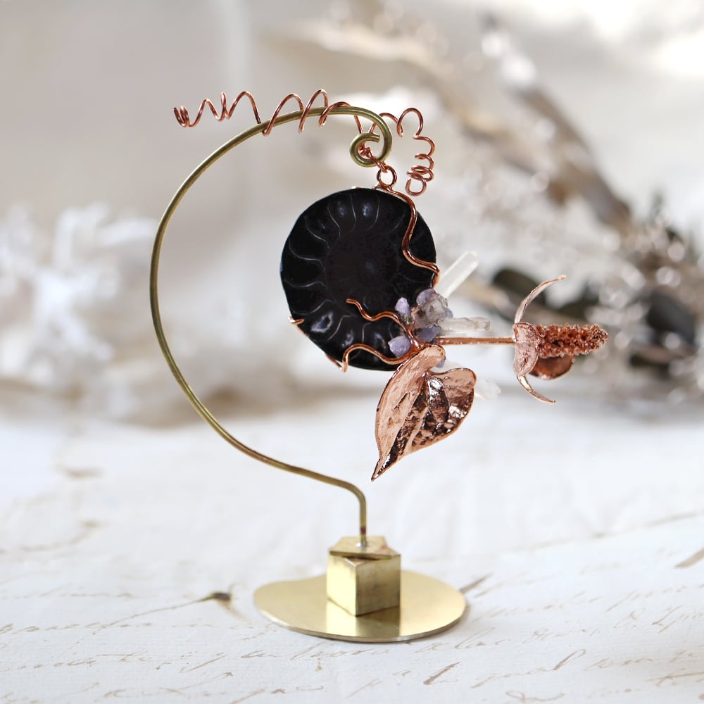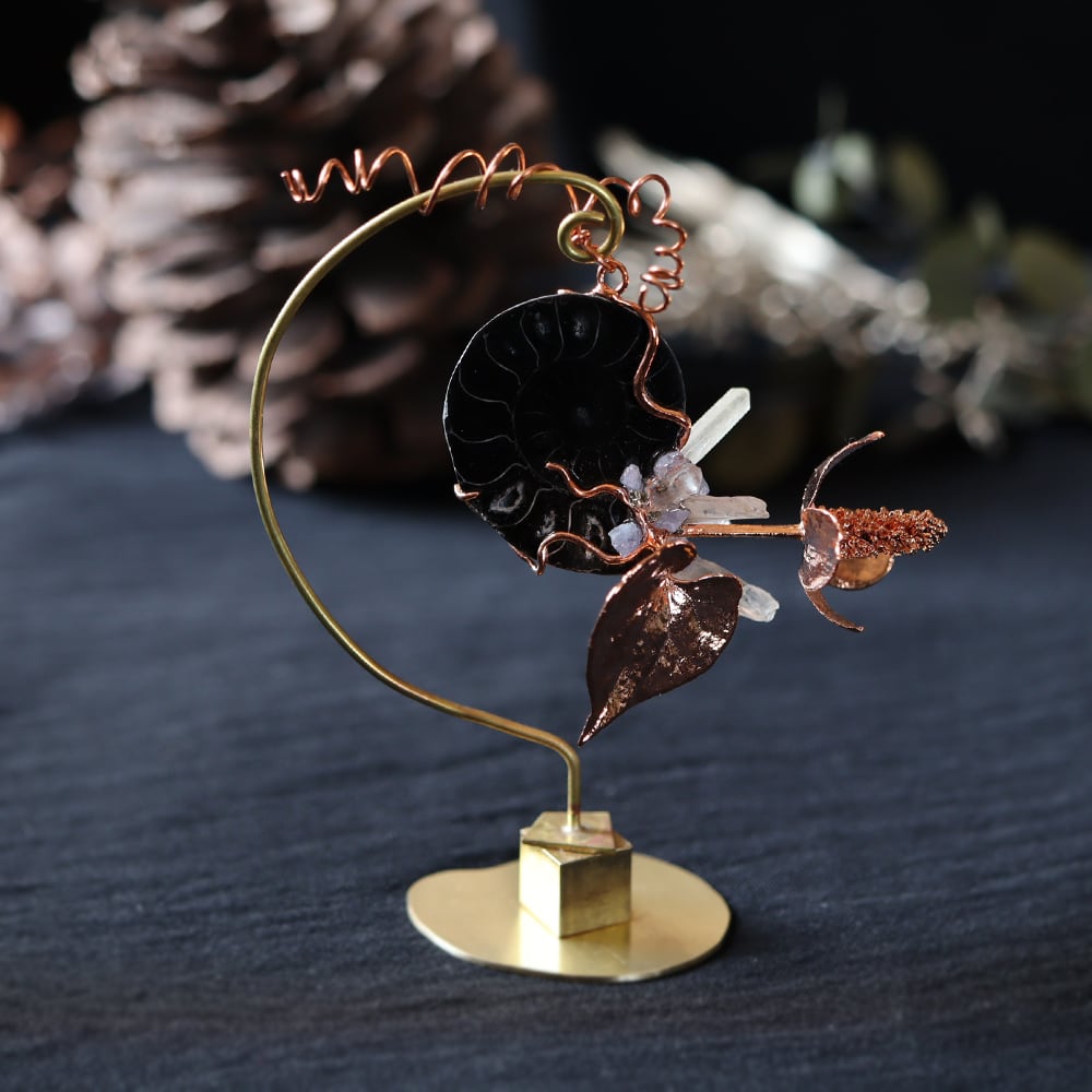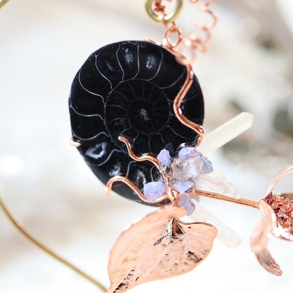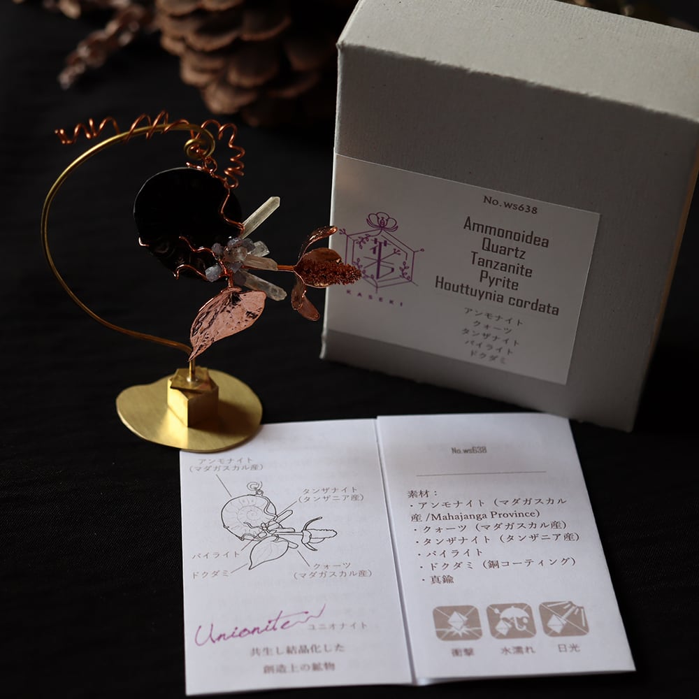 素材:アンモナイト(マダガスカル産/Mahajanga Province)・クォーツ(マダガスカル産)・タンザナイト(タンザニア産)・パイライト・ドクダミ(銅メッキ)・真鍮