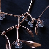 世界中で産出され、古くから装飾品や通貨・薬としても使用されてきたクォーツ。「石英」という鉱物が無色透明に結晶化したもので、和名は「水晶」です。ガラス質な透明感と、六角柱の鉛筆型に育つ結晶が特徴。突然変異的にヤドリギにクォーツが実ったオブジェです。揺れるたび光を受けて輝きます。