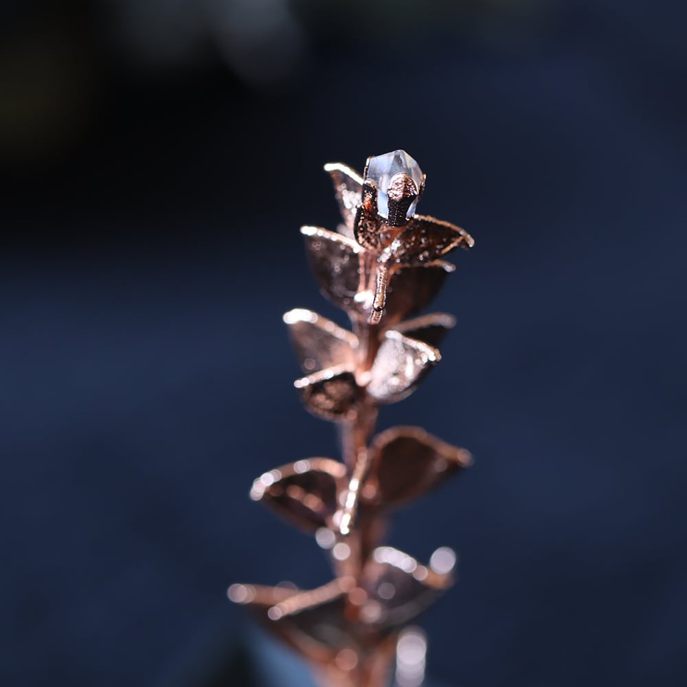 植物や鉱物など、金属ではないものの表面に電気メッキをかける技術。儚く枯れてしまう植物を金属に変えることでその時間と美しさを留めることができる、錬金術のような技法です。金属の層を厚くすることにより、強度も保たれます。