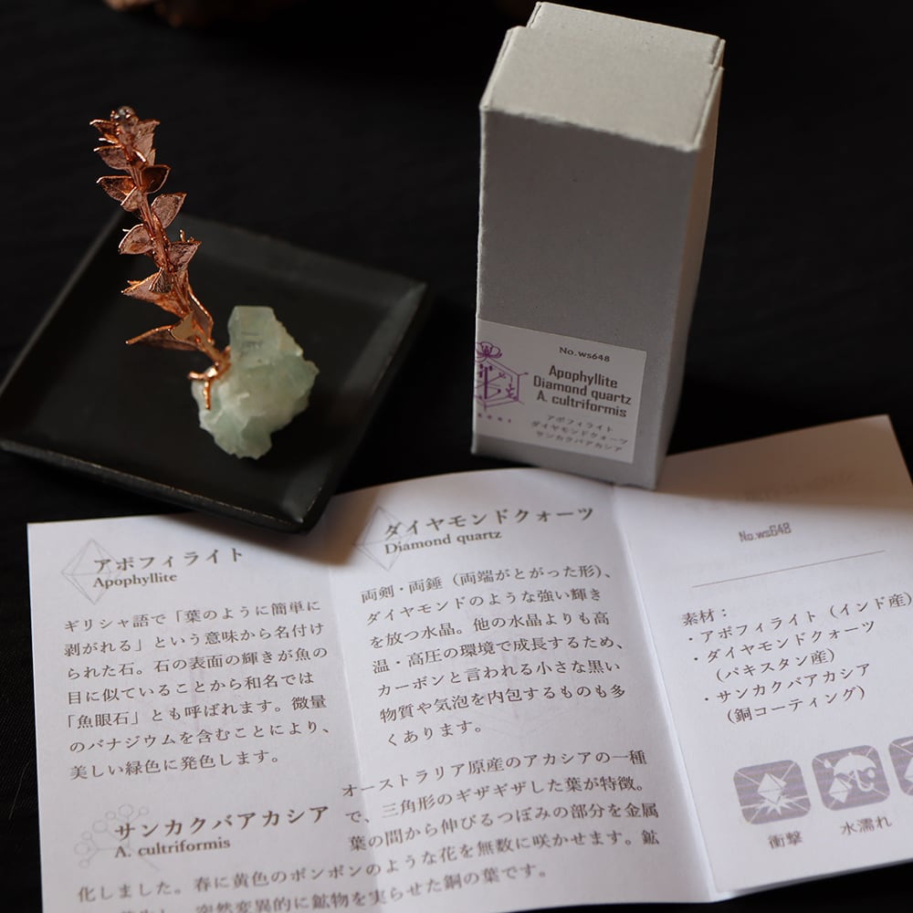 全ての作品にシリアルナンバーが付いており、オリジナルの箱と鉱物植物に関する説明書を同封します。