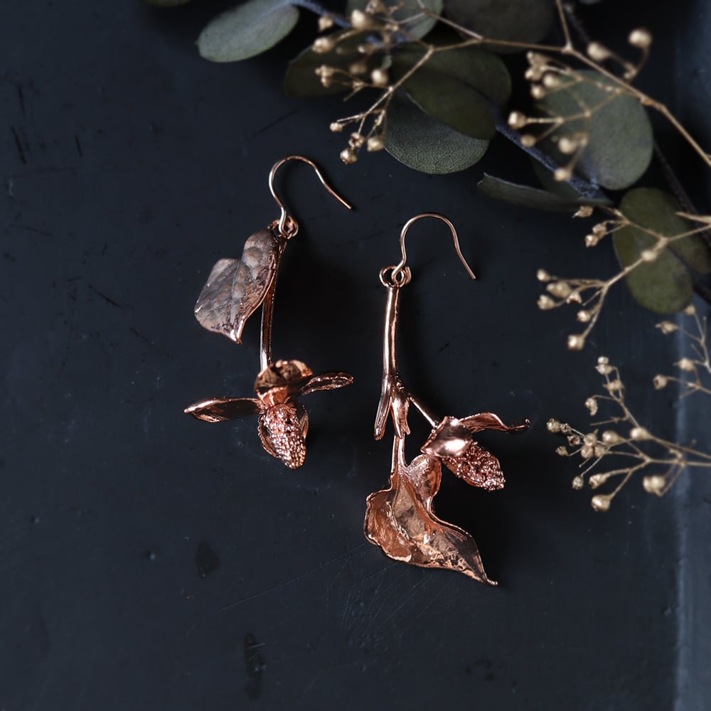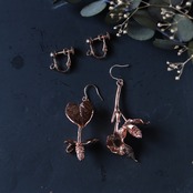 お庭で採取した本物のドクダミを、エレクトロフォーミング(電気メッキ)により銅で金属化した一点物のピアスです。