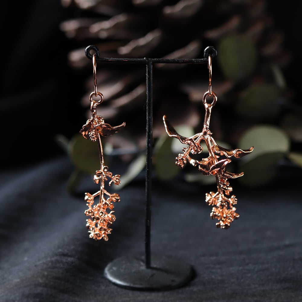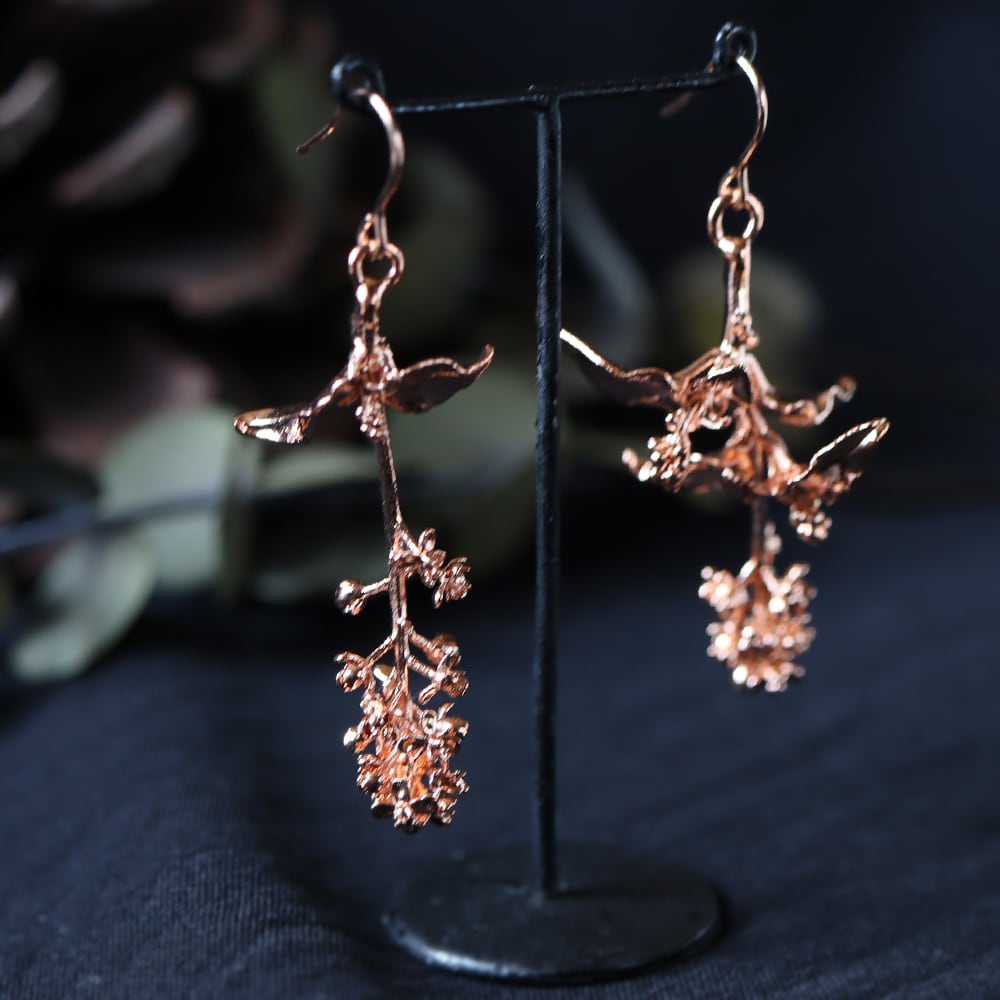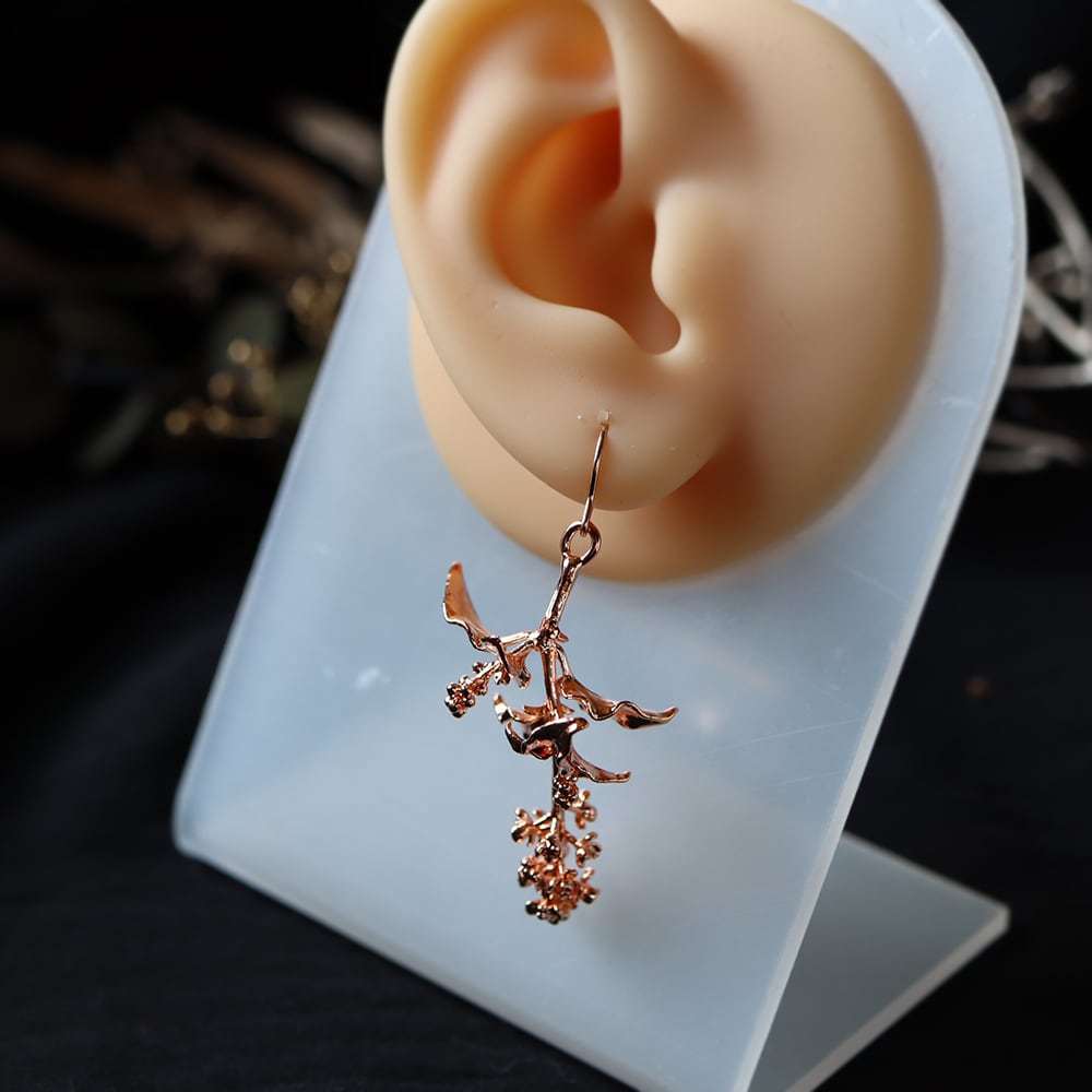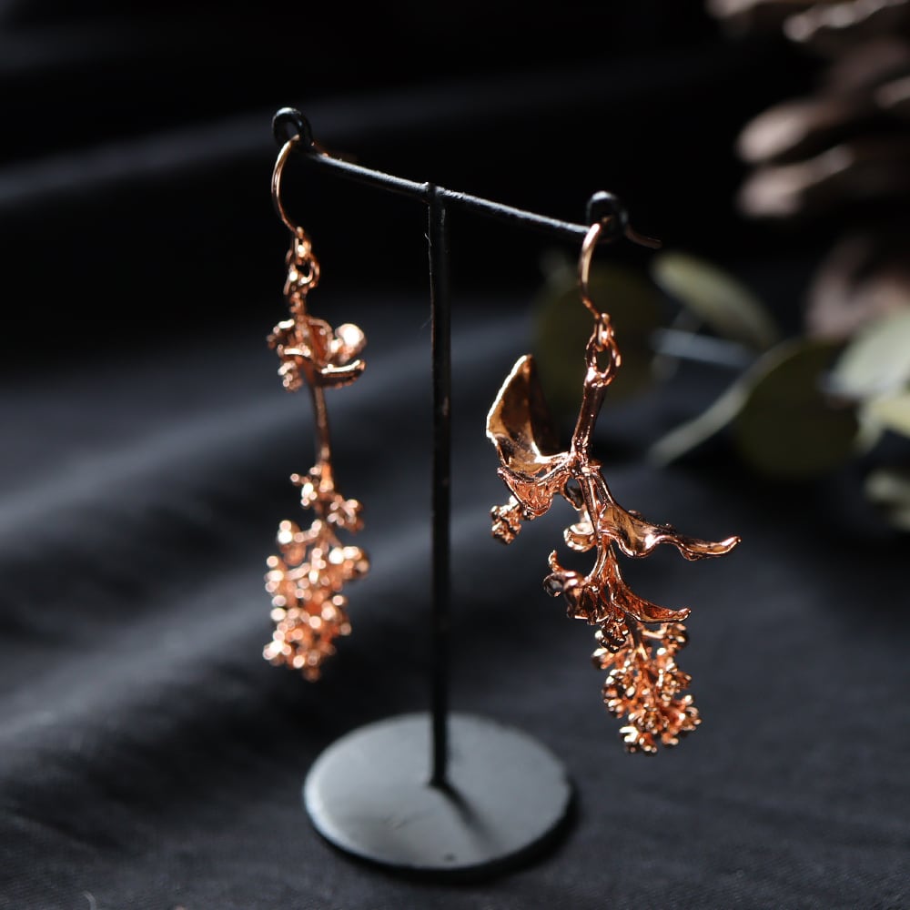 お庭で採取した本物のジュズサンゴを、エレクトロフォーミング(電気メッキ)により銅で金属化した一点物のピアスです。