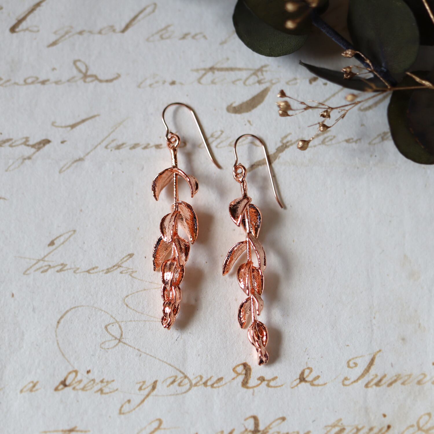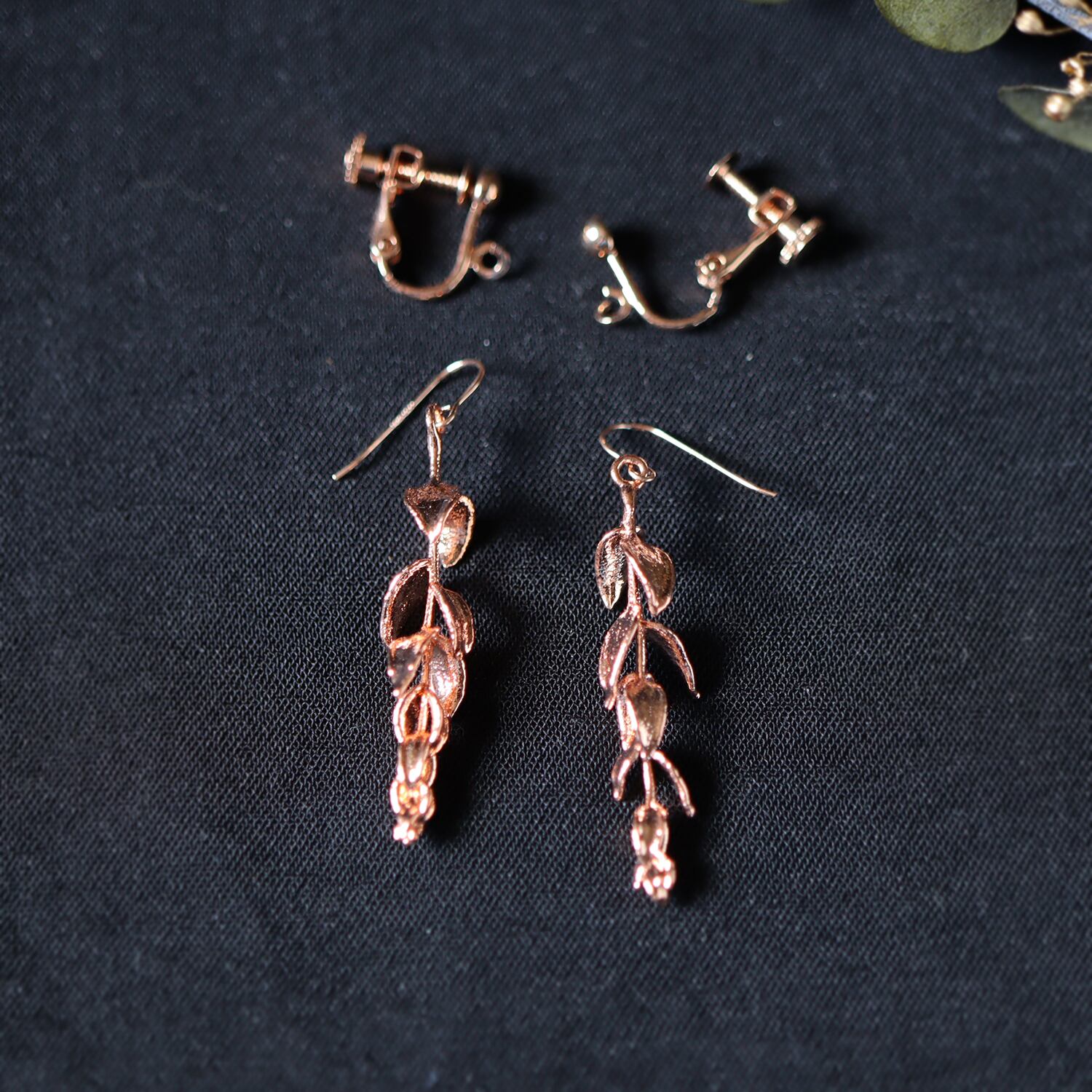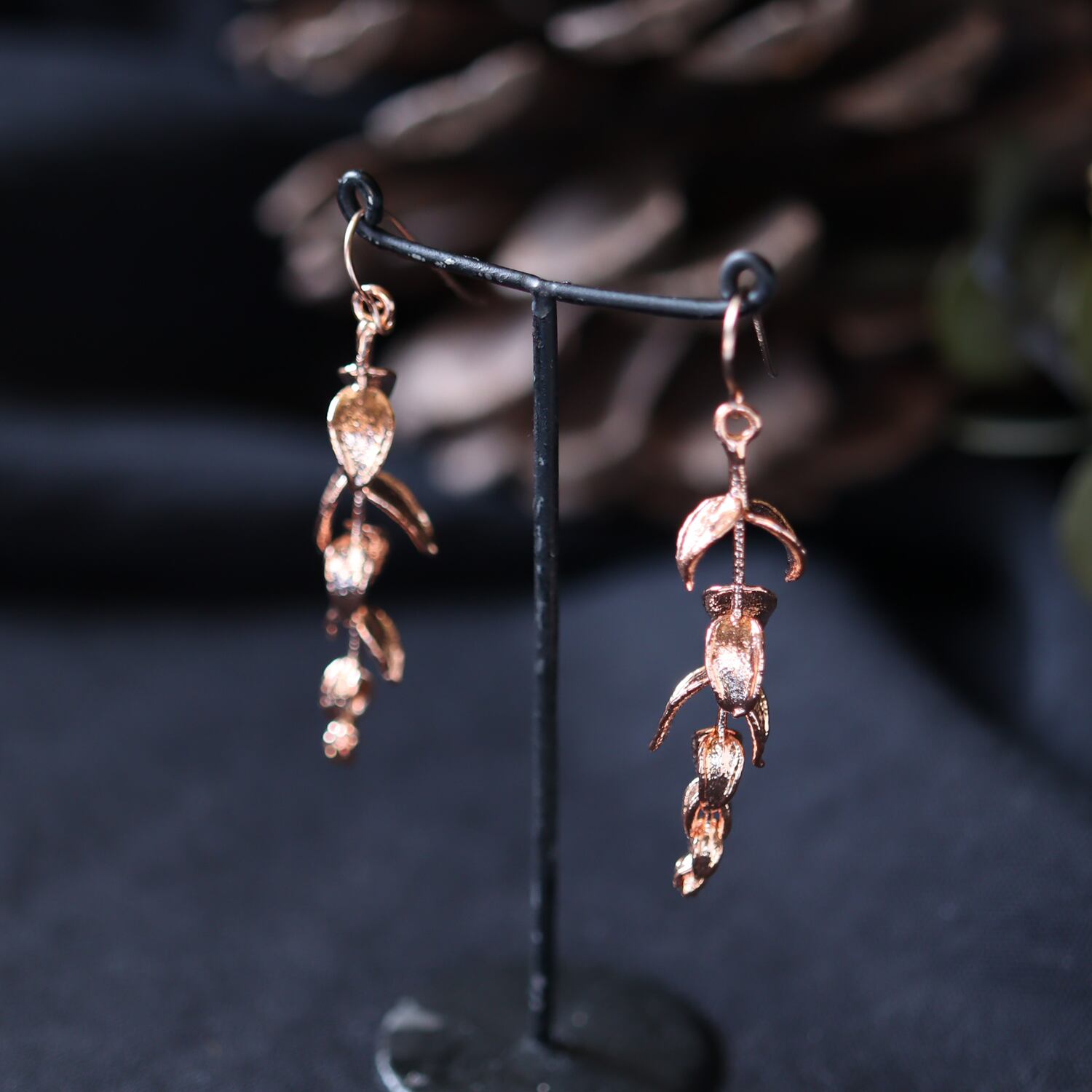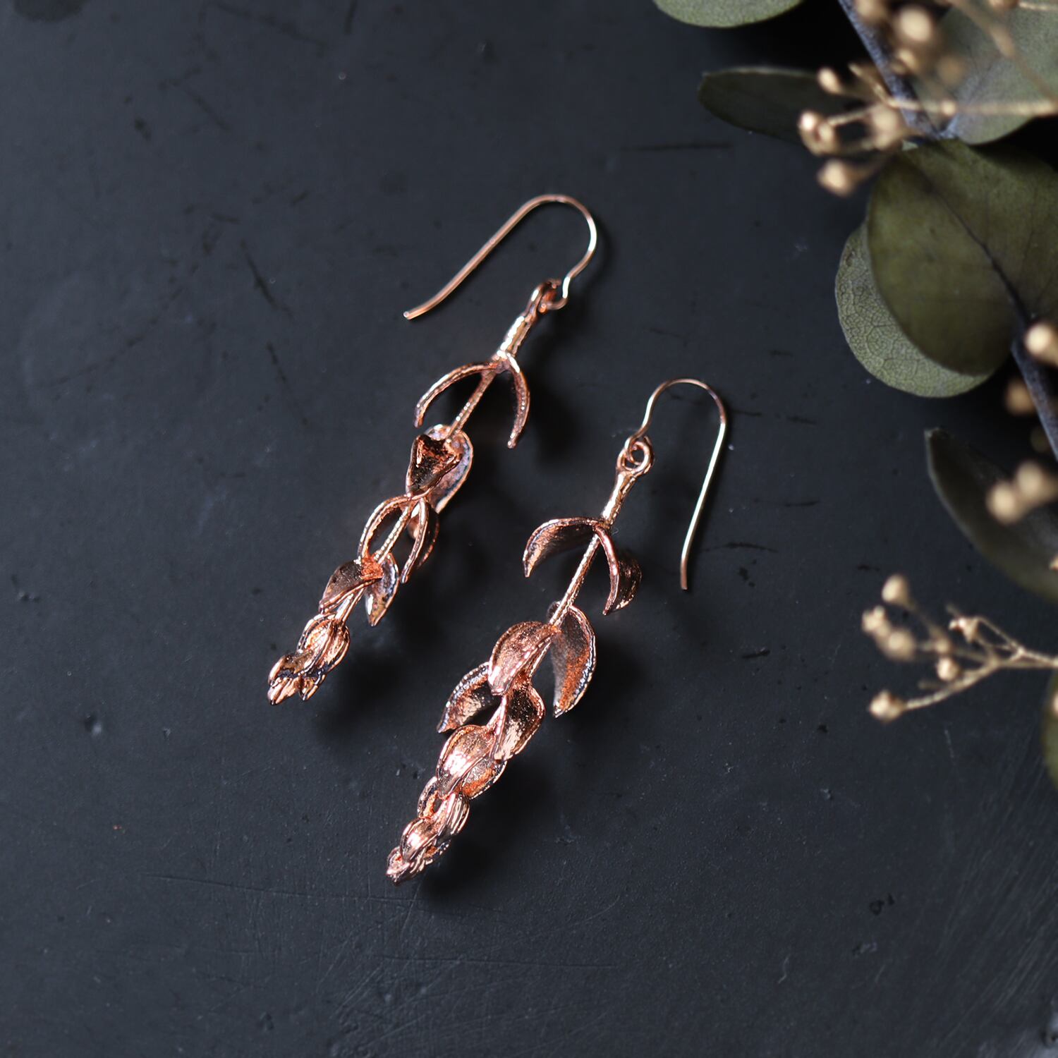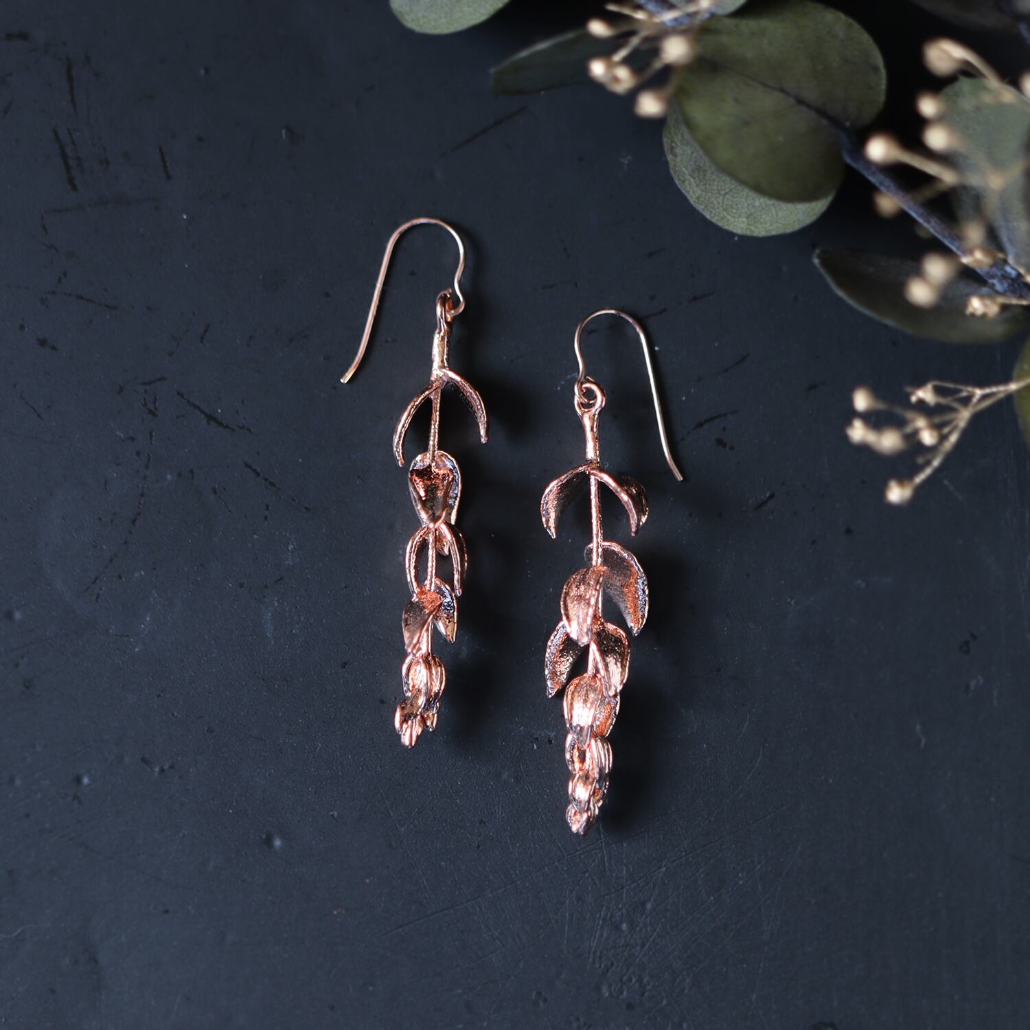 庭で採取した本物のユーカリを、エレクトロフォーミング(電気メッキ)により銅で金属化した一点物のピアスです。