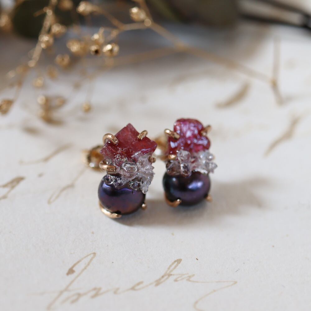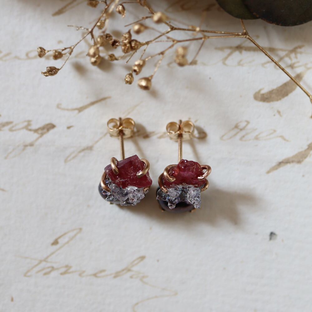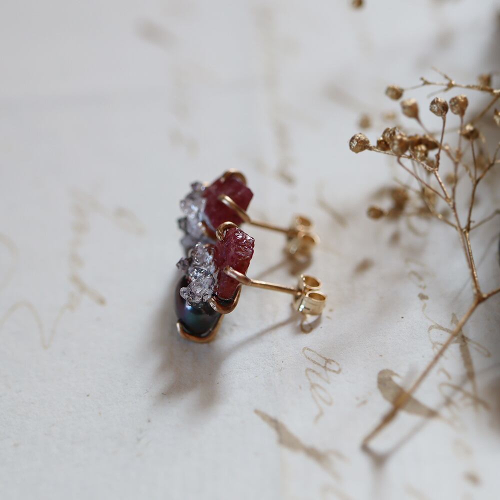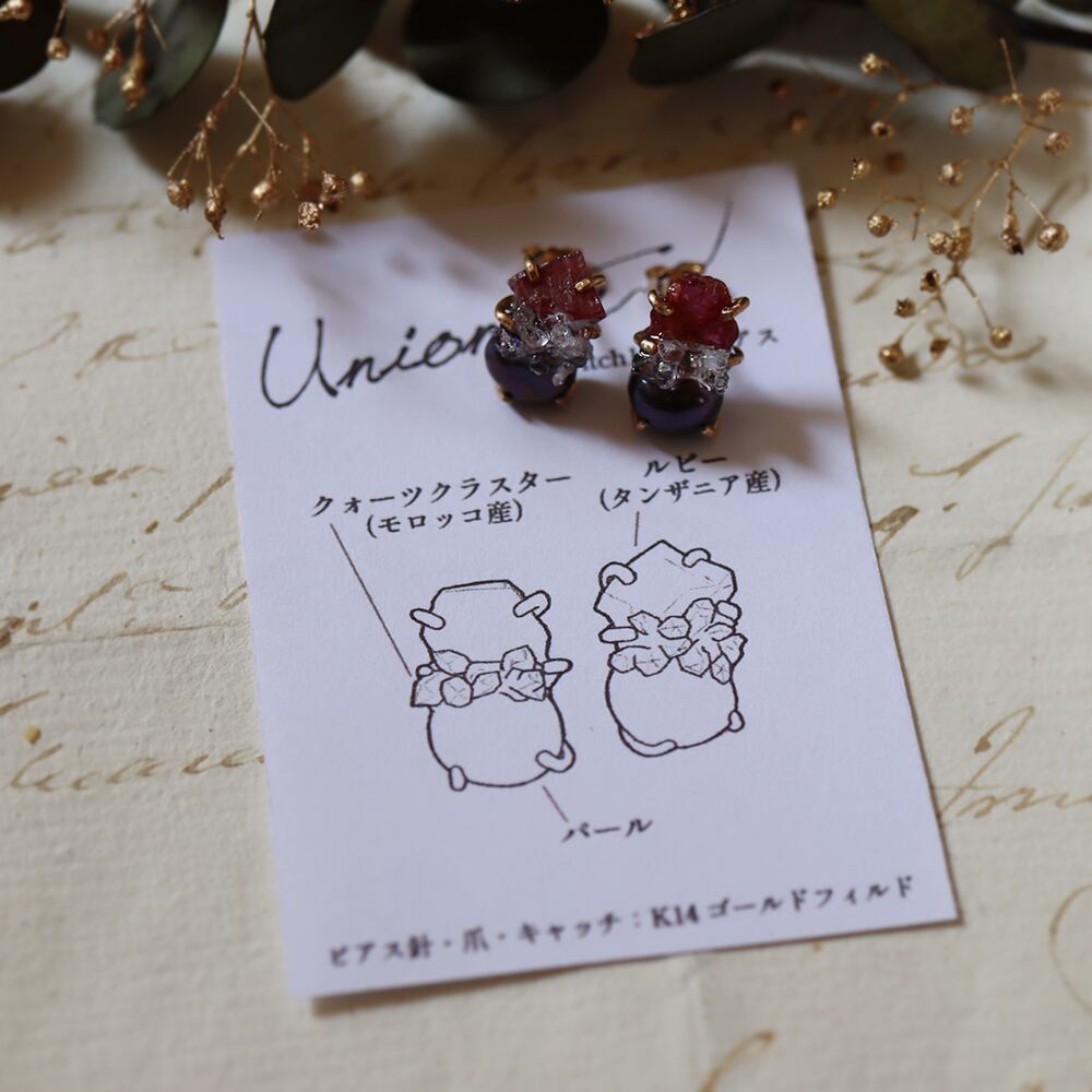 素材:ルビー(タンザニア産)・パール・クォーツクラスター(モロッコ産)・K14ゴールドフィルド(爪・ピアス針・キャッチ)