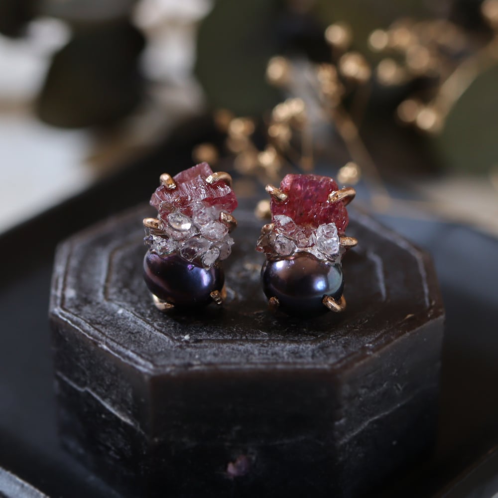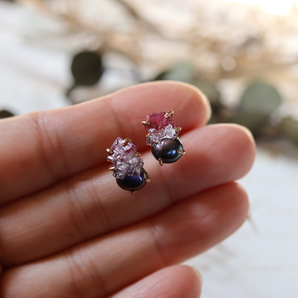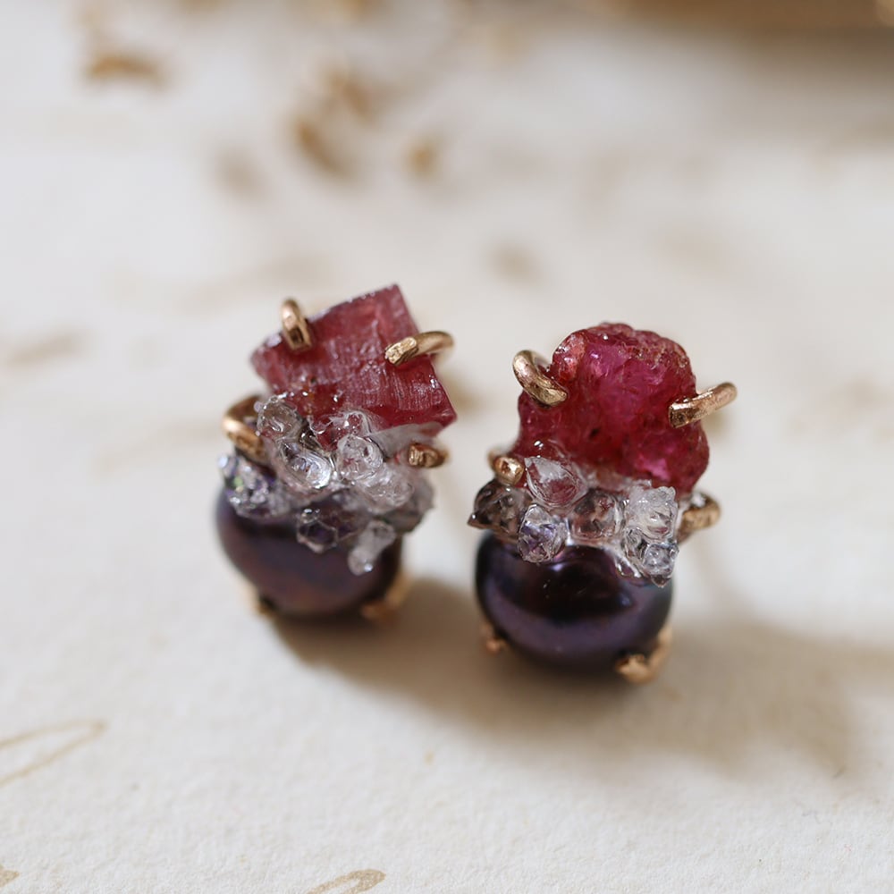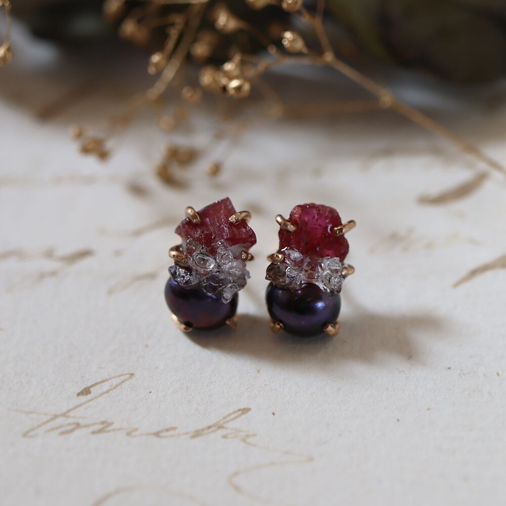 素材:ルビー(タンザニア産)・パール・クォーツクラスター(モロッコ産)・K14ゴールドフィルド(爪・ピアス針・キャッチ)