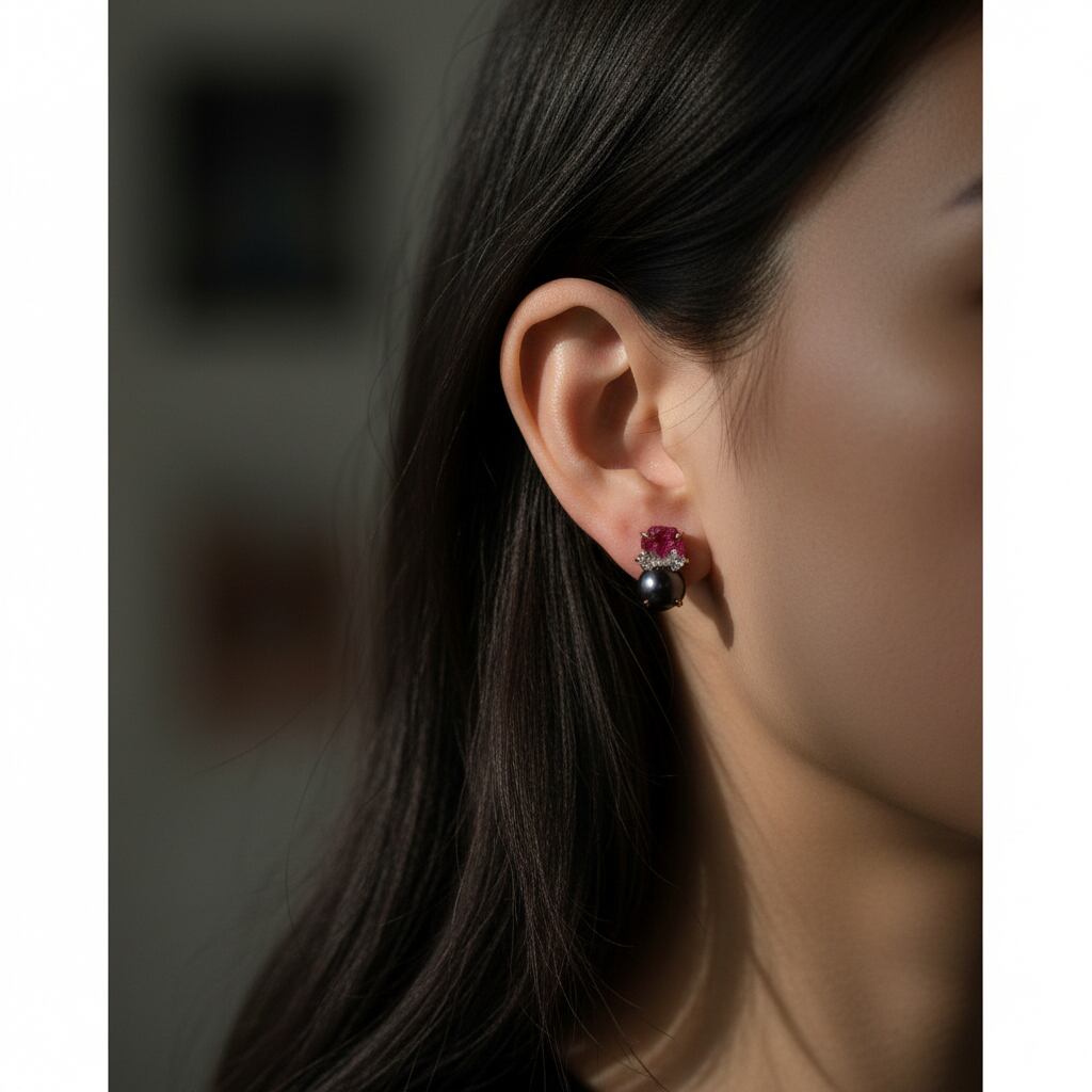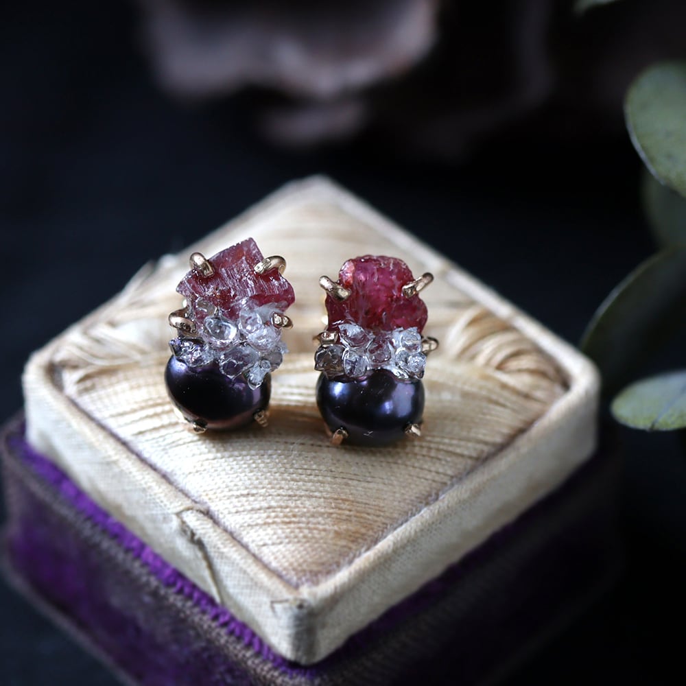 ルビーとクォーツクラスター、グレーパールが共生する、創造上の鉱物「Unionite」のピアス。