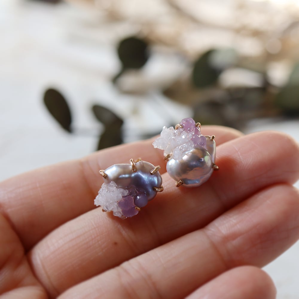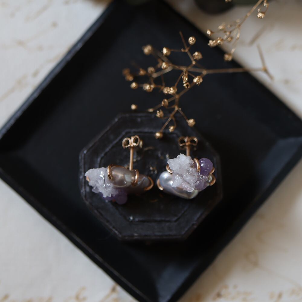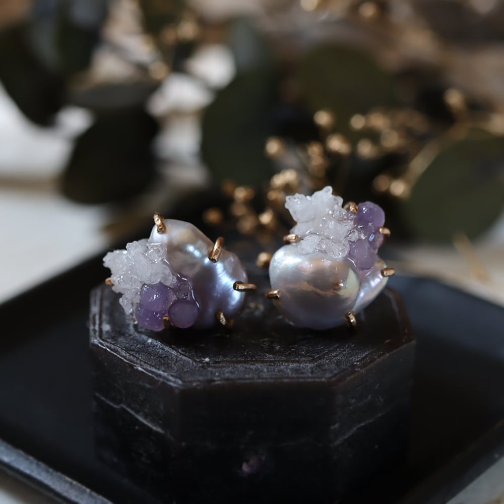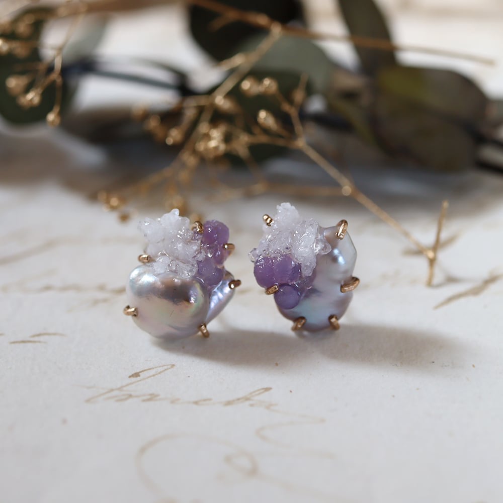 グレーパールを母岩に、クォーツクラスターとグレープカルセドニーが共生する、創造上の鉱物「Unionite」のピアス。
