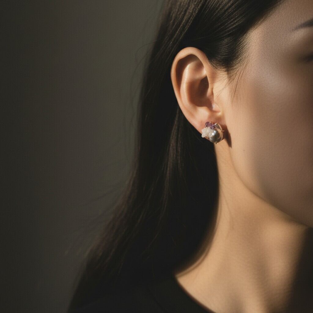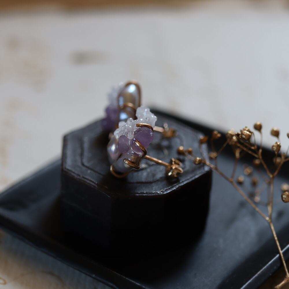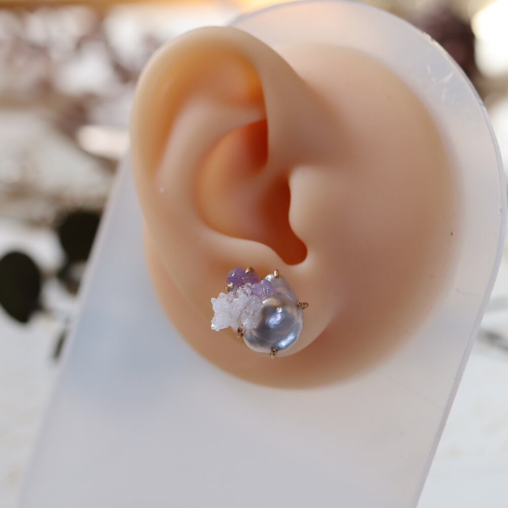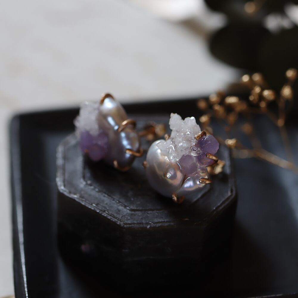 グレーパールを母岩に、クォーツクラスターとグレープカルセドニーが共生する、創造上の鉱物「Unionite」のピアス。