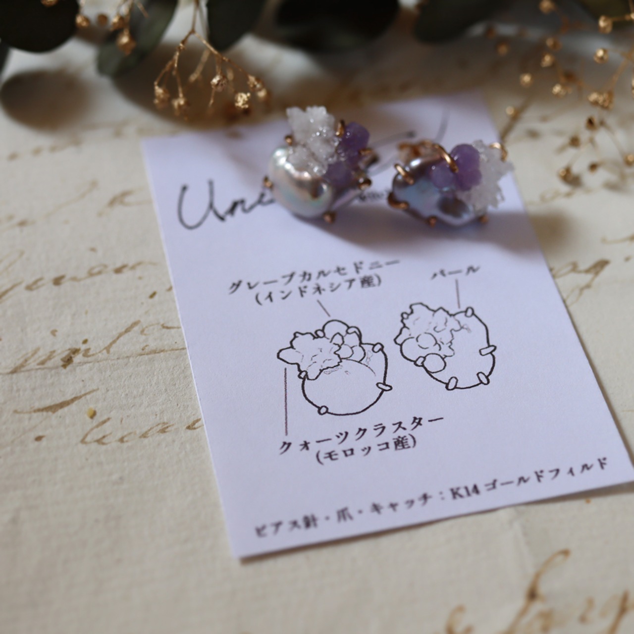 素材:グレープカルセドニー(インドネシア産)・クォーツクラスター(モロッコ産)・パール・K14ゴールドフィルド(爪・ピアス針・キャッチ)