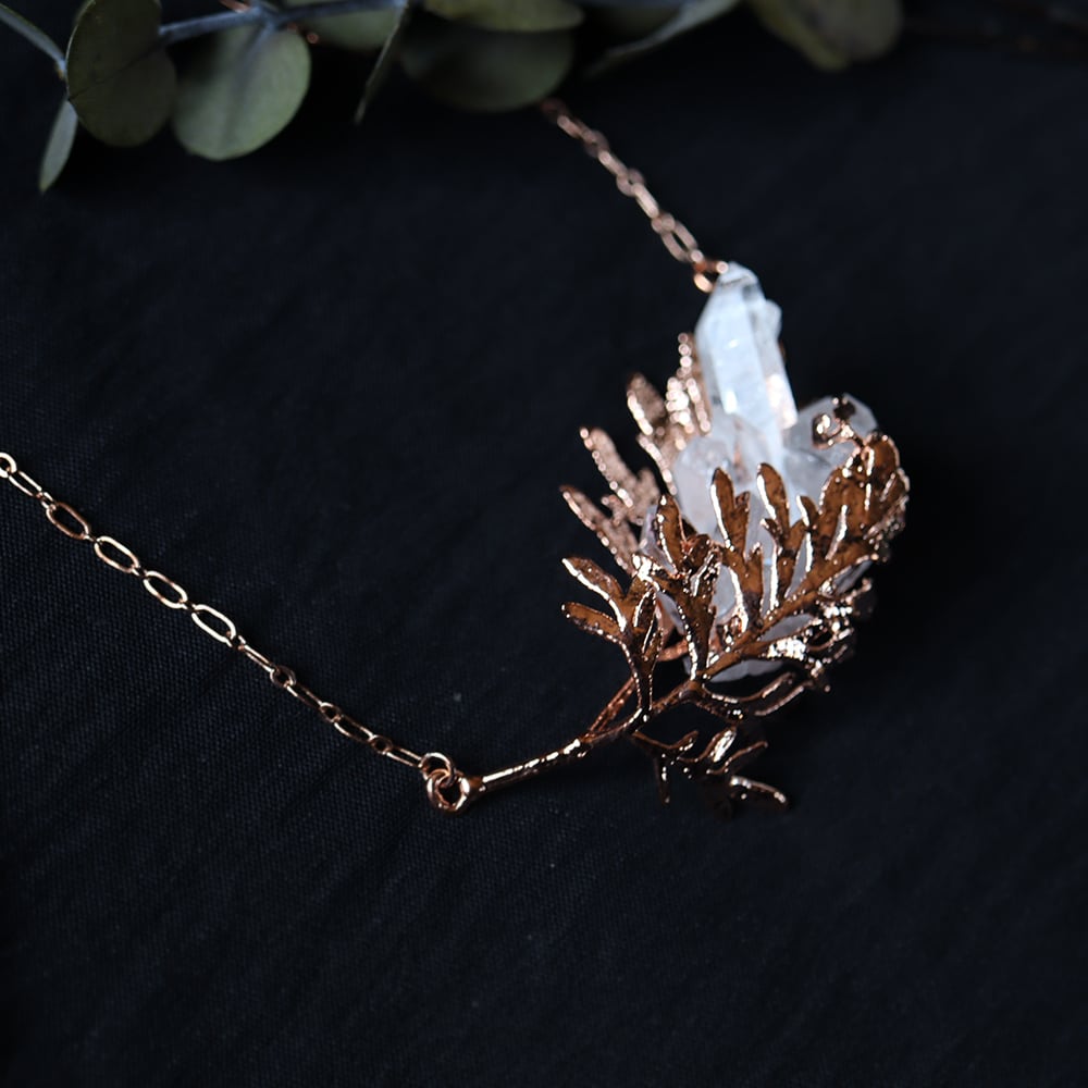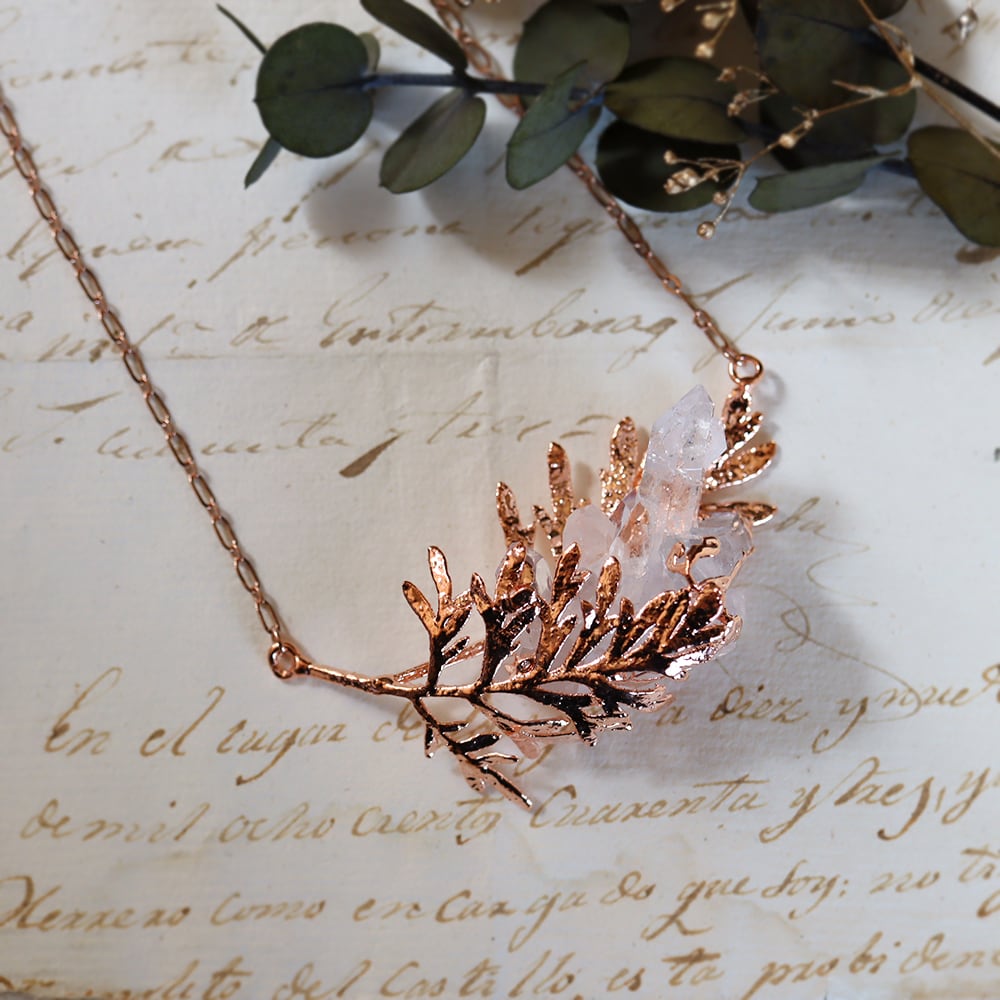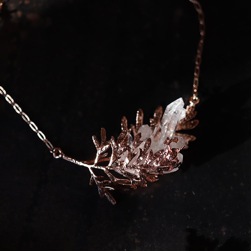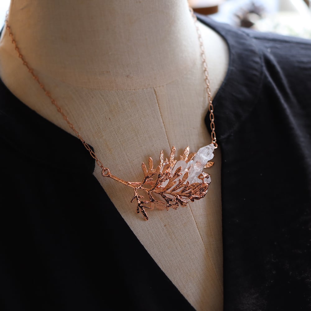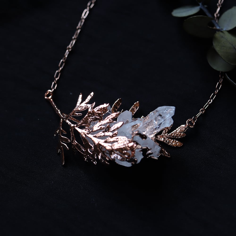 銅の葉からクォーツ結晶が伸びるネックレス。