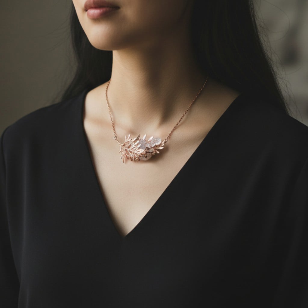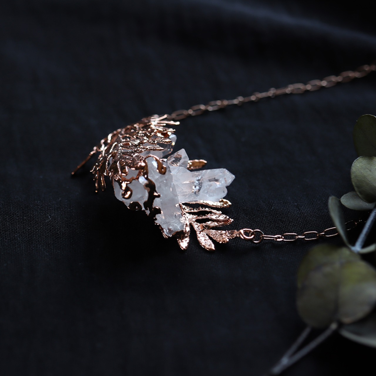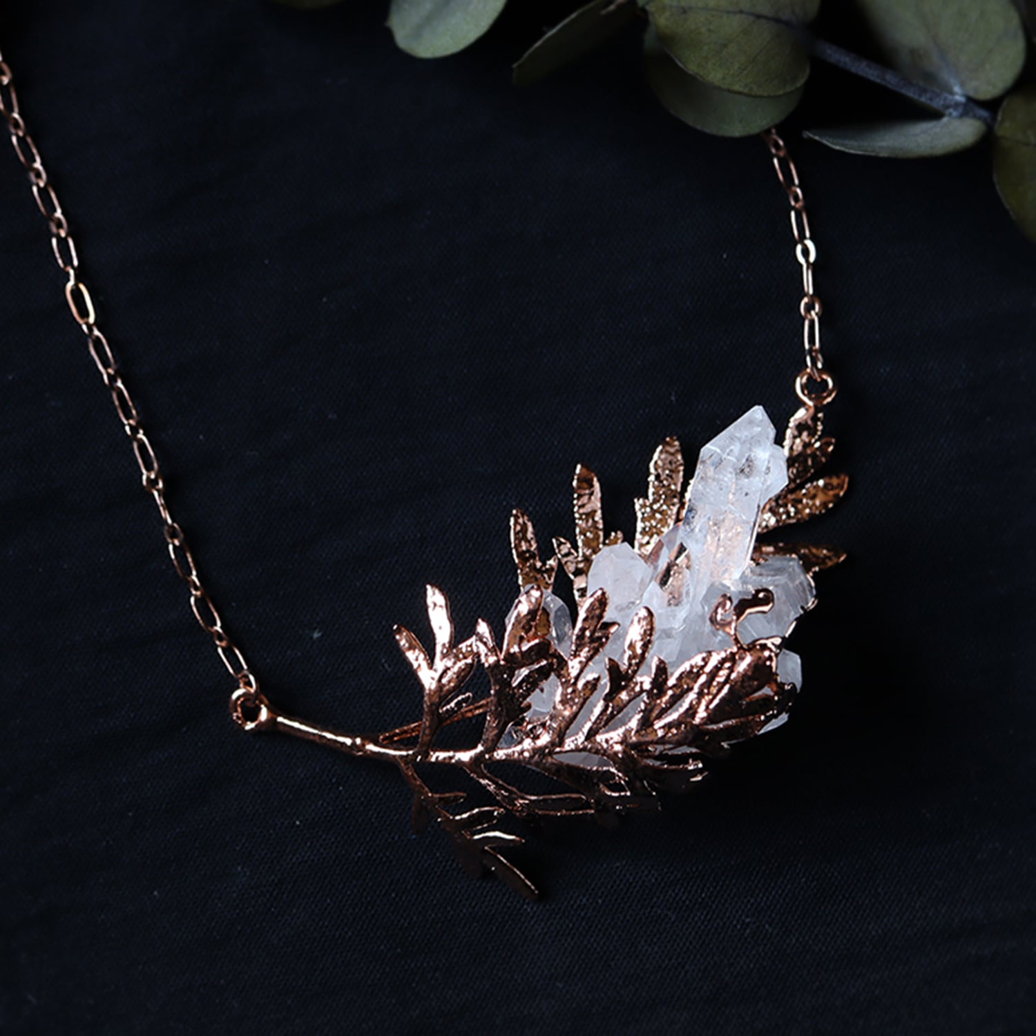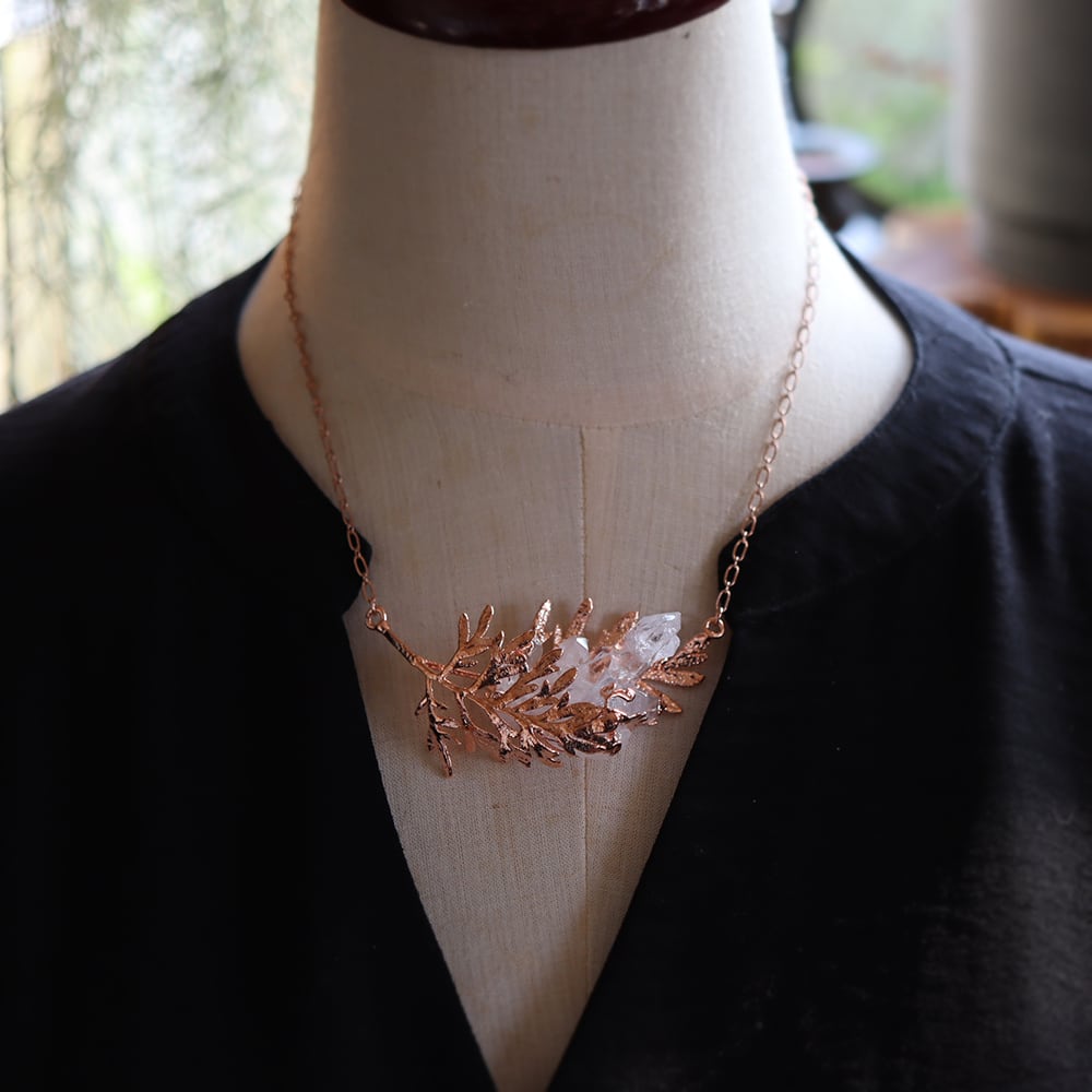 銅の葉からクォーツ結晶が伸びるネックレス。