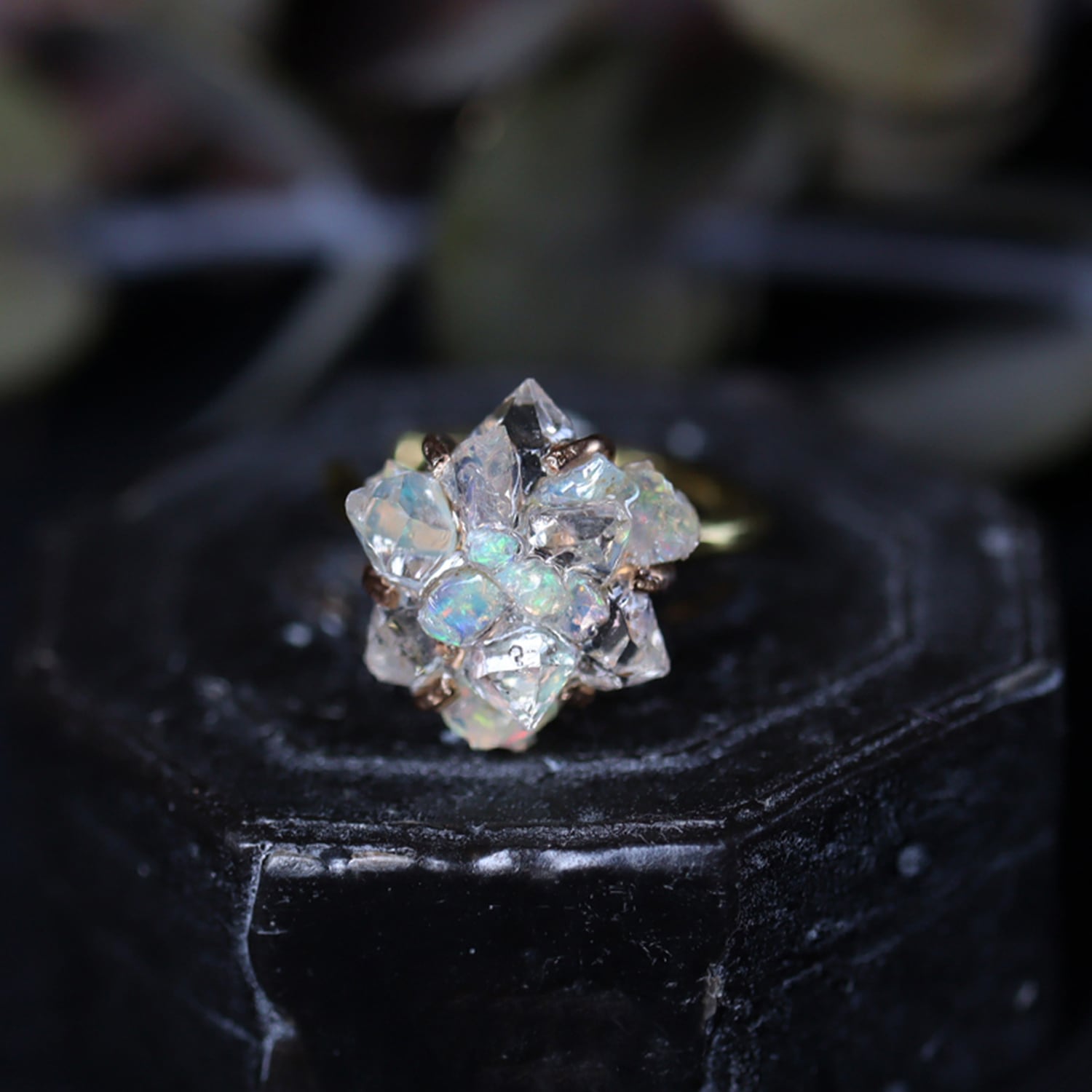 乳白色の中に虹色の光がゆらゆらと揺れるオパールと、結晶そのままの幾何学的な形、強い輝きと透明感が美しいダイヤモンドクォーツ。表情の違う鉱物の小さな結晶が複雑に重なり合い干渉することで、不思議な輝きを見せます。