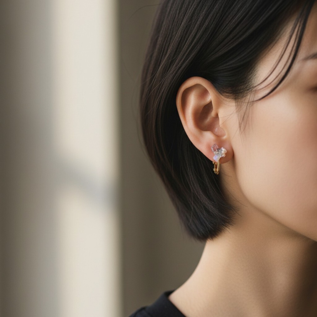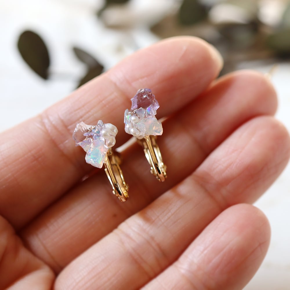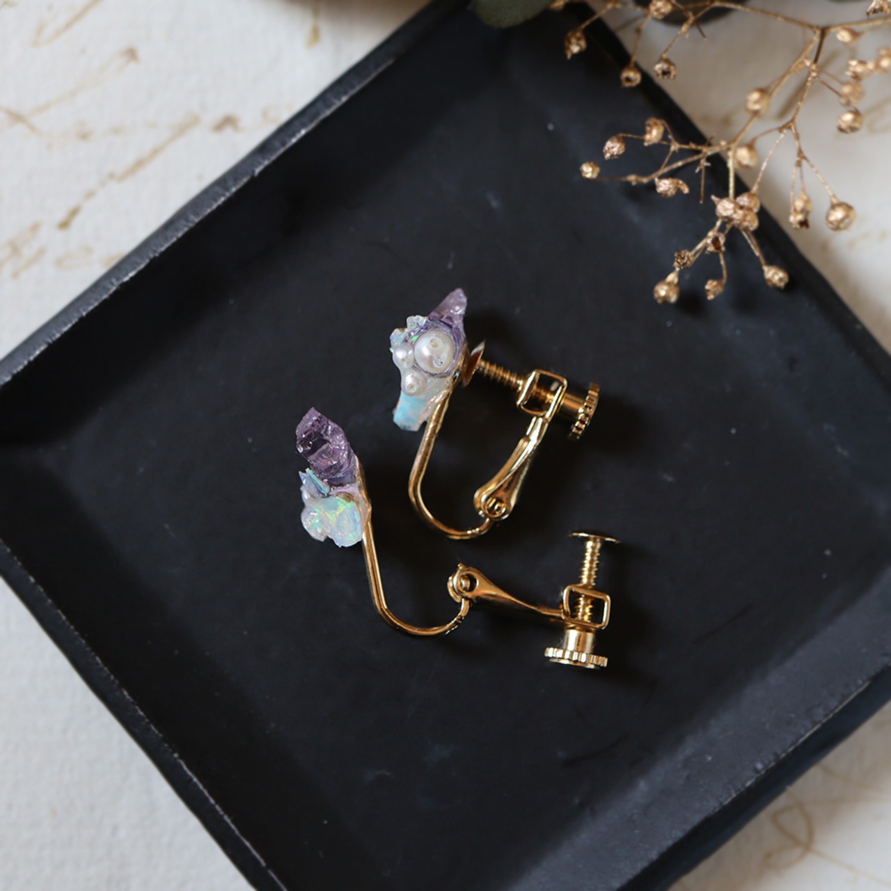小粒のイヤリングは普段使いにもおすすめです。地球が生み出した原石の美しさを、ファッションとして楽しめるアクセサリー。空想の鉱物標本がかもす独特な存在感が、装いに余韻を残します。