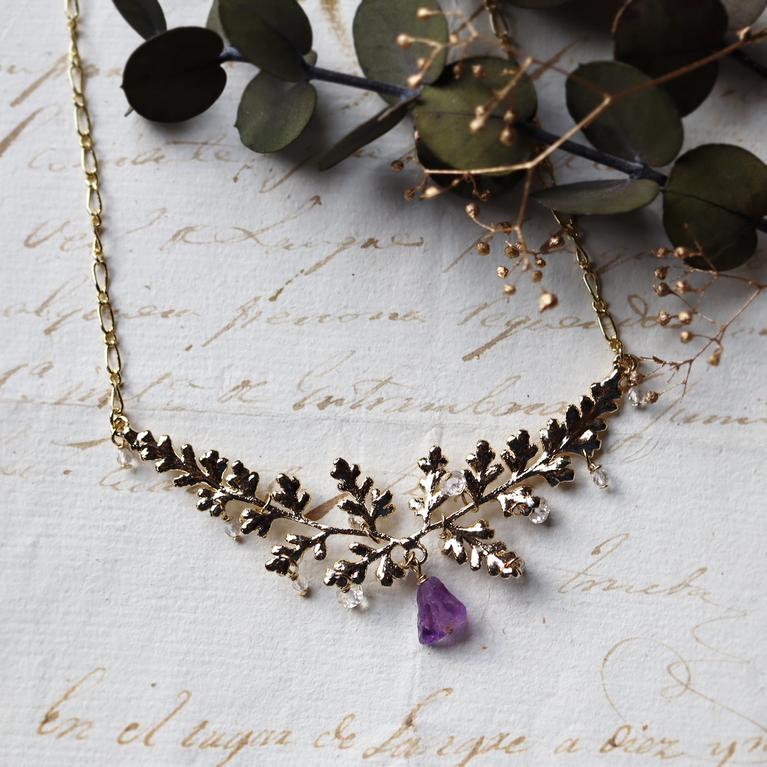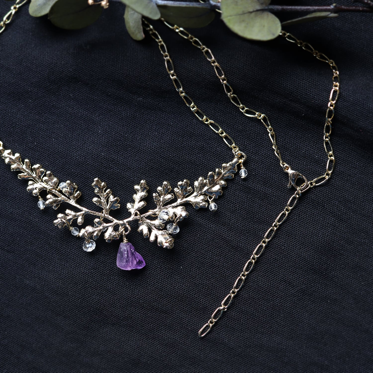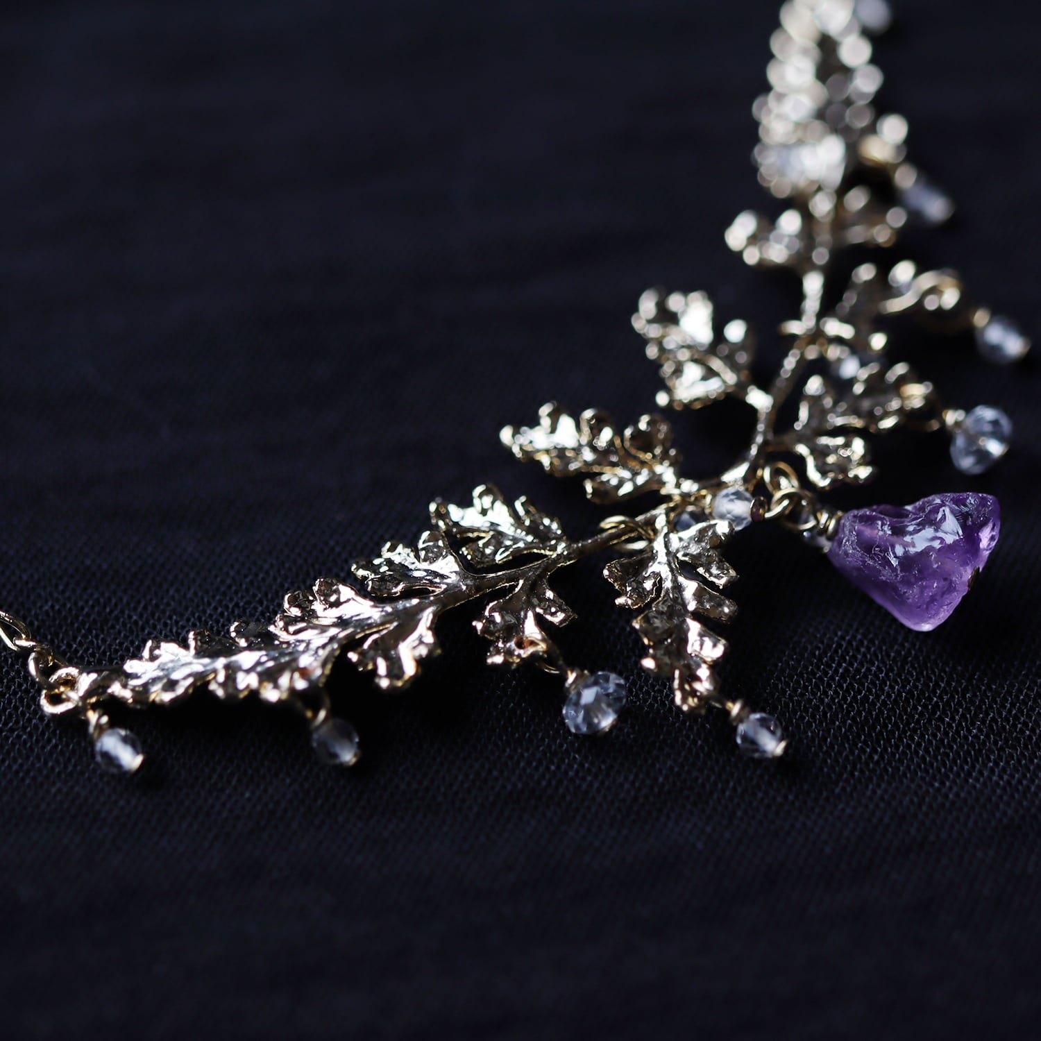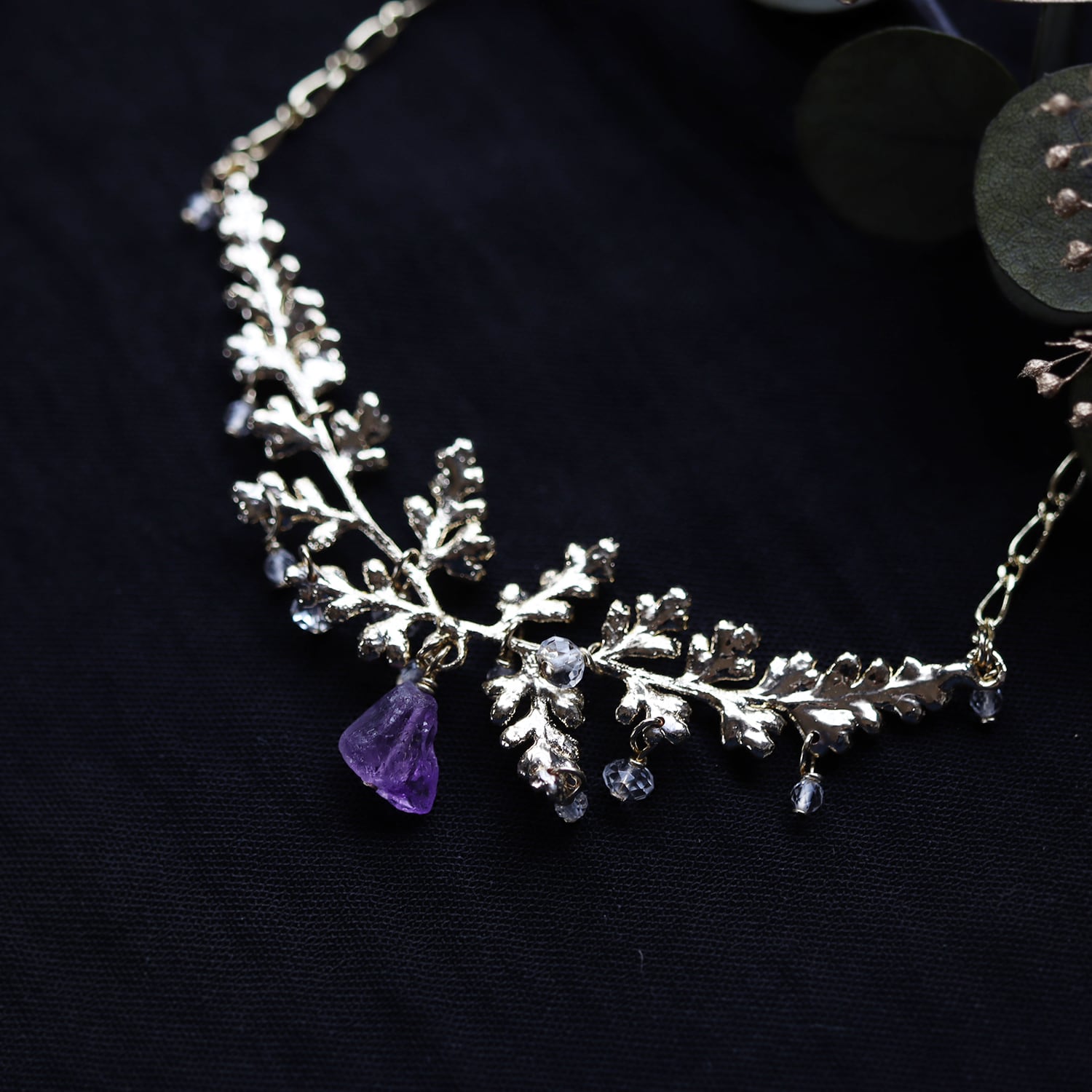 繊細な金の葉にアメジストが実り、クォーツが滴り揺れるネックレス。