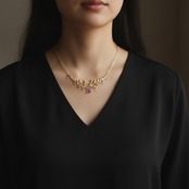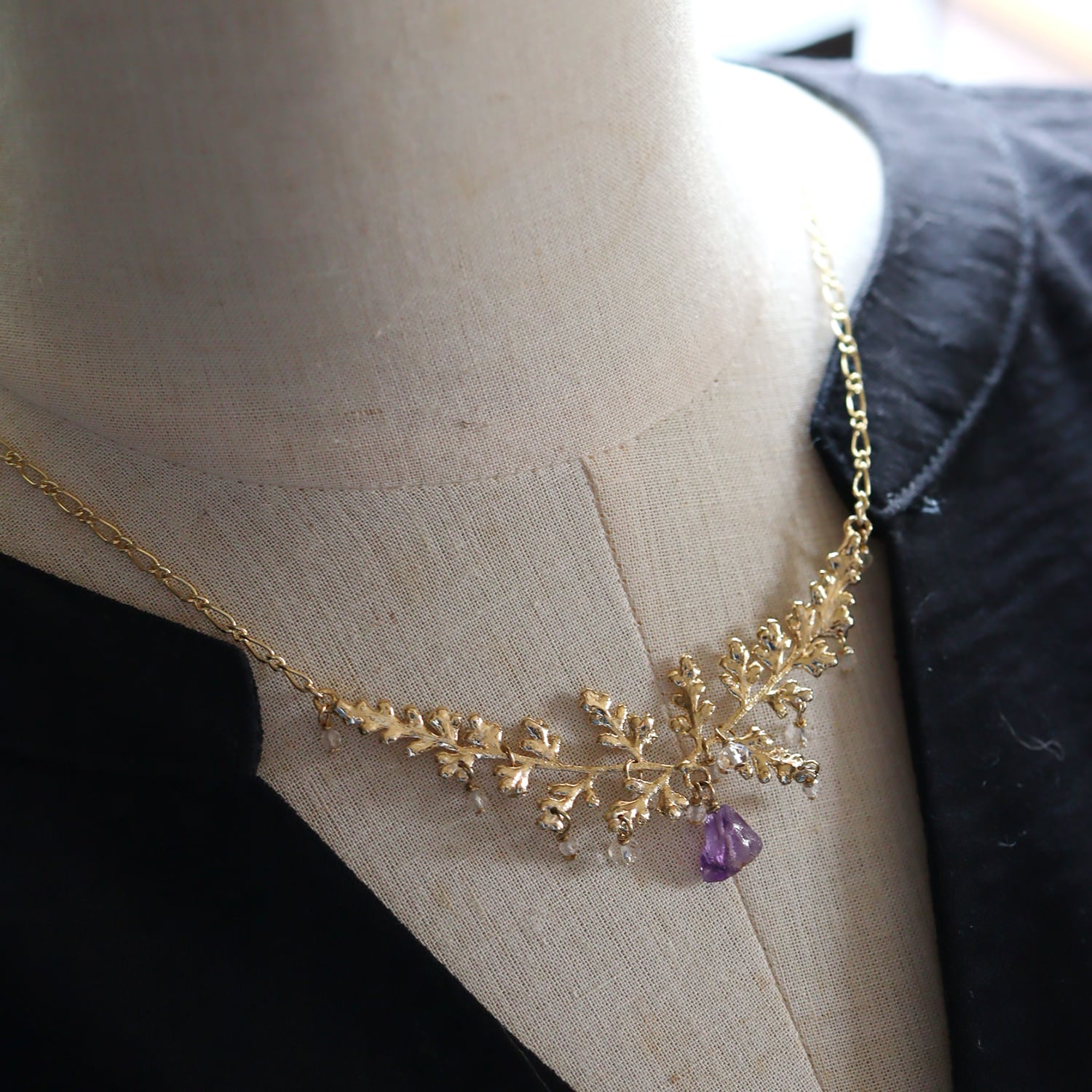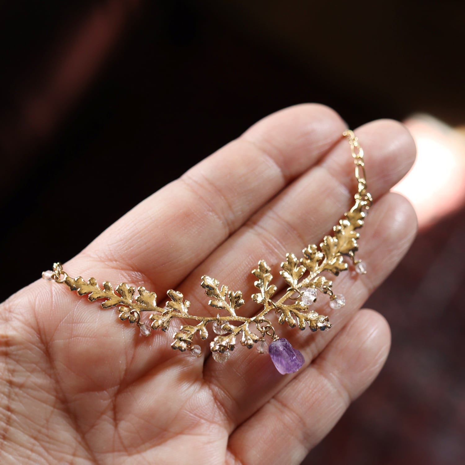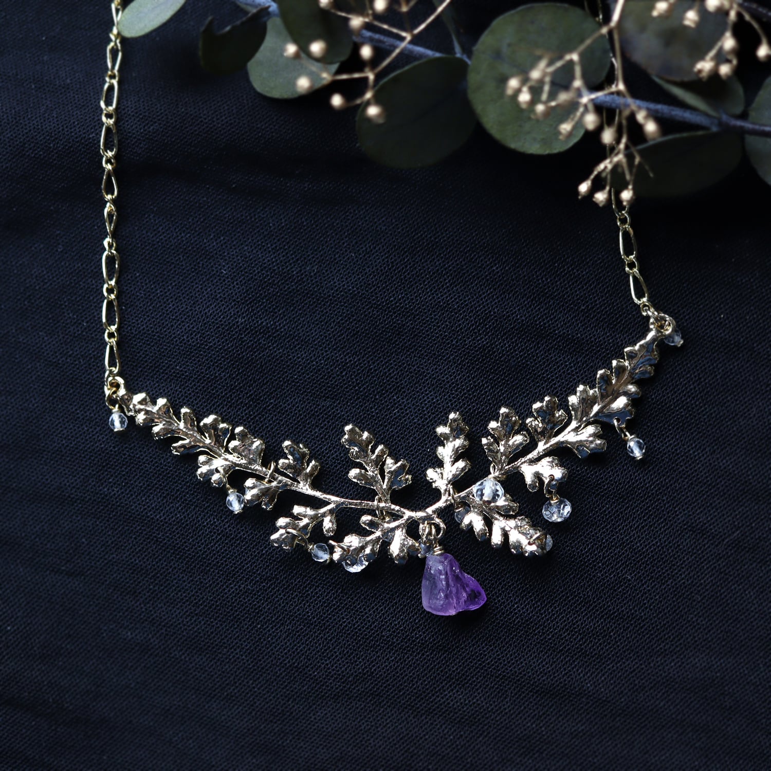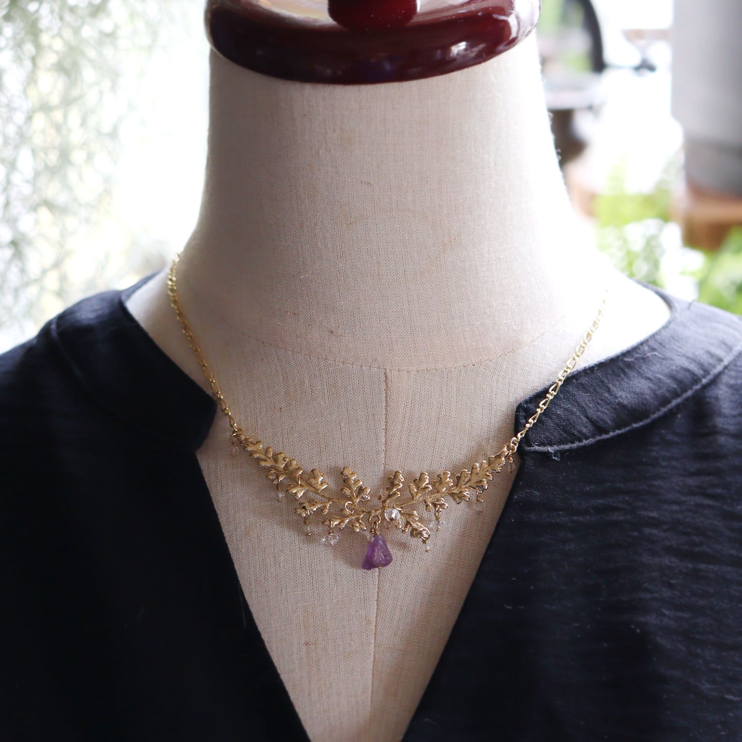 繊細な金の葉にアメジストが実り、クォーツが滴り揺れるネックレス。