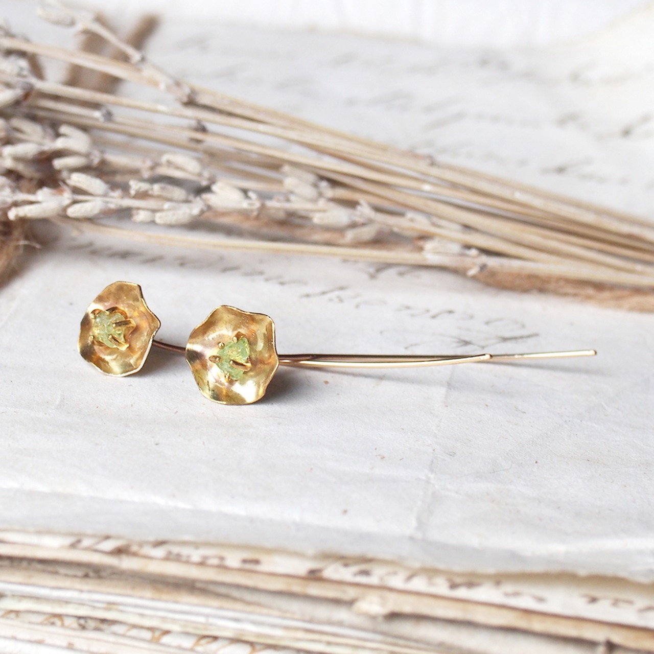 原石グリーンガーネットのお花ピアス(フック)
