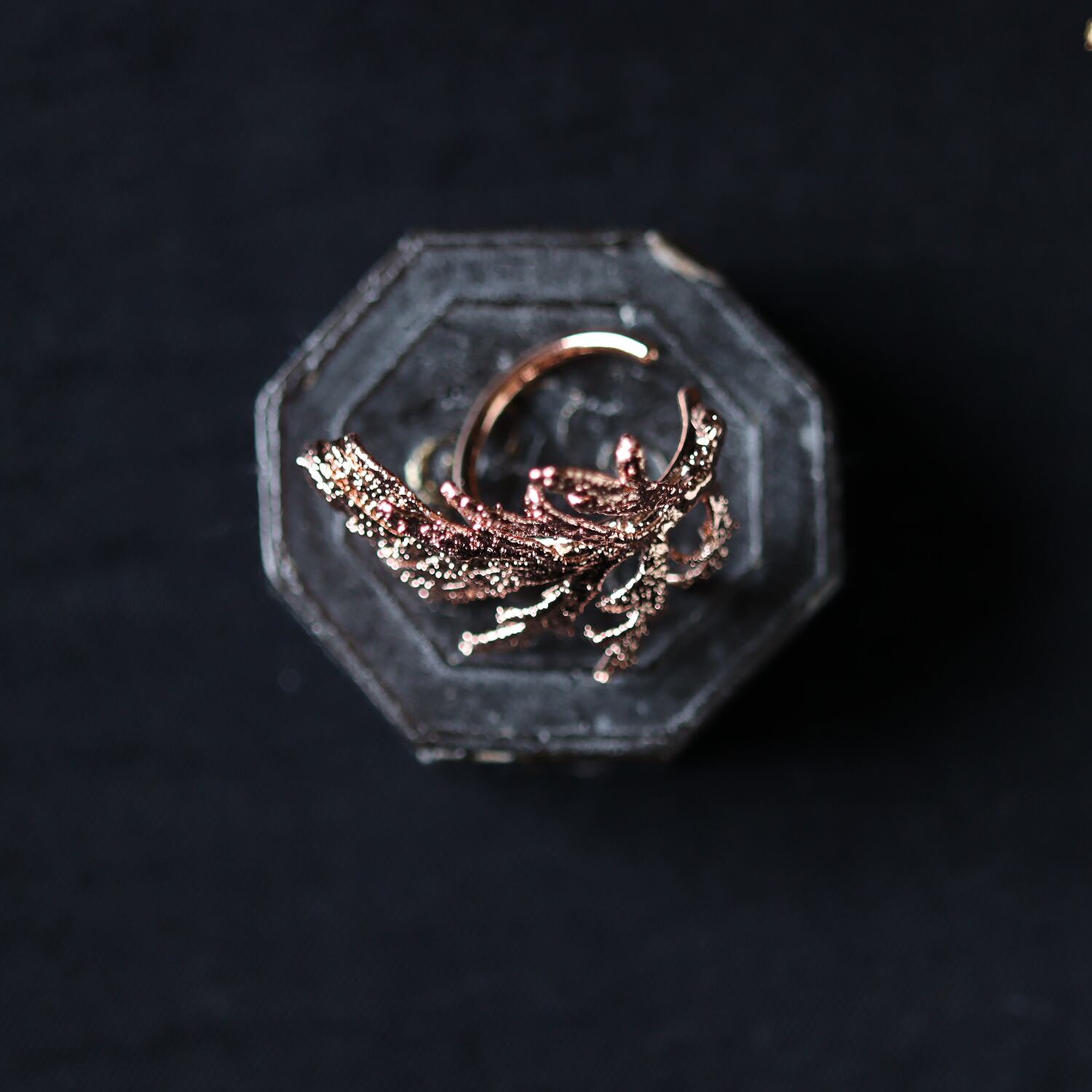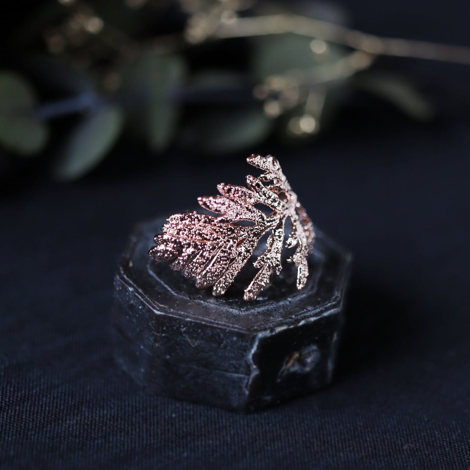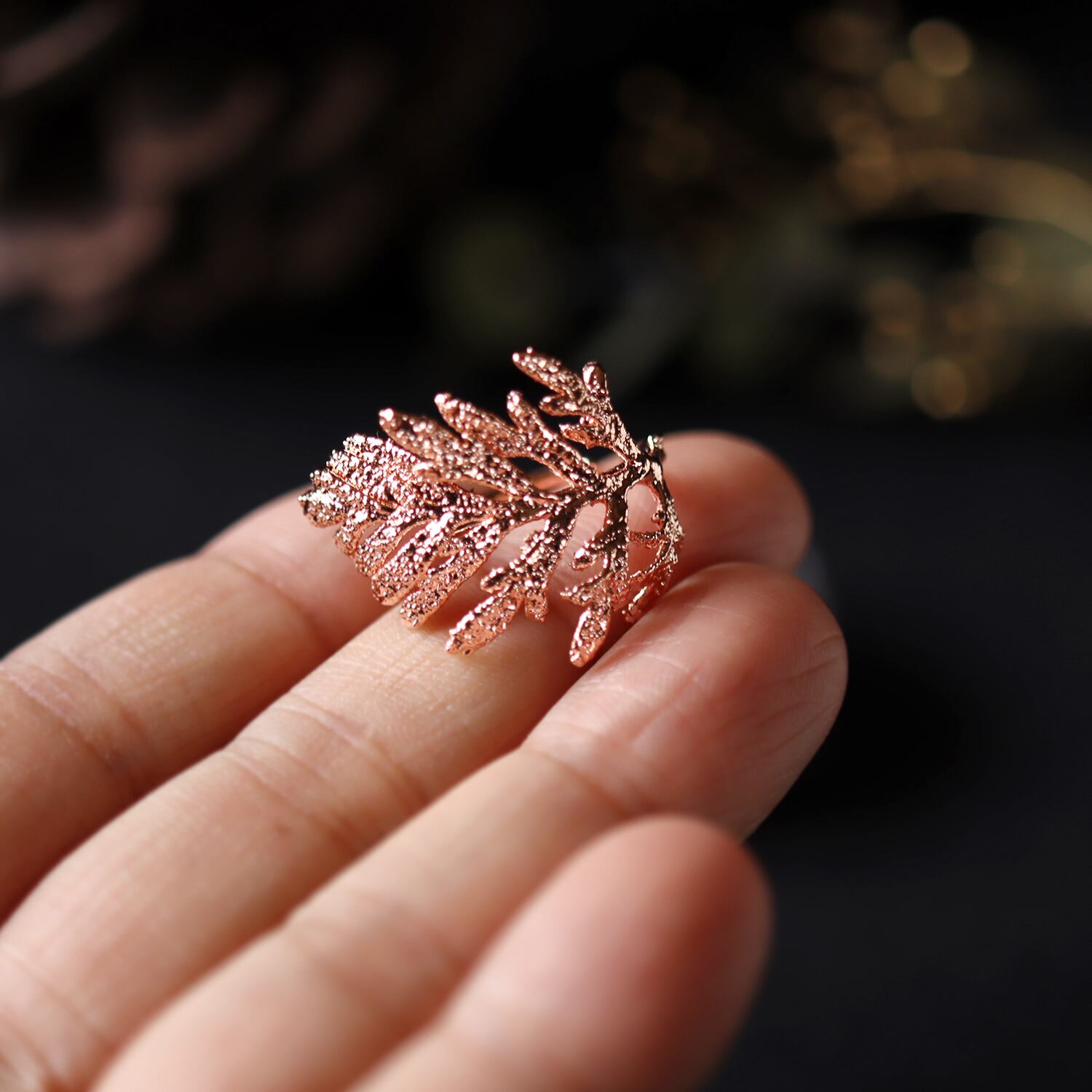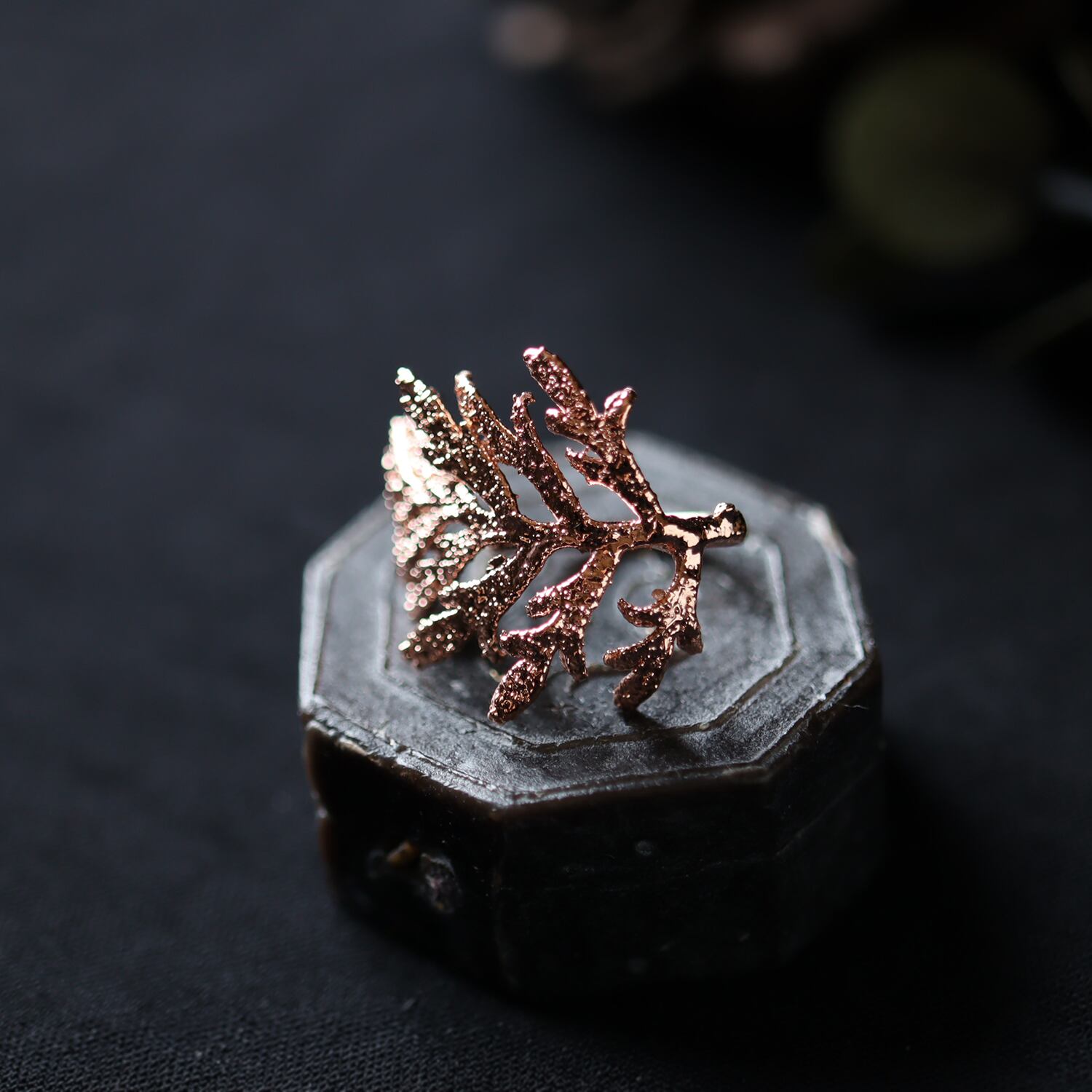 深い切れ込みが入った繊細なレースのような葉をそのまま銅化し、植物標本のような静かな存在感と、金属ならではの強度を両立させました。