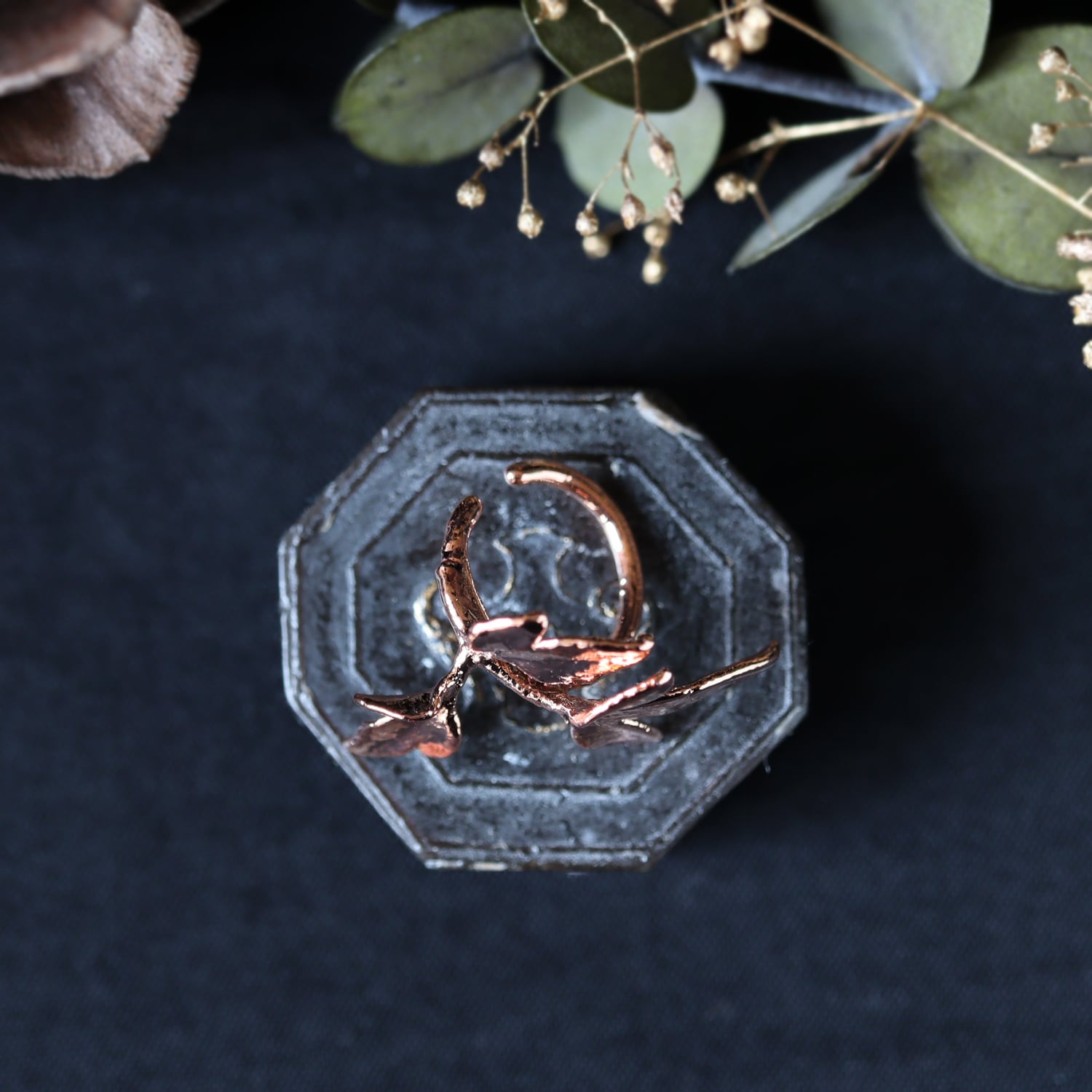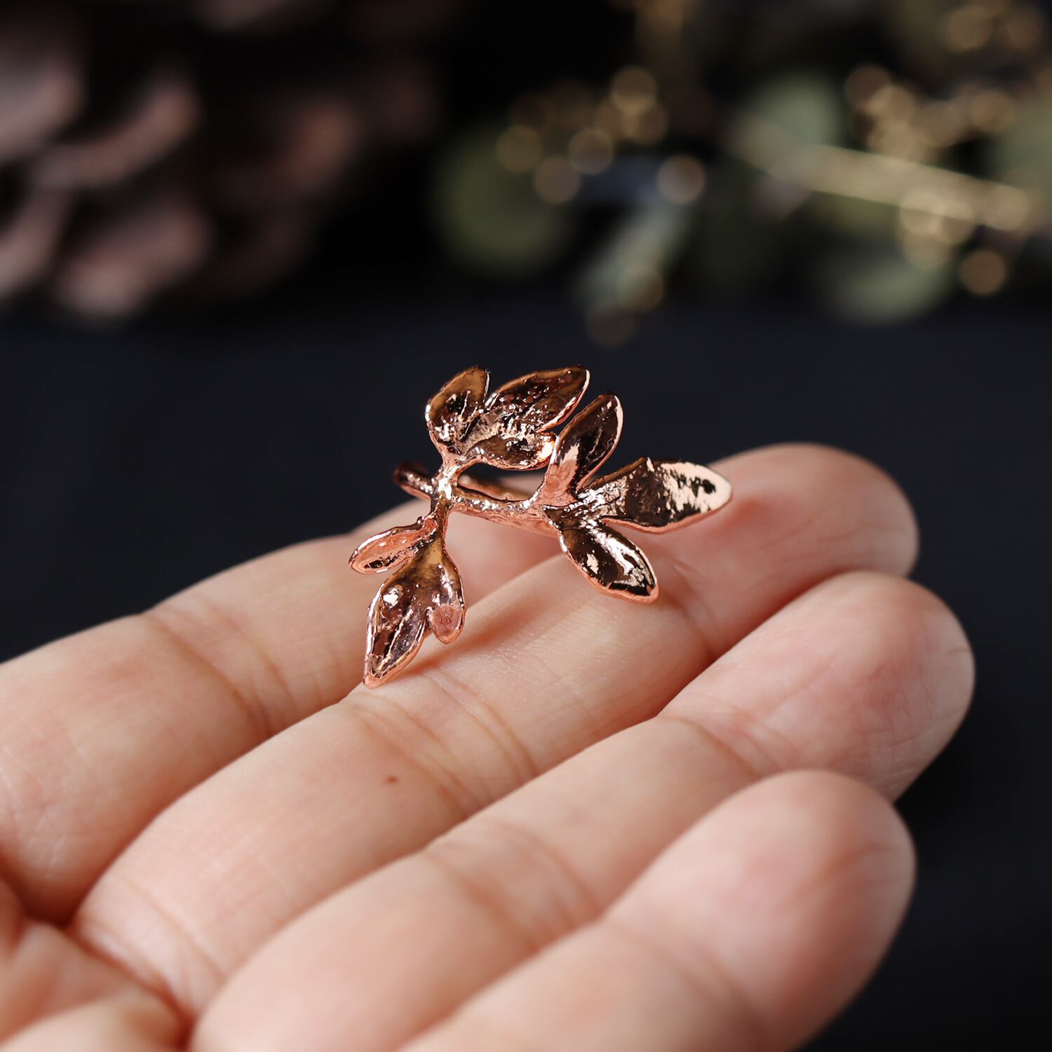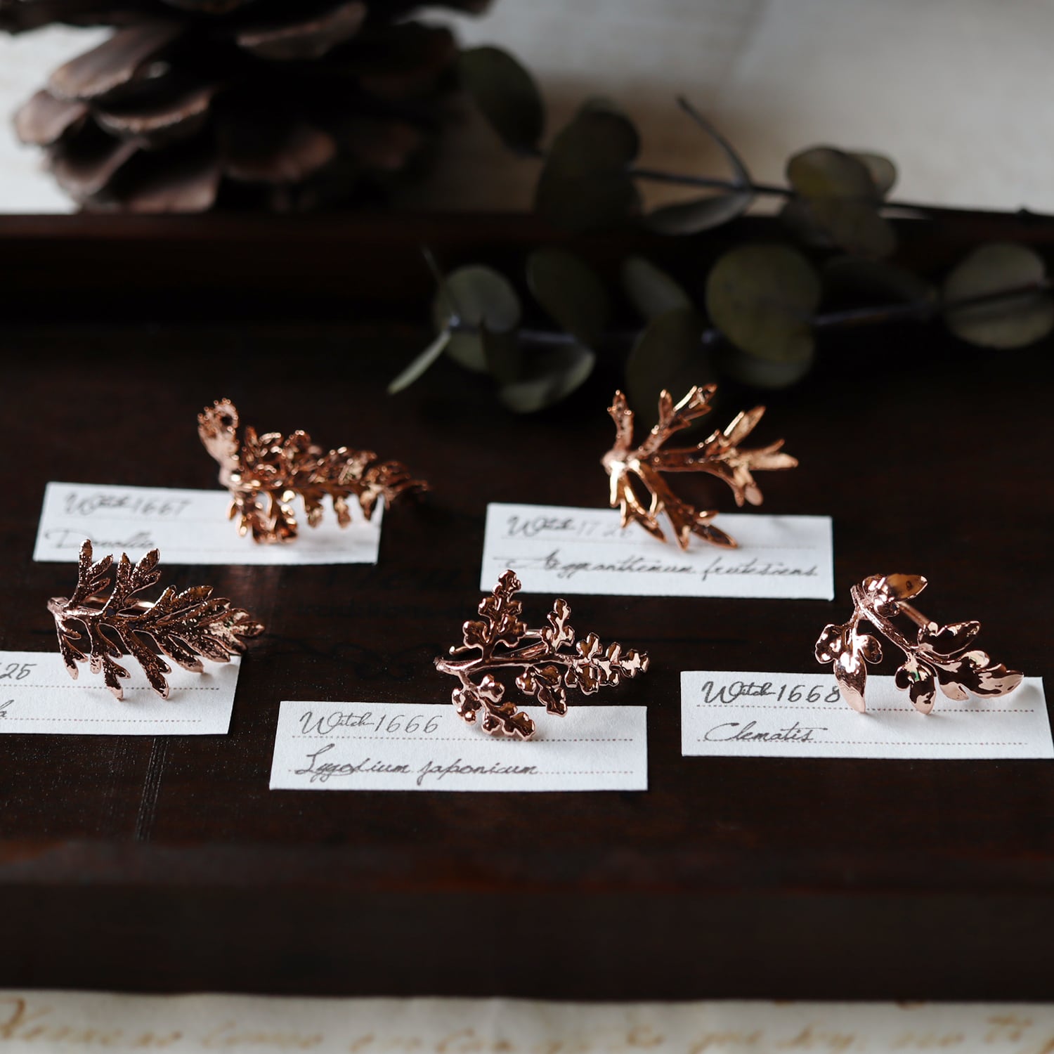 シャープで美しい形の葉をそのまま銅化し、植物標本のような静かな存在感と、金属ならではの強度を両立させました。