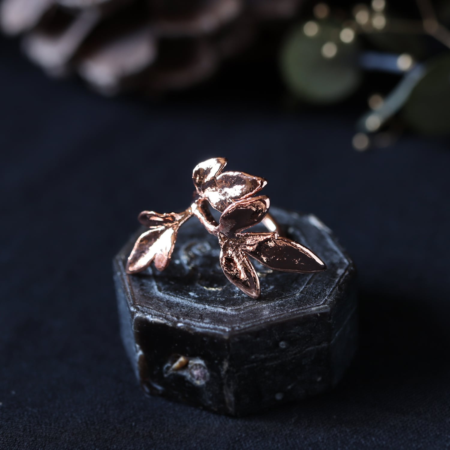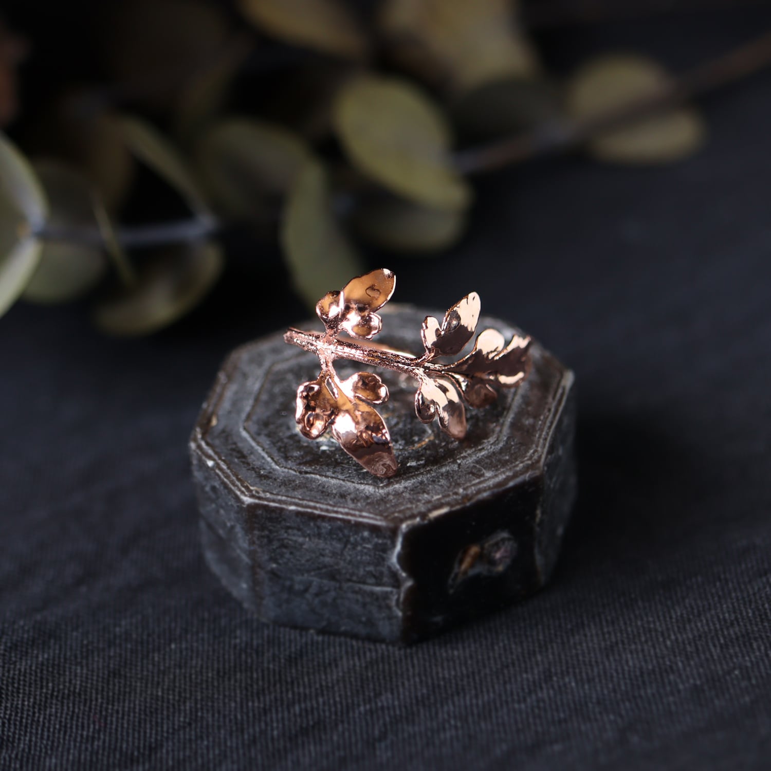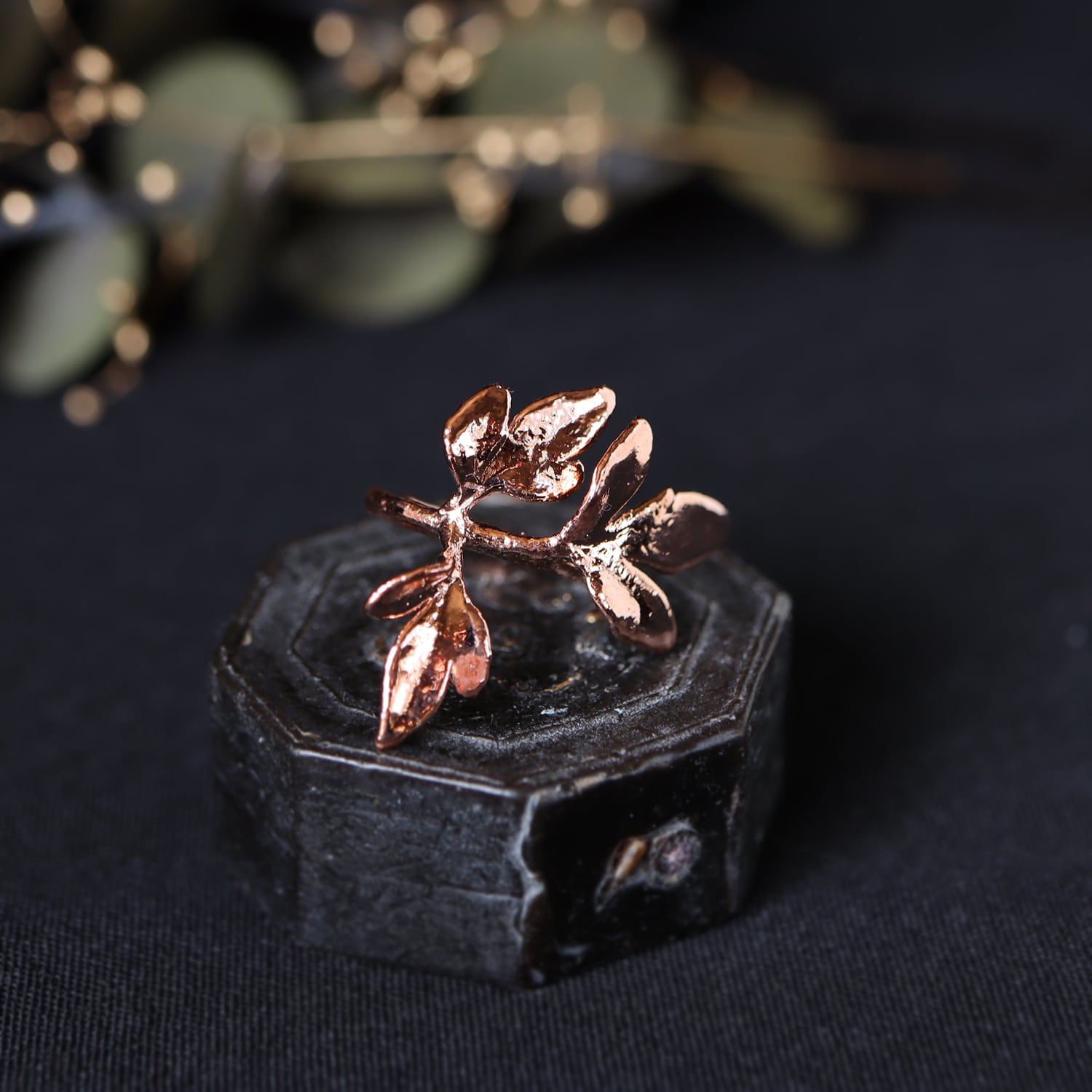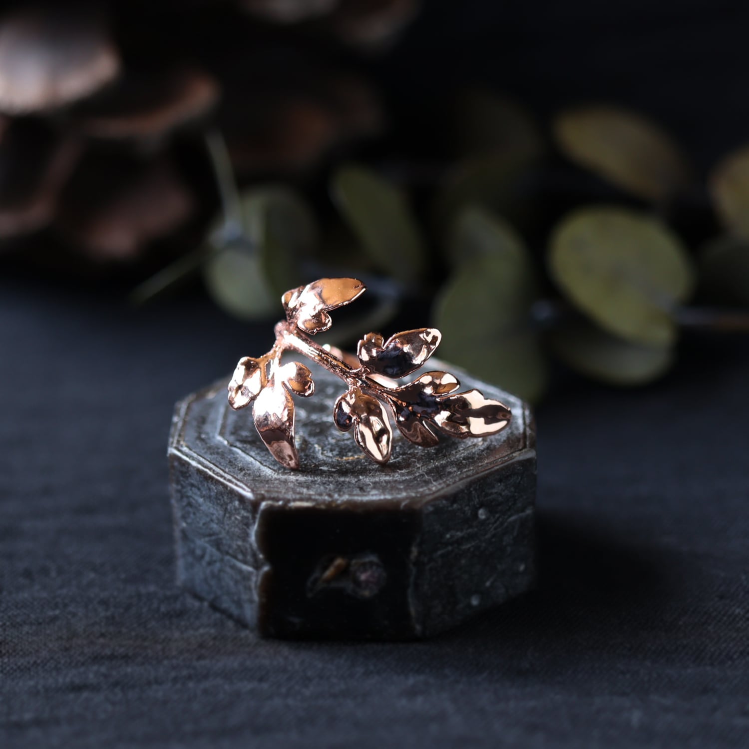 シャープで美しい形の葉をそのまま銅化し、植物標本のような静かな存在感と、金属ならではの強度を両立させました。