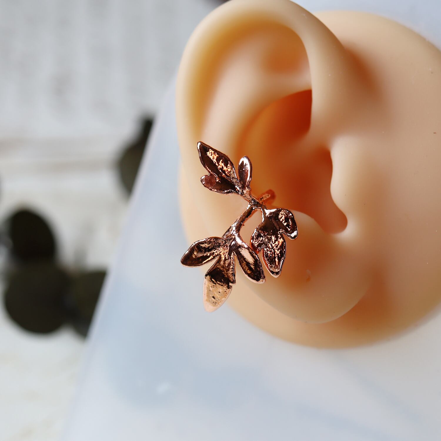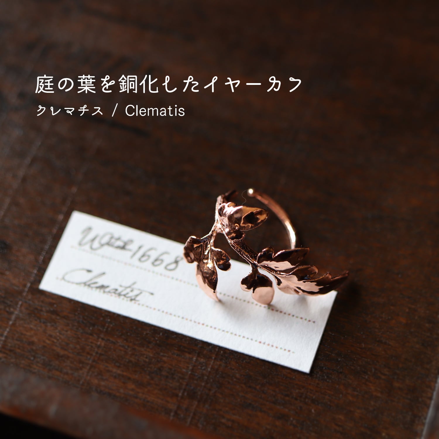 庭で採取した本物のクレマチスを、エレクトロフォーミング(電気メッキ)により銅で金属化したイヤーカフです。