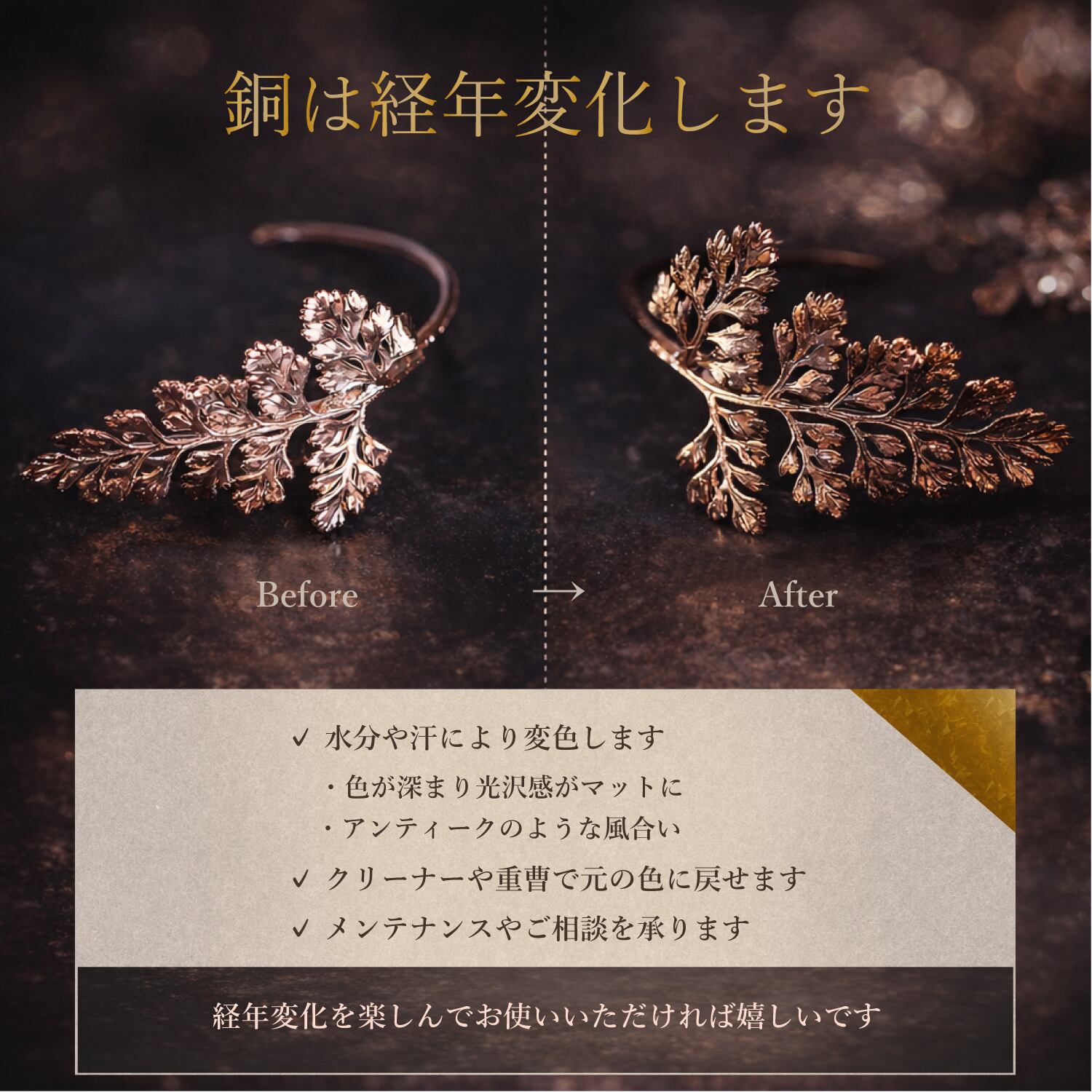 素材である銅は、時間の経過とともに深みのある色合いへと変化し、アンティークのような風合いをお楽しみいただけます。