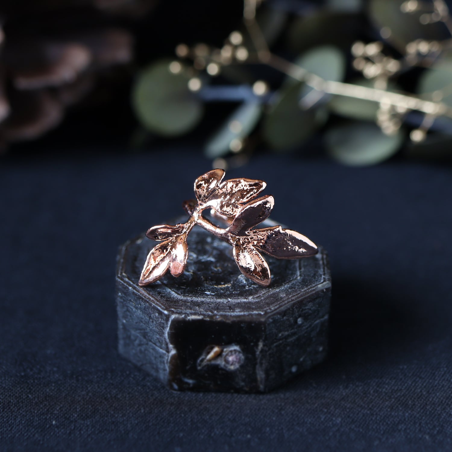 植物や鉱物など、金属ではないものの表面に電気メッキをかける技術。儚く枯れてしまう植物を金属に変えることでその時間と美しさを留めることができる、錬金術のような技法です。金属の層を厚くすることにより、強度も保たれます。