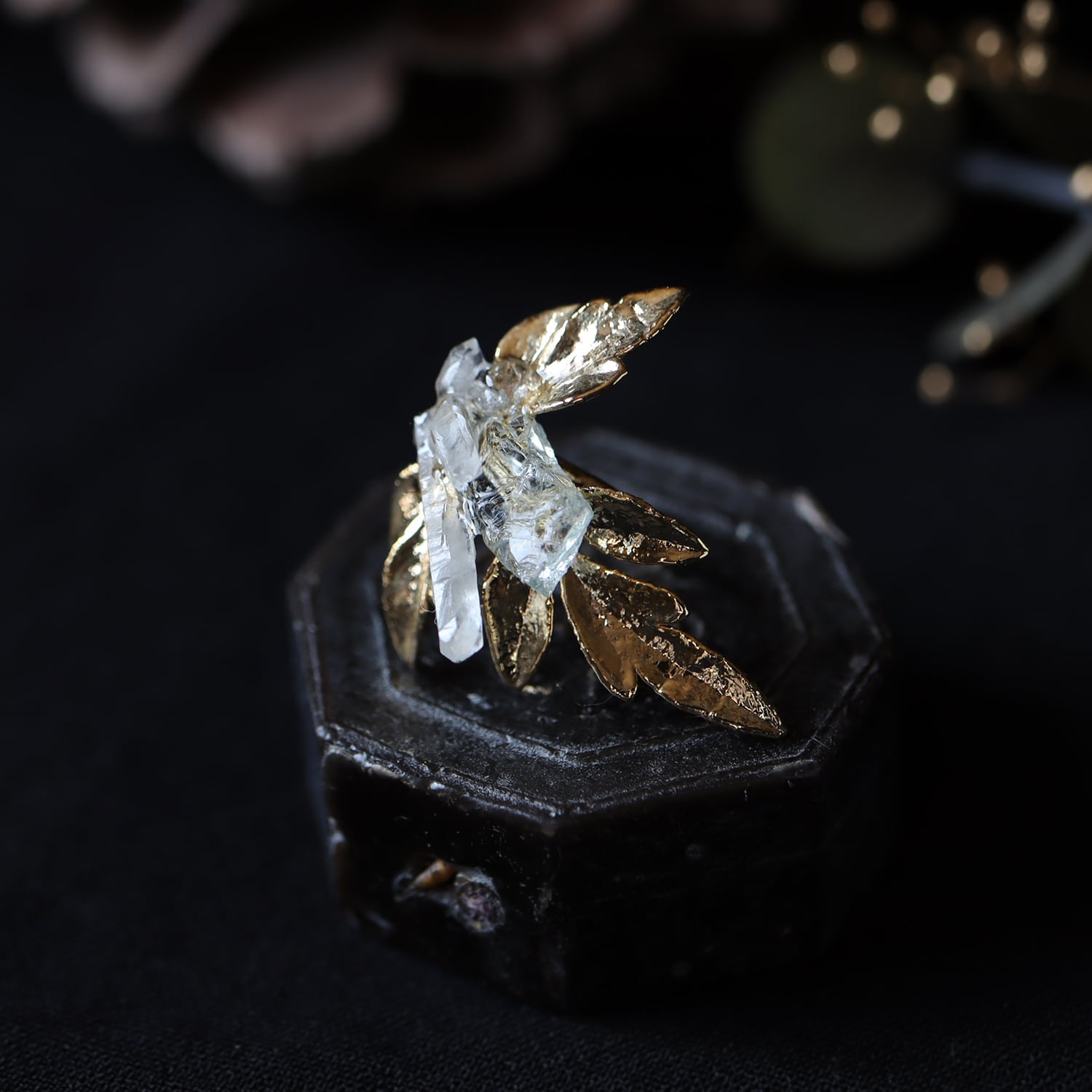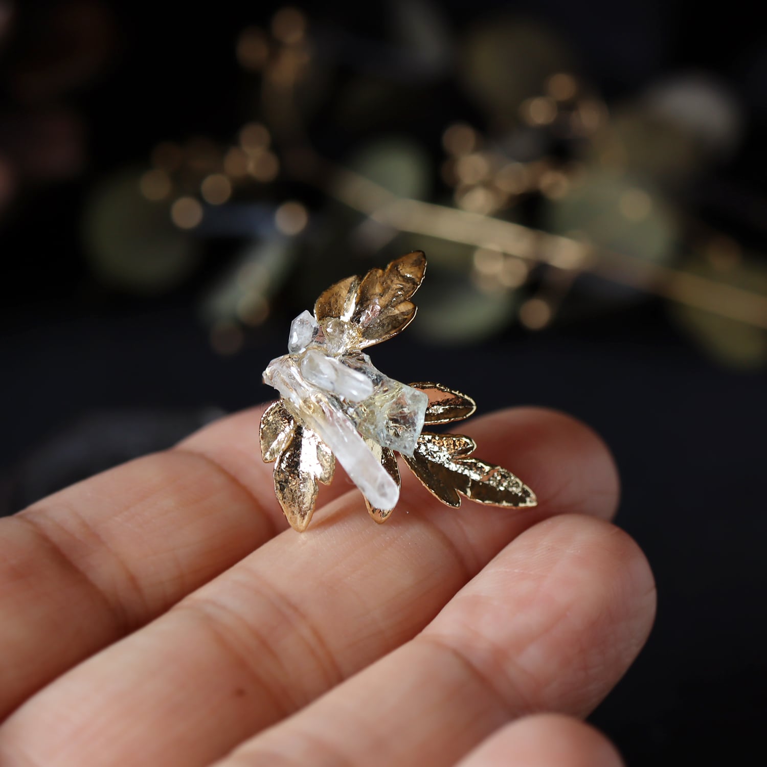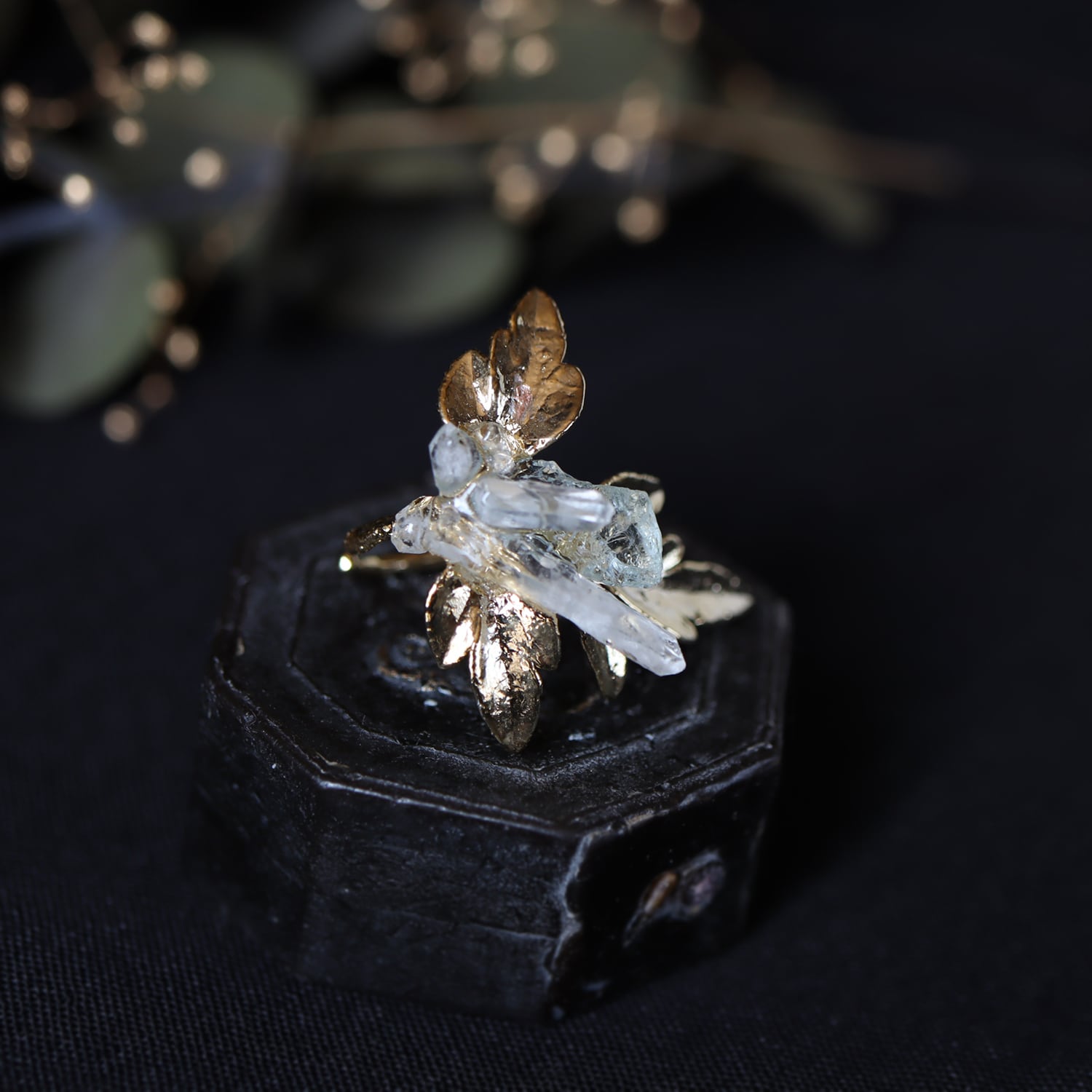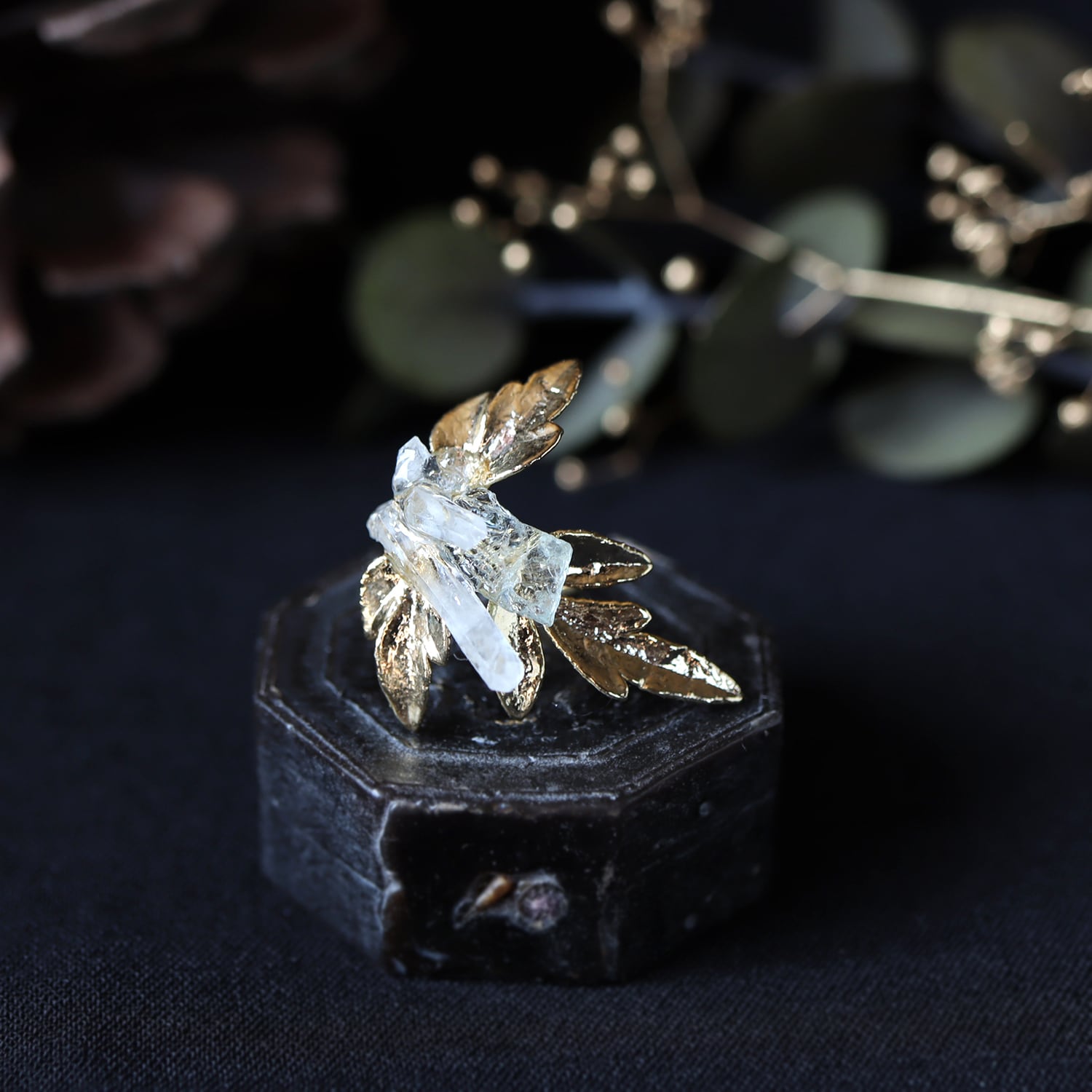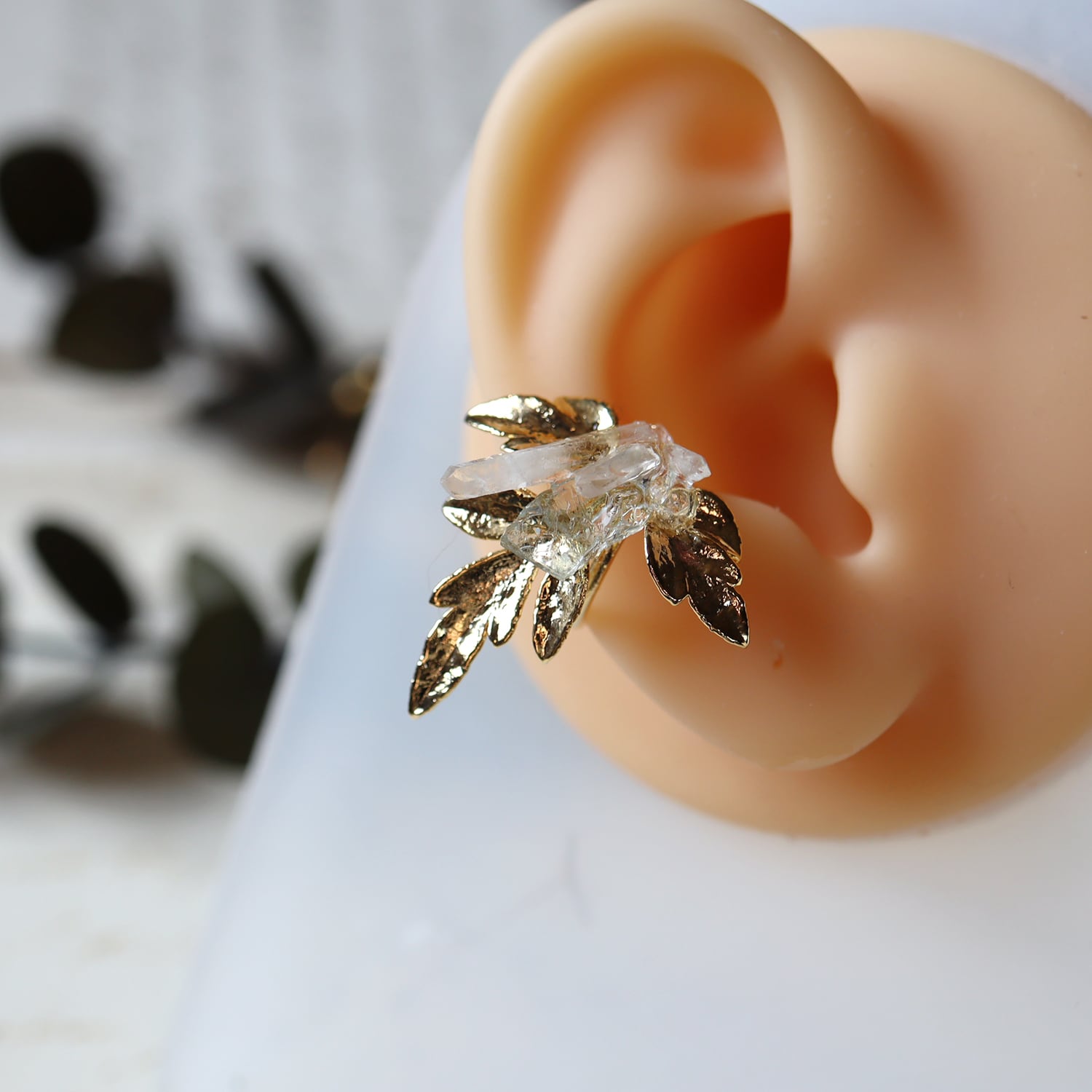 耳元で結晶と葉っぱが伸びていくような、軽やかなバランスのイヤーカフです。イヤーカフは耳たぶの凹凸に引っ掛けるようにして装着するため、痛くなりにくく着け心地の良いデザイン。