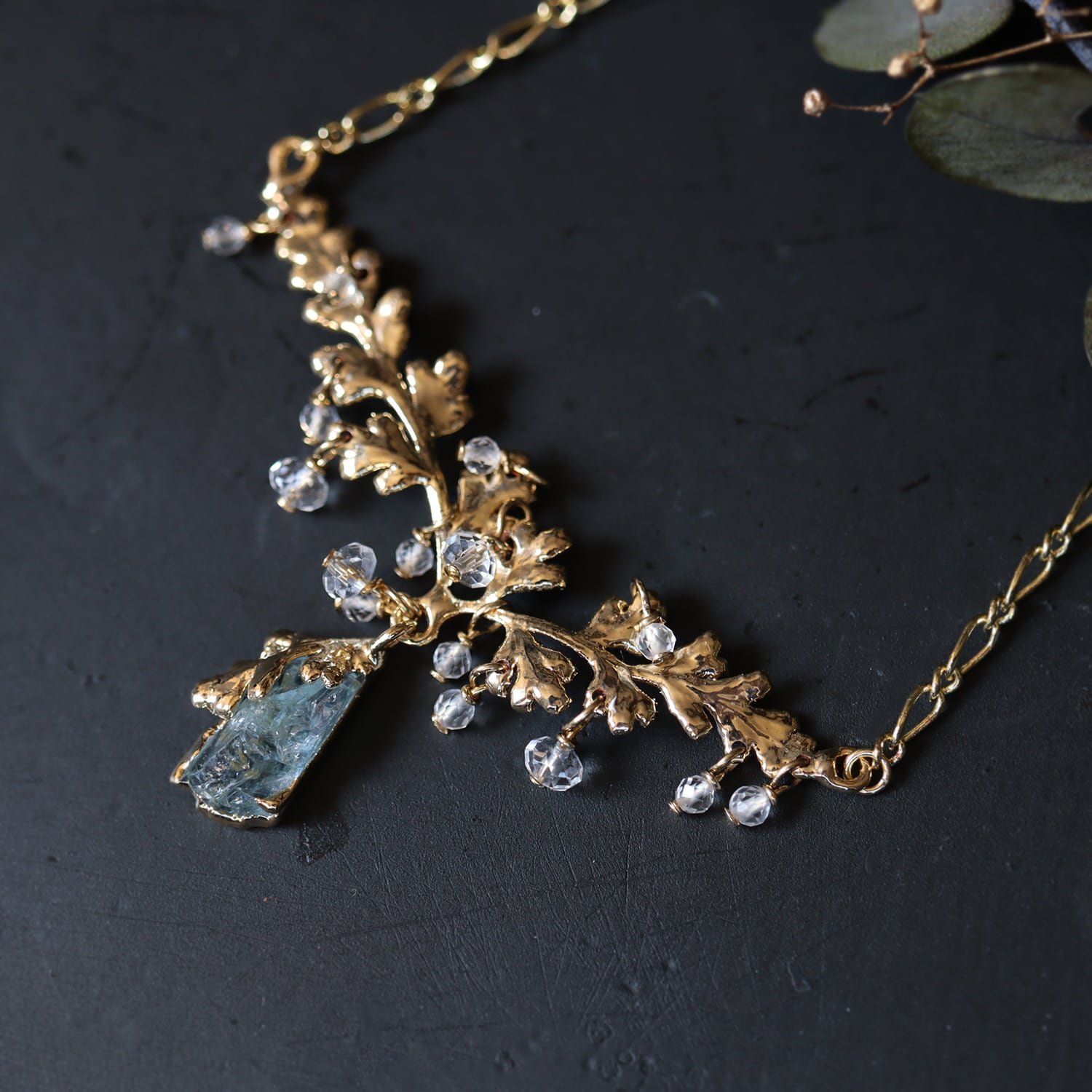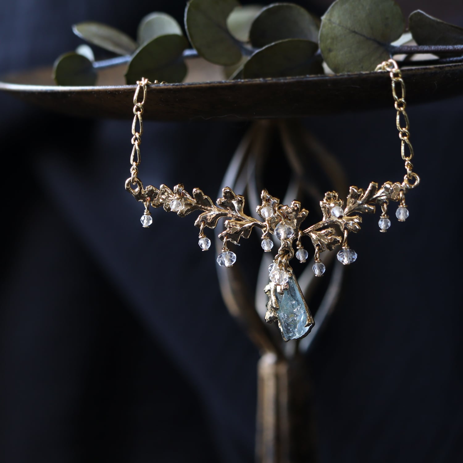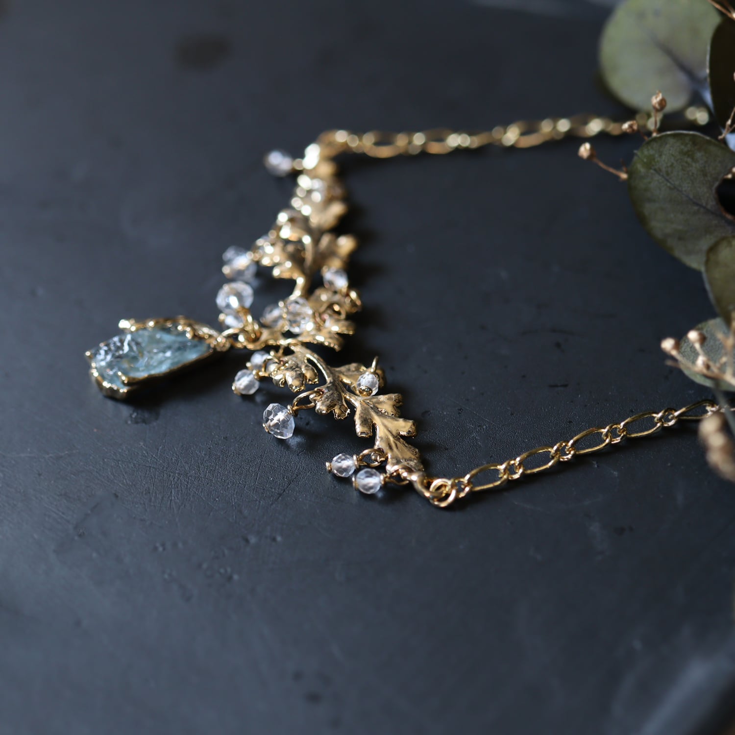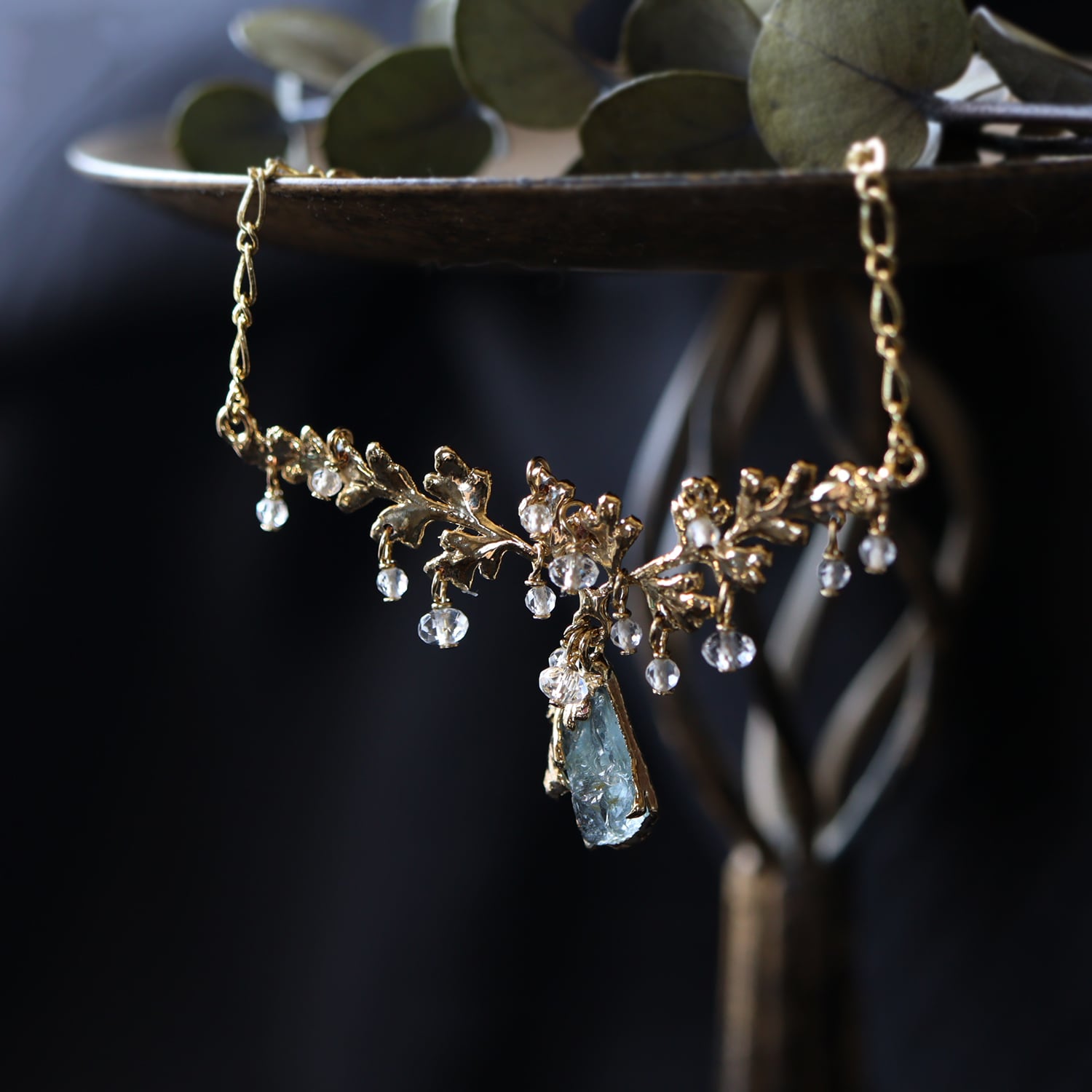 繊細な金の葉にアクアマリンが実り、クォーツが滴り揺れるネックレス。