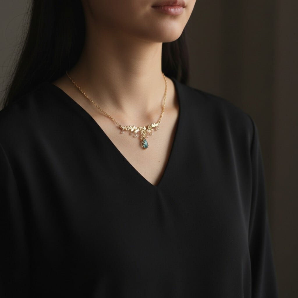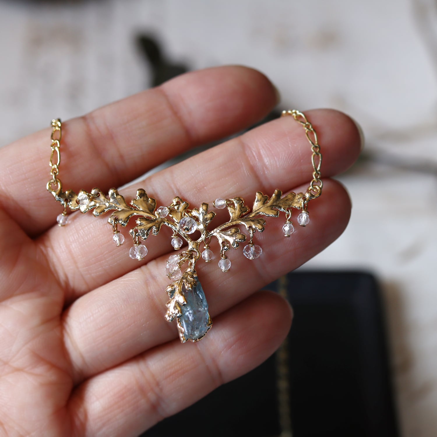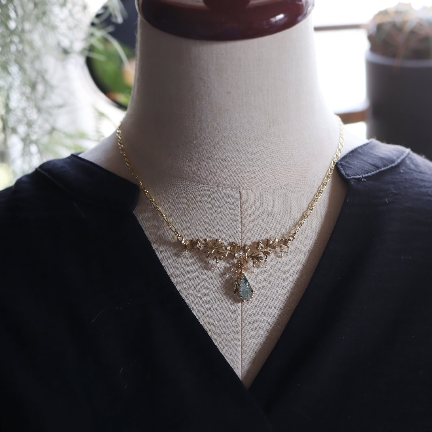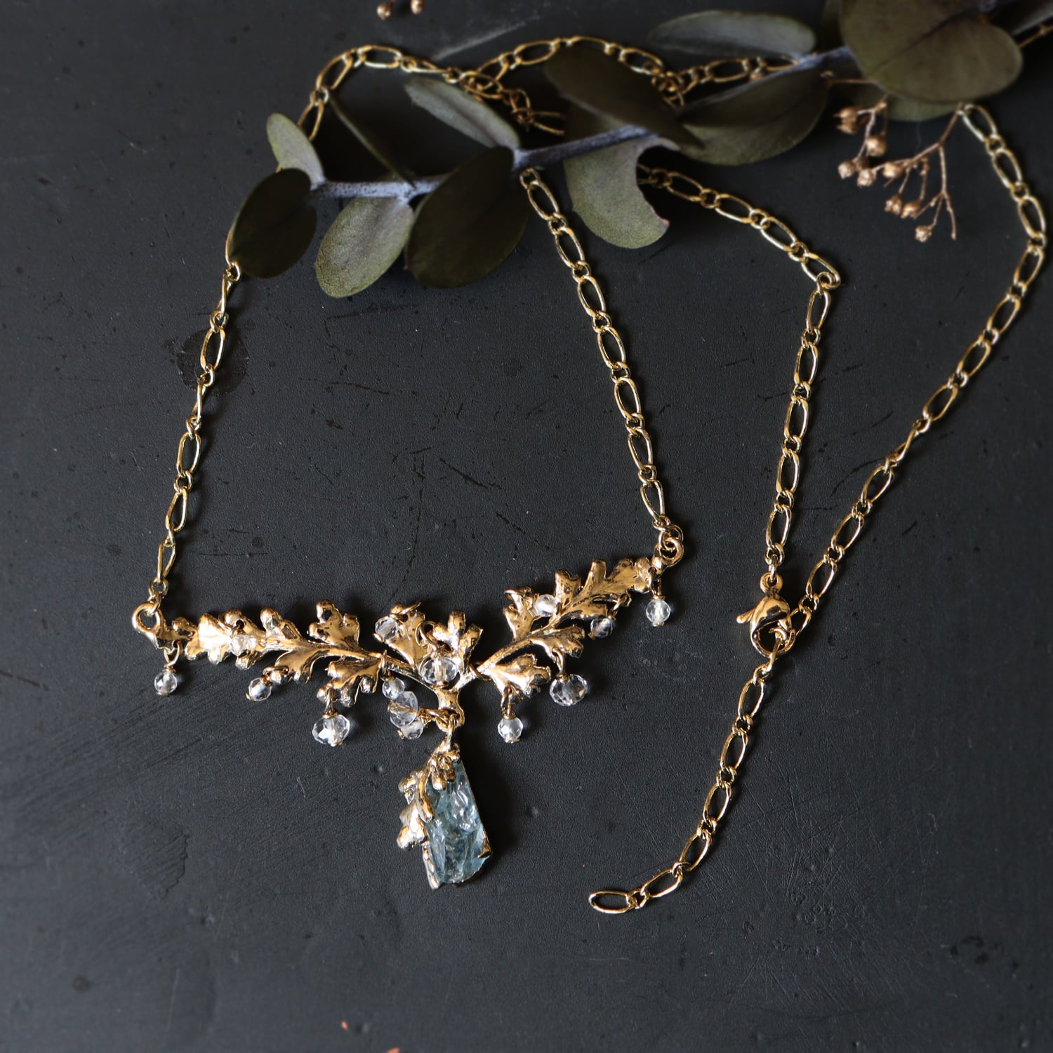 繊細な金の葉にアクアマリンが実り、クォーツが滴り揺れるネックレス。