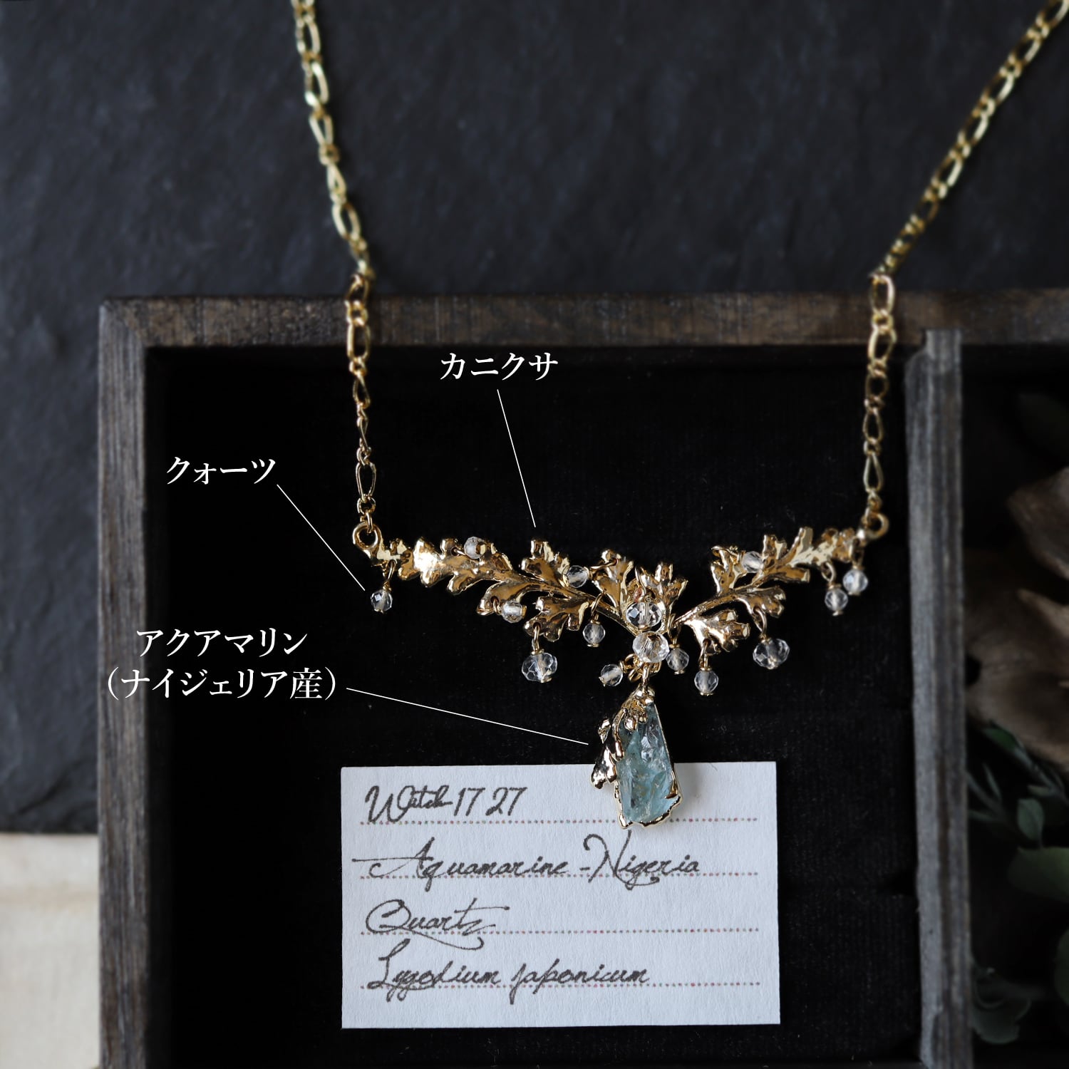 素材:アクアマリン(ナイジェリア産)・クォーツ・カニクサ(銅/K14ゴールドメッキ)・ゴールドプレート(ネックレス)