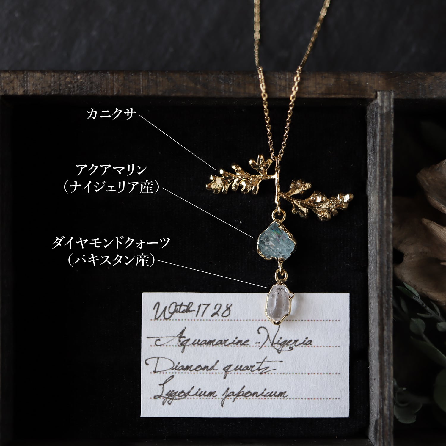 素材:アクアマリン(ナイジェリア産)・ダイヤモンドクォーツ(パキスタン産)・カニクサ(銅/K14ゴールドメッキ)・ゴールドプレート(ネックレス)